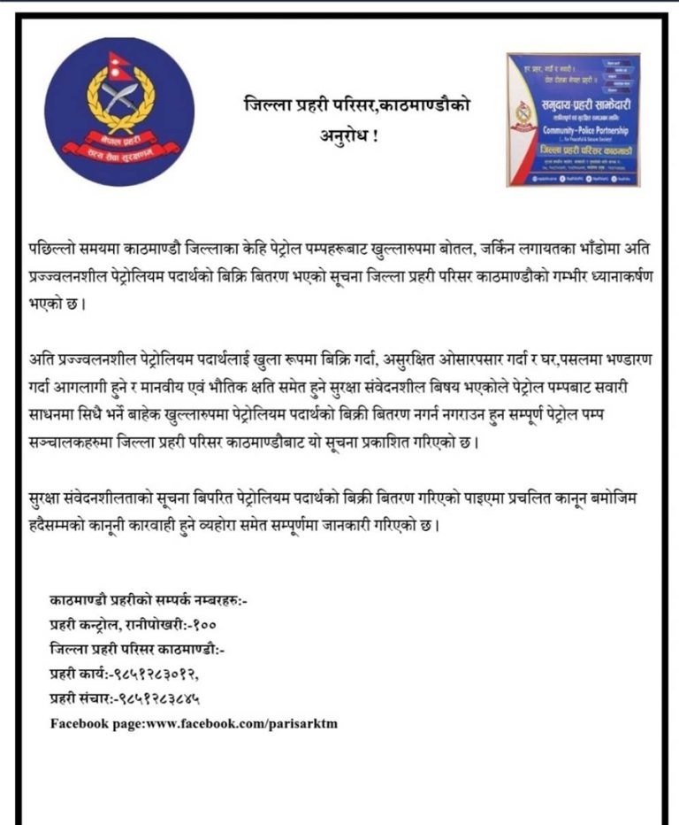यस्ता घटना बढिरहेका बेला प्रहरीले सार्वजनिक सूचना जारी गर्दै पेट्रोल पम्पहरूबाट खुल्ला रूपमा बोतल, जर्किनलगायतका भाँडोमा पेट्रोलियम पदार्थको बिक्री वितरण भएकोबारे ध्यानाकर्षण भएको बताएको हो ।