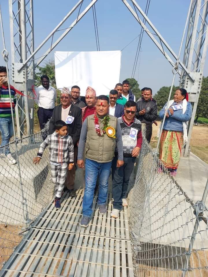 कैलाली । कैलाली जिल्लाको बर्दगोरिया गाउँपालिका वडा नम्बर ३ र ४ स्थित बुटकौवा र नौनियाँ सीमानामा रहेको काँडा खोलामा नवनिर्मित झोलुङ्गे पुलको बिहीबार उद्घाटन गरिएको छ । कुल १ सय ५.४० मी लम्बाइ रहेको छ भने चौडाइ १ मिटर २० सेन्टी रहेको झोलुङ्गे पुल विधिवत् रुपमा उद्घाटन गरिएको छ । ११८७ घरधुरी रहेको रानीकुण्डा, खैरेनी र बुटकौवा वडा नं ३ मा अन्य वडाका गाउँ र बजार जोड्ने पुल नहुँदा बर्खायाममा स्थानीय तथा विद्यार्थीलाई निकै समस्या थियो । पुल निर्माण भएपछि सम्पूर्णमा खुसियाली छाएको छ । विशेषगरी विद्यालय जाने आउने विद्यार्थीलाई झोलुङ्गे पुल नहुँदा समयमै विद्यालय आवतजावतमा निकै समस्या परेको थियो । एकसयभन्दा बढी विद्यार्थीले साइकल खोला पारि नै राख्ने गरेका थिए । पुल निर्माण भएपछि स–साना बालबालिकालाई पनि विद्यालय आउन/