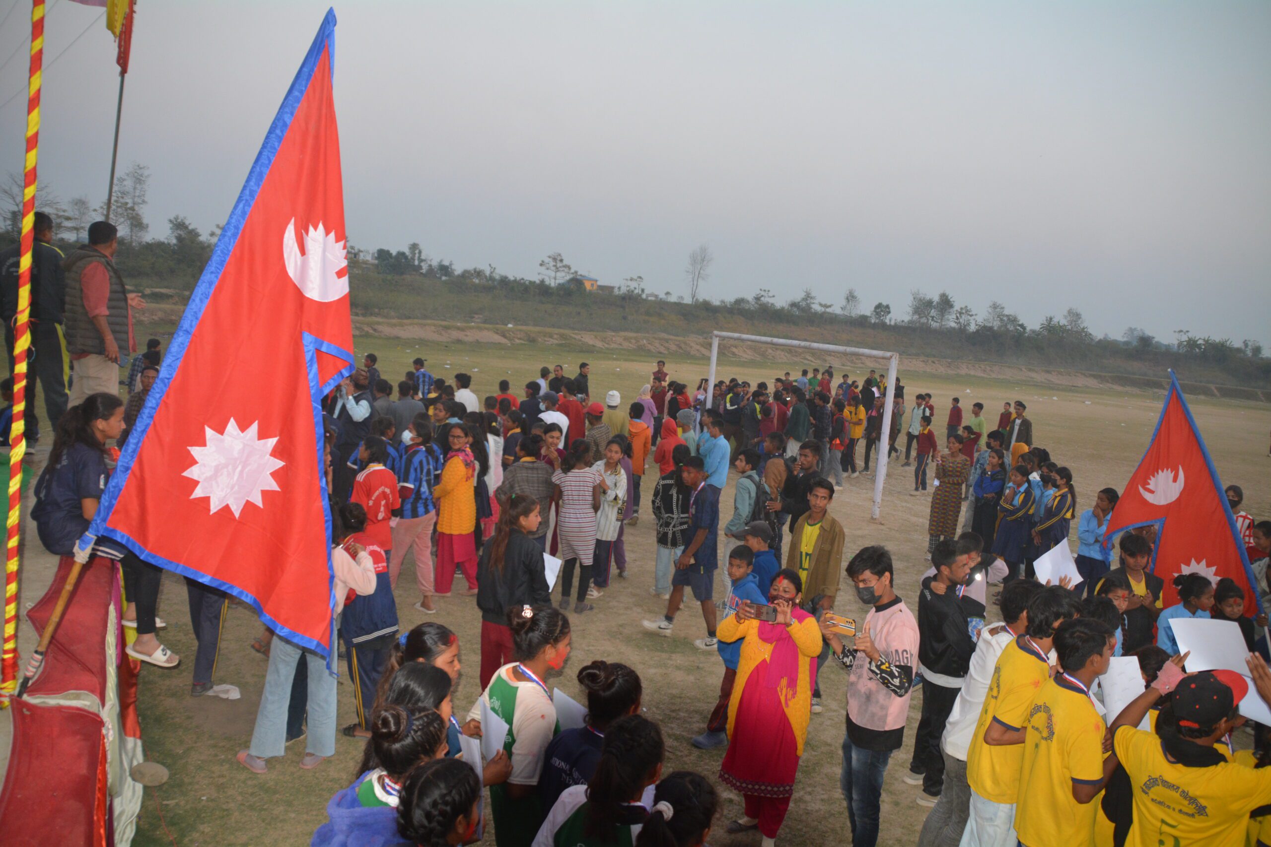 कैलाली । कैलालीको बर्दगोरिया गाउँपालिकामा गत मङ्गलवारबाट सुरु भएको पालिका स्तरीय राष्ट्रपति रनिङ्ग शिल्ड प्रतियोगिता सम्पन्न भएको छ । प्रतियोगितामा कक्षा ६ देखी १२ सम्मका १३ विद्यालयले भाग लिएका थिए । प्रतियोगिताका अधिकांश खेल विद्यालाई वसन्त मुरारी माध्यमिक विद्यालयले कब्जा गरेको छ । १० स्वर्ण, ७ रजत र २ कास्य सहित वसन्त मुरारी प्रथम हुँदा ५ स्वर्ण र ३ कास्य सहित नोबेल एकेडेमी दोस्रो बनेको छ । यस्तै ३ स्वर्ण, ८ रजत र २ कास्य सहित कालिका मा.वि. नौनिया तृतीय बनेको छ । प्रतियोगितामा मा.वि. कोटातुल्सीपुरले ३ स्वर्ण, ४ रजत र ७ कास्य हात पारेको छ । जगदम्बिके भगवती मा.वि. खैरेनीले ३ स्वर्ण, ४ रजत र ४ कास्य, महुन्याल मा.वि. बासकोटीले ३ स्वर्ण, २ रजत र ४ कास्य, बालकन्या मा.वि. कट्टीपुरले २ स्वर्ण, २ रजत र ७ कास्य र न्यु वालवाटीका मा.वि. बौनियाँले १ स्वर्ण, २ रजत र ३ कास्य हात पारेको छ । यस्तै द सनराईज मा.वि.बौनियाँले २ रजत र १ कास्य, आदर्श सामुदायिक मा.वि.ले १ कास्य, र माइकी मिडियमले १ कास्य प्राप्त गरेका छन् । प्रतियोगितामा १ सय, २ सय, ४ सय, ८ सय, १ हजार ५ सय र ३ हजार मिटर दौड, कबड्डी, १ सय मिटर र ४ सय मिटर रिले, भलिबल, हाई जम्प, लङ्ग जम्प, सट फुट, त्रिपल जम्प र ज्याइबलिन थ्रो गरी १५ विद्यामा खेल खेलाइएको थियो । जिल्ला स्तरमा हुने राष्ट्रपति रनिङ्ग शिल्डलाई मध्यनजर गरी सञ्चालन गरिएको यस प्रतियोगिताबाट खेलाडी तथा टिम समेट छनौट भएका छन् । हरेक खेल विद्याका प्रथम र द्धितिय हुने टिम तथा खेलाडी जिल्ला स्तरको प्रतियोगितामा सहभागी हुने छन् । यस अघि २०७६ मा जिल्ला स्तरमा भएको प्रतियोगितामा वसन्त मुरारी मा.वि.ले कबड्डी विद्यामा उपाधि हात पारेको थियो ।