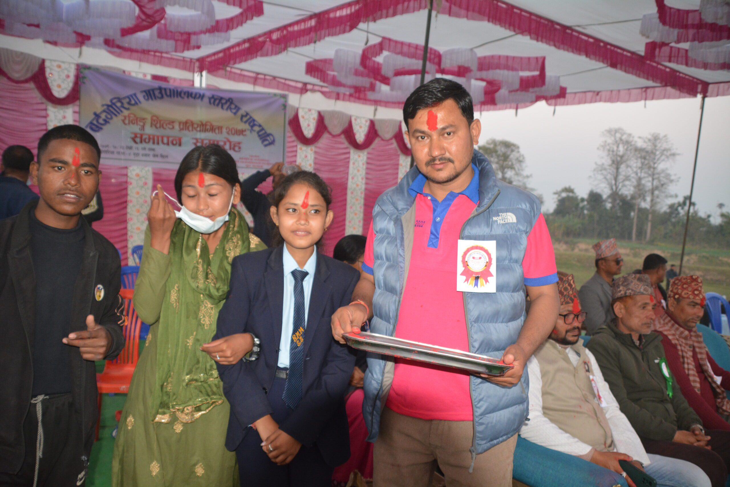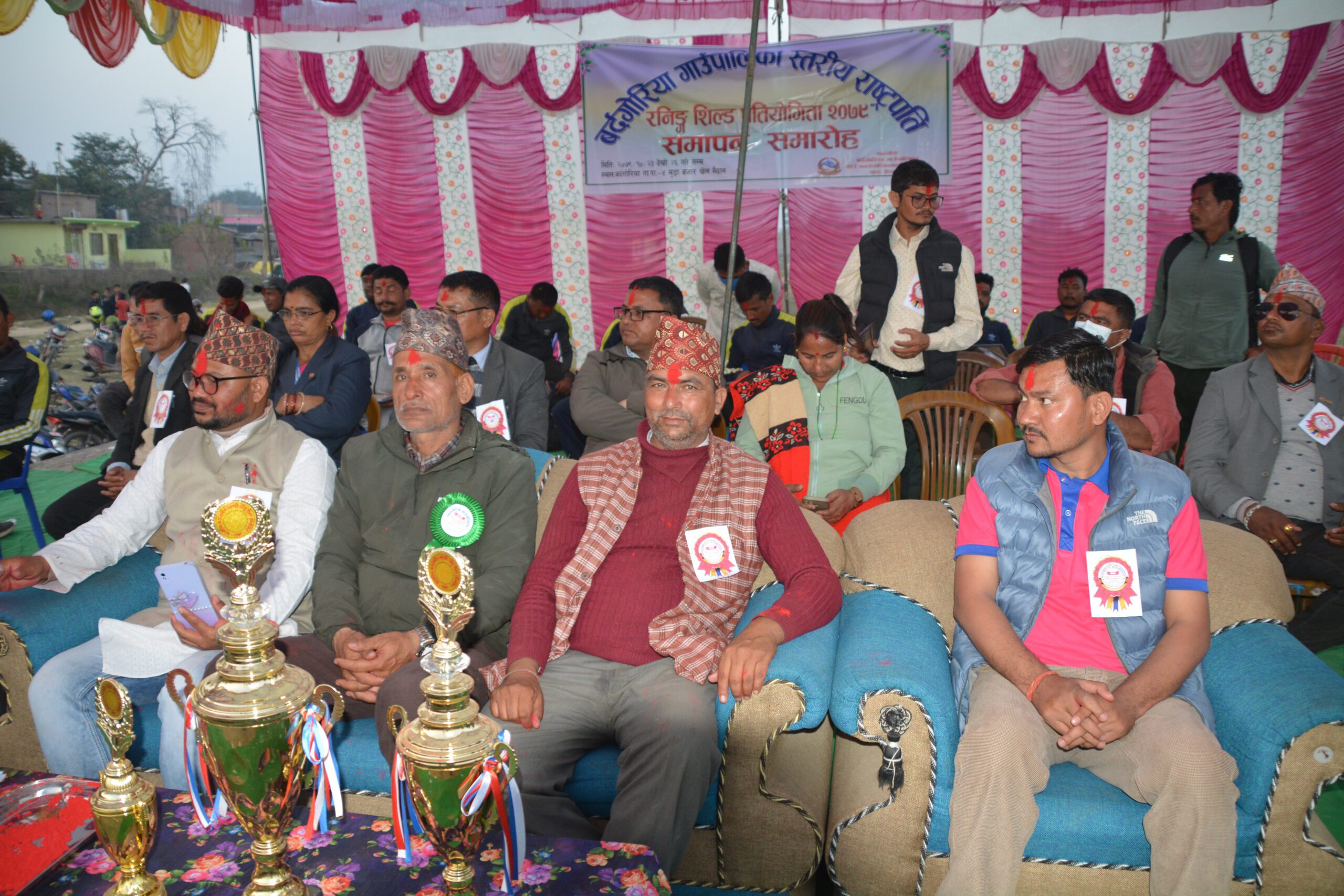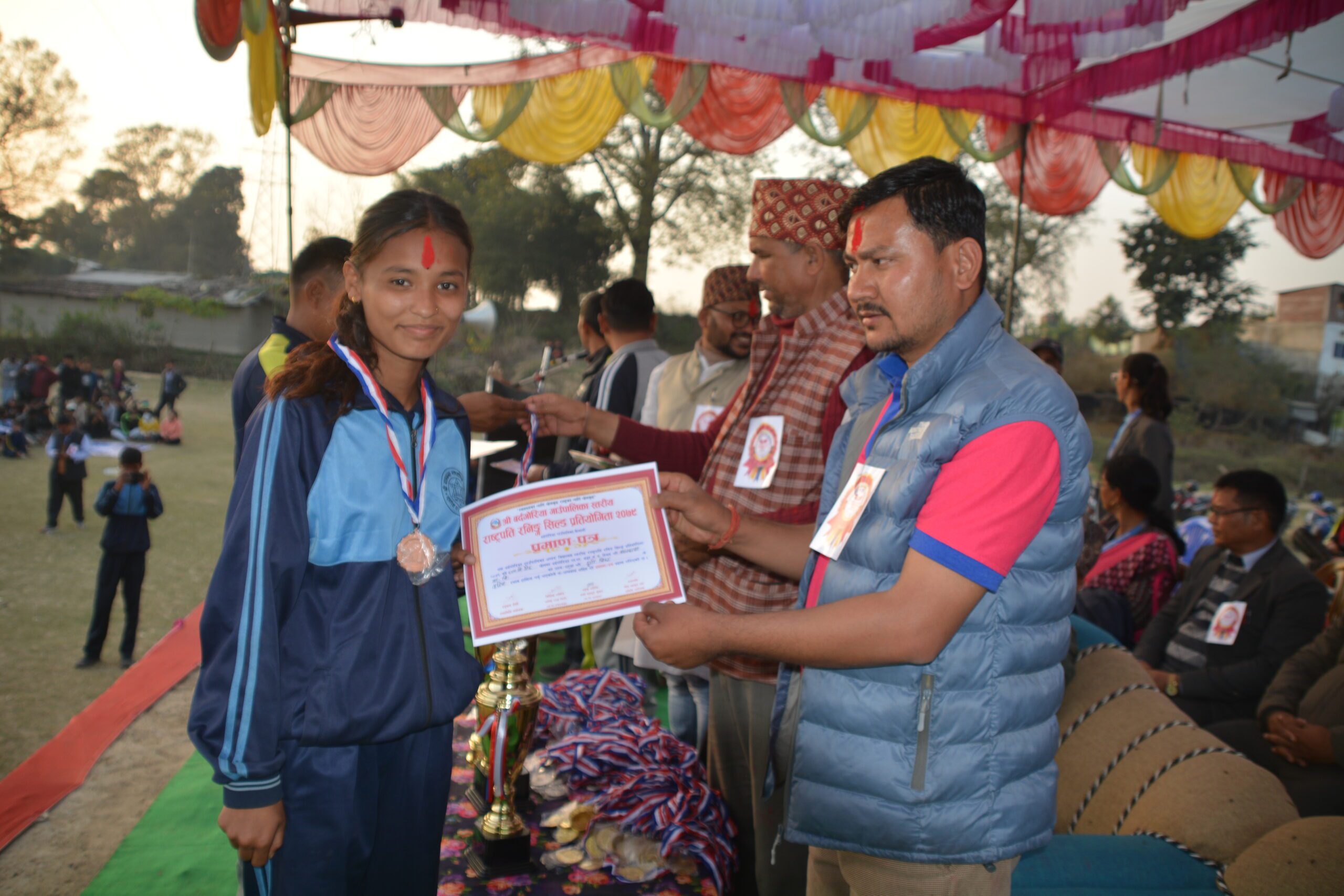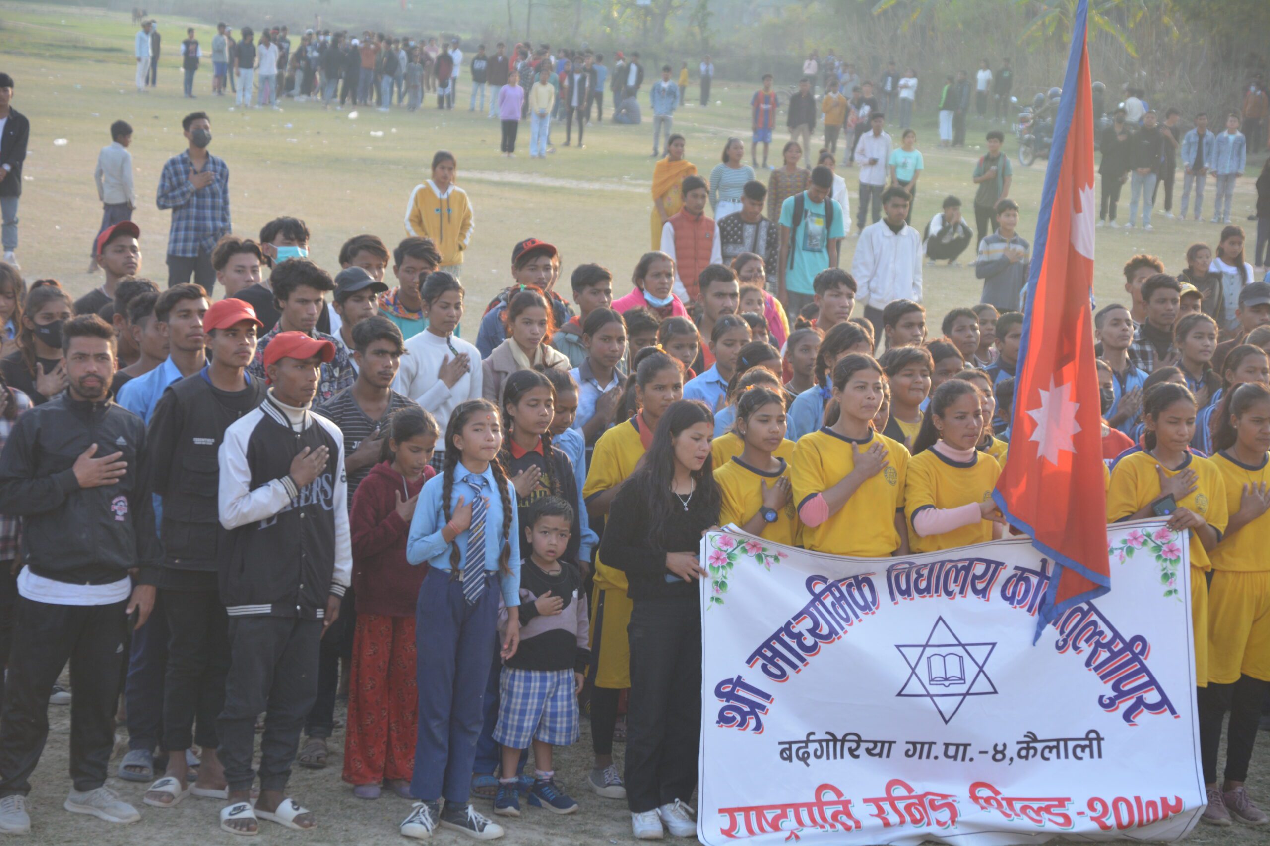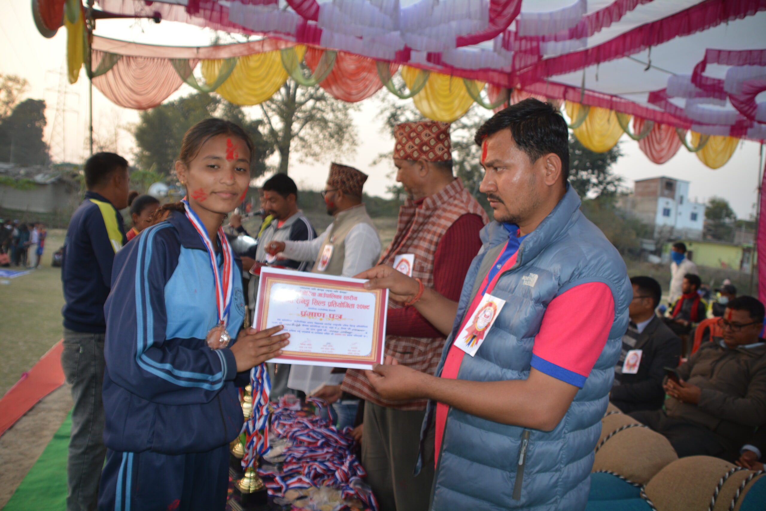 कैलाली । कैलालीको बर्दगोरिया गाउँपालिकामा गत मङ्गलवारबाट सुरु भएको पालिका स्तरीय राष्ट्रपति रनिङ्ग शिल्ड प्रतियोगिता सम्पन्न भएको छ । प्रतियोगितामा कक्षा ६ देखी १२ सम्मका १३ विद्यालयले भाग लिएका थिए । प्रतियोगिताका अधिकांश खेल विद्यालाई वसन्त मुरारी माध्यमिक विद्यालयले कब्जा गरेको छ । १० स्वर्ण, ७ रजत र २ कास्य सहित वसन्त मुरारी प्रथम हुँदा ५ स्वर्ण र ३ कास्य सहित नोबेल एकेडेमी दोस्रो बनेको छ । यस्तै ३ स्वर्ण, ८ रजत र २ कास्य सहित कालिका मा.वि. नौनिया तृतीय बनेको छ । प्रतियोगितामा मा.वि. कोटातुल्सीपुरले ३ स्वर्ण, ४ रजत र ७ कास्य हात पारेको छ । जगदम्बिके भगवती मा.वि. खैरेनीले ३ स्वर्ण, ४ रजत र ४ कास्य, महुन्याल मा.वि. बासकोटीले ३ स्वर्ण, २ रजत र ४ कास्य, बालकन्या मा.वि. कट्टीपुरले २ स्वर्ण, २ रजत र ७ कास्य र न्यु वालवाटीका मा.वि. बौनियाँले १ स्वर्ण, २ रजत र ३ कास्य हात पारेको छ । यस्तै द सनराईज मा.वि.बौनियाँले २ रजत र १ कास्य, आदर्श सामुदायिक मा.वि.ले १ कास्य, र माइकी मिडियमले १ कास्य प्राप्त गरेका छन् । प्रतियोगितामा १ सय, २ सय, ४ सय, ८ सय, १ हजार ५ सय र ३ हजार मिटर दौड, कबड्डी, १ सय मिटर र ४ सय मिटर रिले, भलिबल, हाई जम्प, लङ्ग जम्प, सट फुट, त्रिपल जम्प र ज्याइबलिन थ्रो गरी १५ विद्यामा खेल खेलाइएको थियो । जिल्ला स्तरमा हुने राष्ट्रपति रनिङ्ग शिल्डलाई मध्यनजर गरी सञ्चालन गरिएको यस प्रतियोगिताबाट खेलाडी तथा टिम समेट छनौट भएका छन् । हरेक खेल विद्याका प्रथम र द्धितिय हुने टिम तथा खेलाडी जिल्ला स्तरको प्रतियोगितामा सहभागी हुने छन् । यस अघि २०७६ मा जिल्ला स्तरमा भएको प्रतियोगितामा वसन्त मुरारी मा.वि.ले कबड्डी विद्यामा उपाधि हात पारेको थियो ।