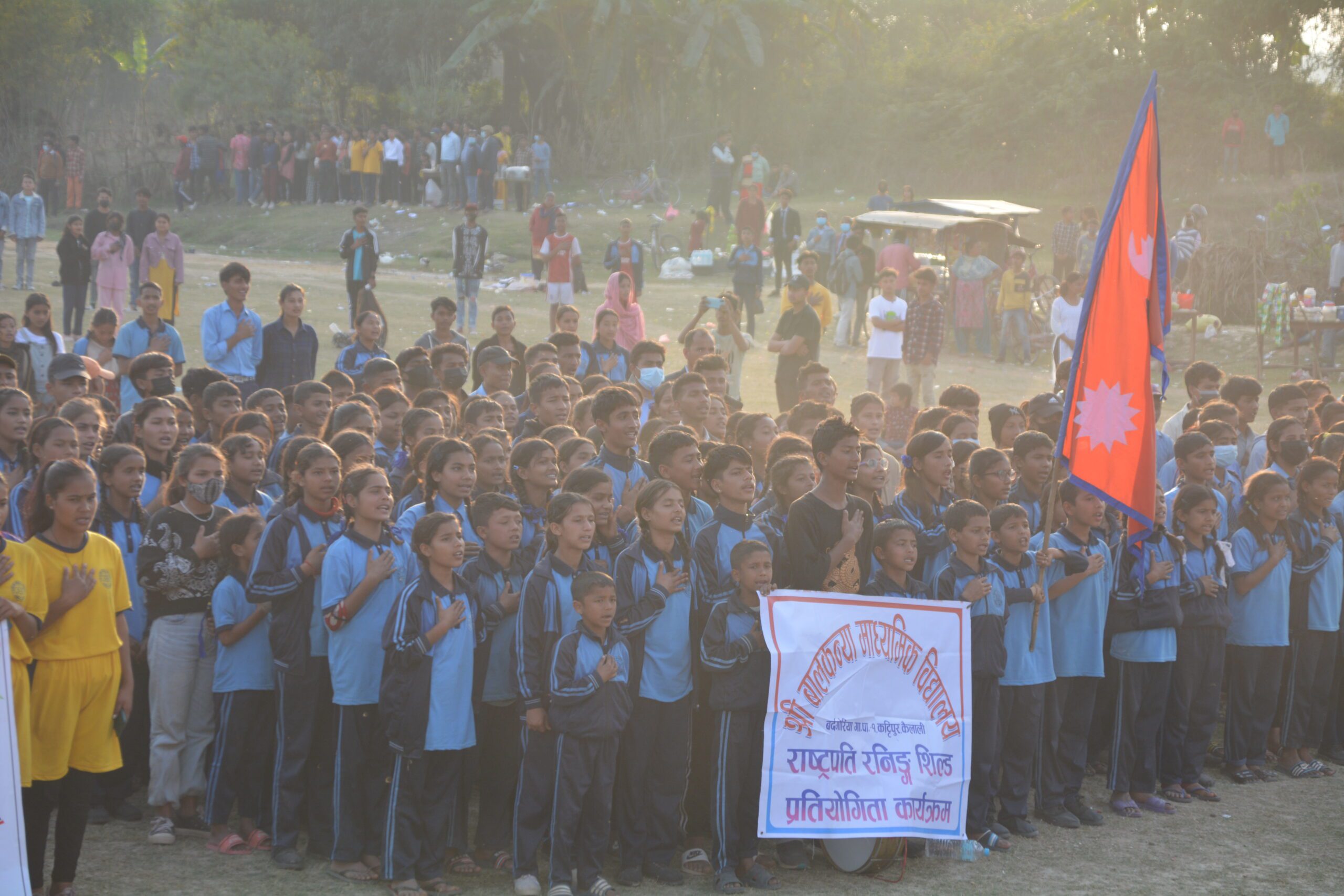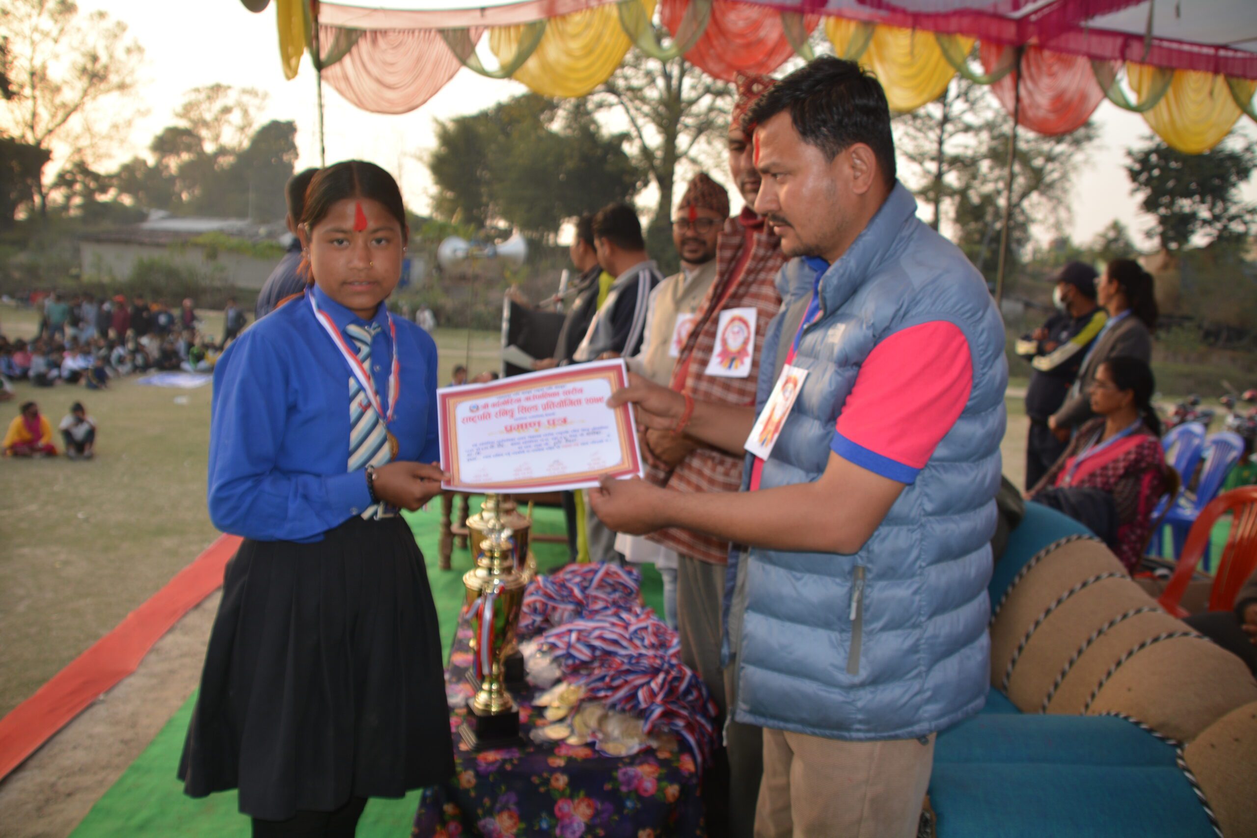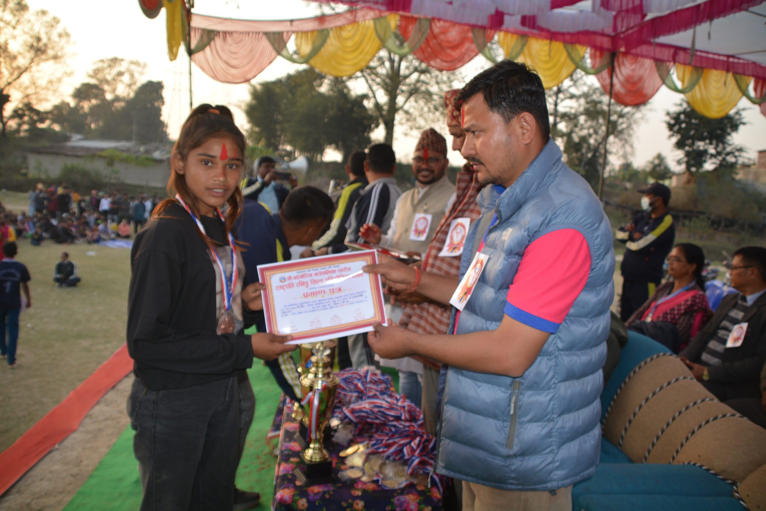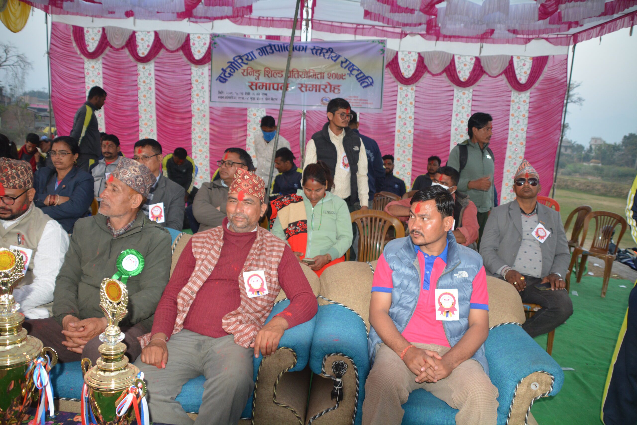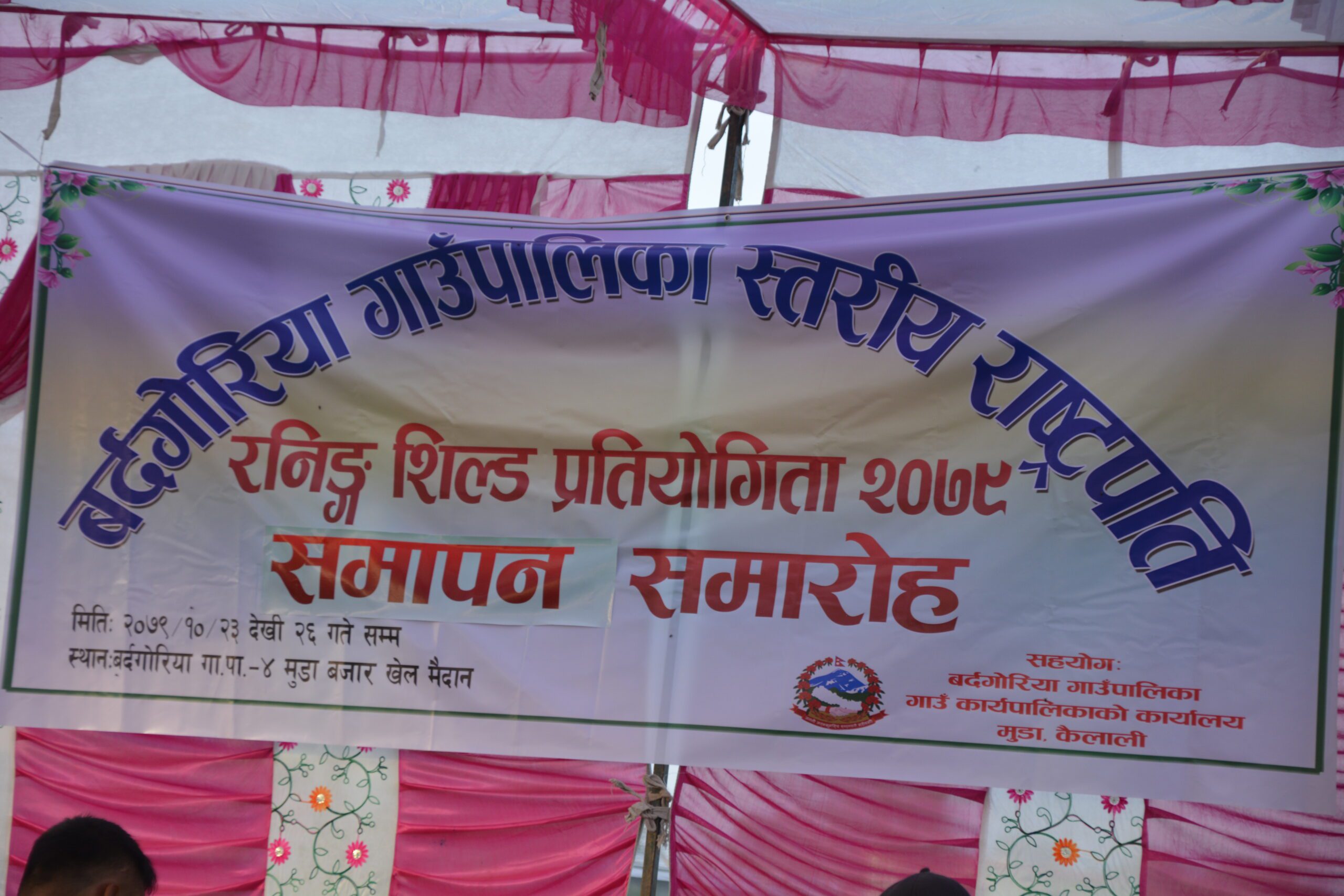 कैलाली । कैलालीको बर्दगोरिया गाउँपालिकामा गत मङ्गलवारबाट सुरु भएको पालिका स्तरीय राष्ट्रपति रनिङ्ग शिल्ड प्रतियोगिता सम्पन्न भएको छ । प्रतियोगितामा कक्षा ६ देखी १२ सम्मका १३ विद्यालयले भाग लिएका थिए । प्रतियोगिताका अधिकांश खेल विद्यालाई वसन्त मुरारी माध्यमिक विद्यालयले कब्जा गरेको छ । १० स्वर्ण, ७ रजत र २ कास्य सहित वसन्त मुरारी प्रथम हुँदा ५ स्वर्ण र ३ कास्य सहित नोबेल एकेडेमी दोस्रो बनेको छ । यस्तै ३ स्वर्ण, ८ रजत र २ कास्य सहित कालिका मा.वि. नौनिया तृतीय बनेको छ । प्रतियोगितामा मा.वि. कोटातुल्सीपुरले ३ स्वर्ण, ४ रजत र ७ कास्य हात पारेको छ । जगदम्बिके भगवती मा.वि. खैरेनीले ३ स्वर्ण, ४ रजत र ४ कास्य, महुन्याल मा.वि. बासकोटीले ३ स्वर्ण, २ रजत र ४ कास्य, बालकन्या मा.वि. कट्टीपुरले २ स्वर्ण, २ रजत र ७ कास्य र न्यु वालवाटीका मा.वि. बौनियाँले १ स्वर्ण, २ रजत र ३ कास्य हात पारेको छ । यस्तै द सनराईज मा.वि.बौनियाँले २ रजत र १ कास्य, आदर्श सामुदायिक मा.वि.ले १ कास्य, र माइकी मिडियमले १ कास्य प्राप्त गरेका छन् । प्रतियोगितामा १ सय, २ सय, ४ सय, ८ सय, १ हजार ५ सय र ३ हजार मिटर दौड, कबड्डी, १ सय मिटर र ४ सय मिटर रिले, भलिबल, हाई जम्प, लङ्ग जम्प, सट फुट, त्रिपल जम्प र ज्याइबलिन थ्रो गरी १५ विद्यामा खेल खेलाइएको थियो । जिल्ला स्तरमा हुने राष्ट्रपति रनिङ्ग शिल्डलाई मध्यनजर गरी सञ्चालन गरिएको यस प्रतियोगिताबाट खेलाडी तथा टिम समेट छनौट भएका छन् । हरेक खेल विद्याका प्रथम र द्धितिय हुने टिम तथा खेलाडी जिल्ला स्तरको प्रतियोगितामा सहभागी हुने छन् । यस अघि २०७६ मा जिल्ला स्तरमा भएको प्रतियोगितामा वसन्त मुरारी मा.वि.ले कबड्डी विद्यामा उपाधि हात पारेको थियो ।