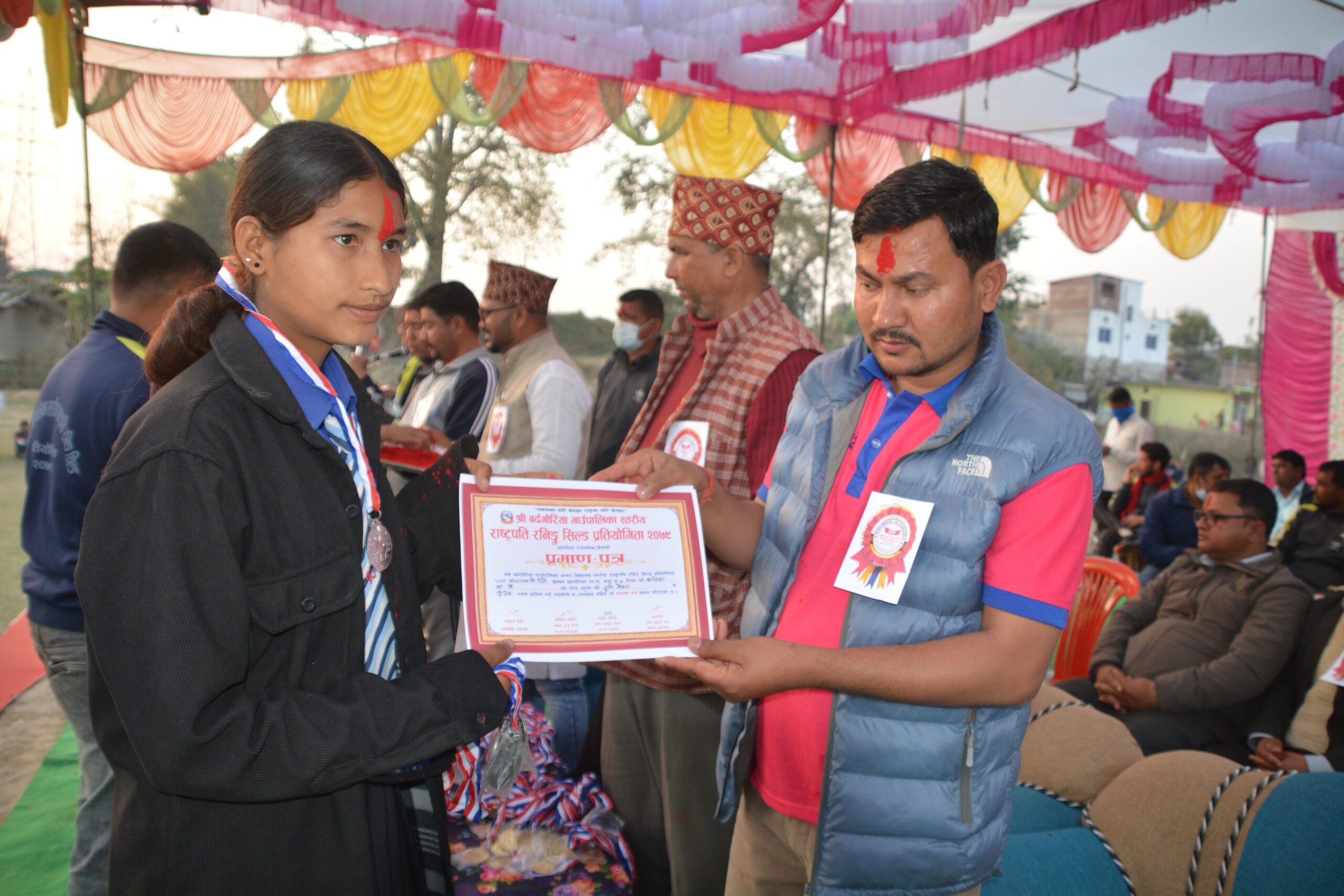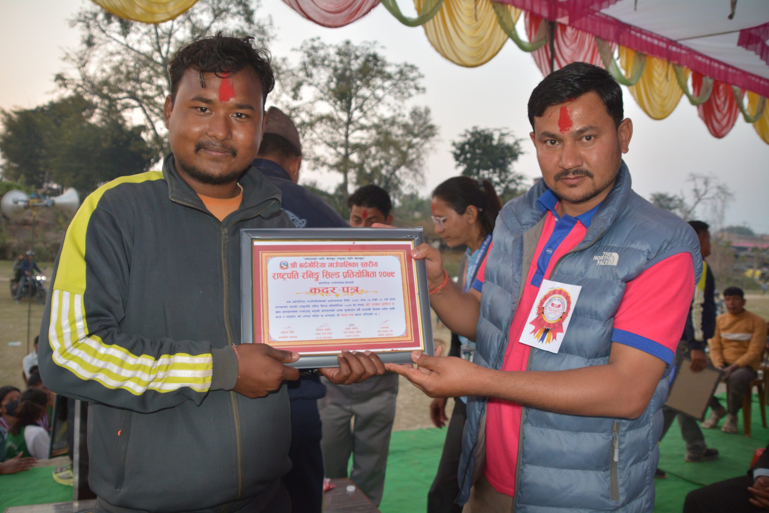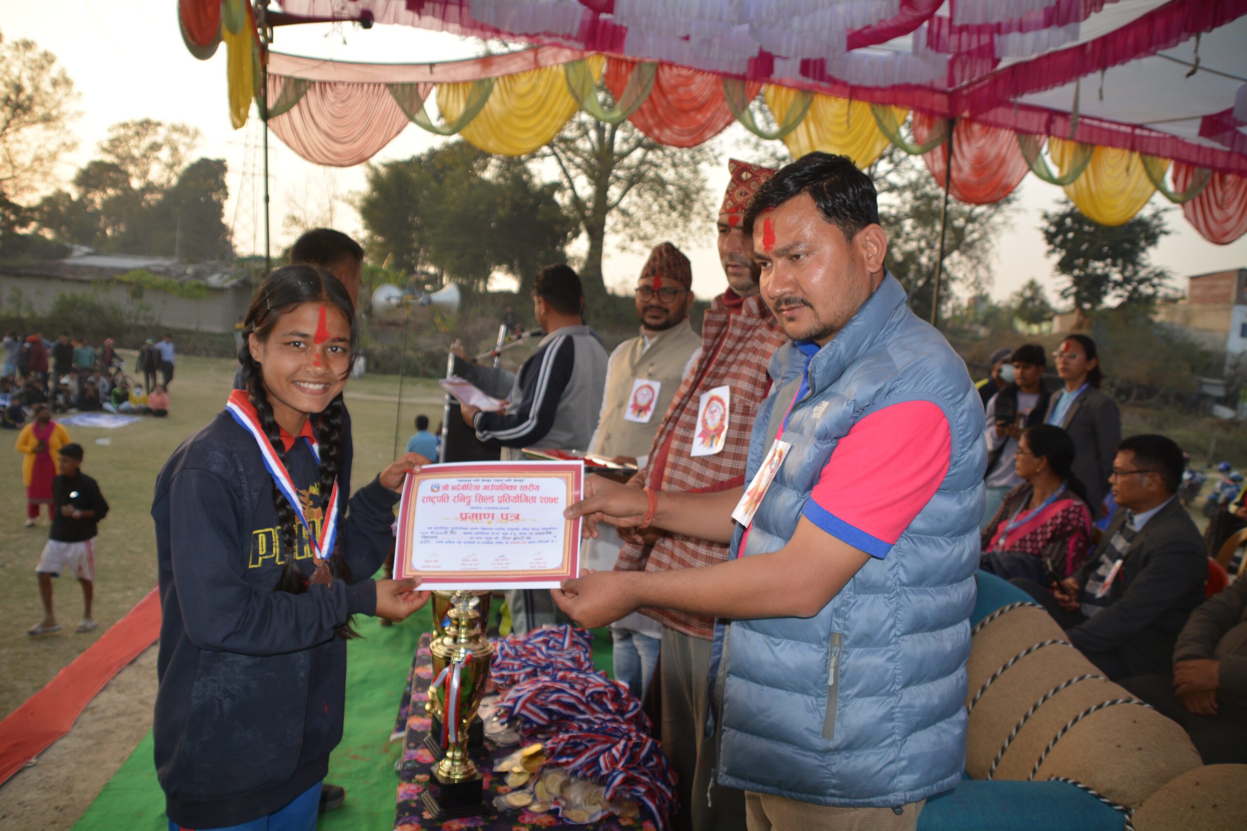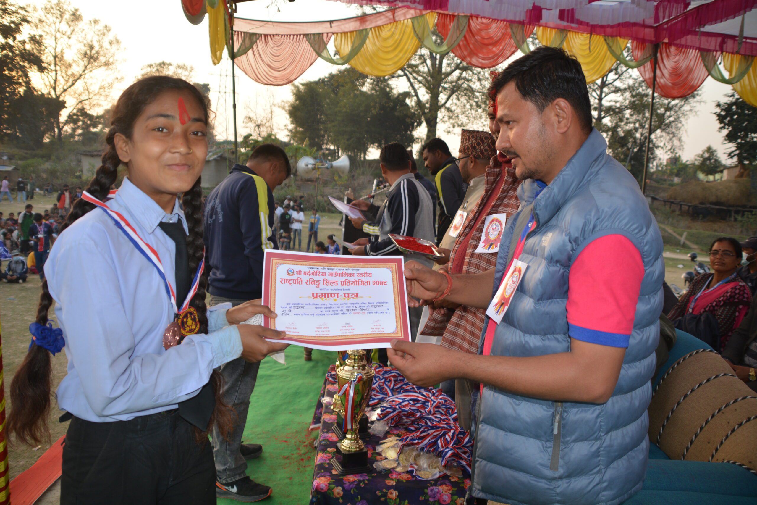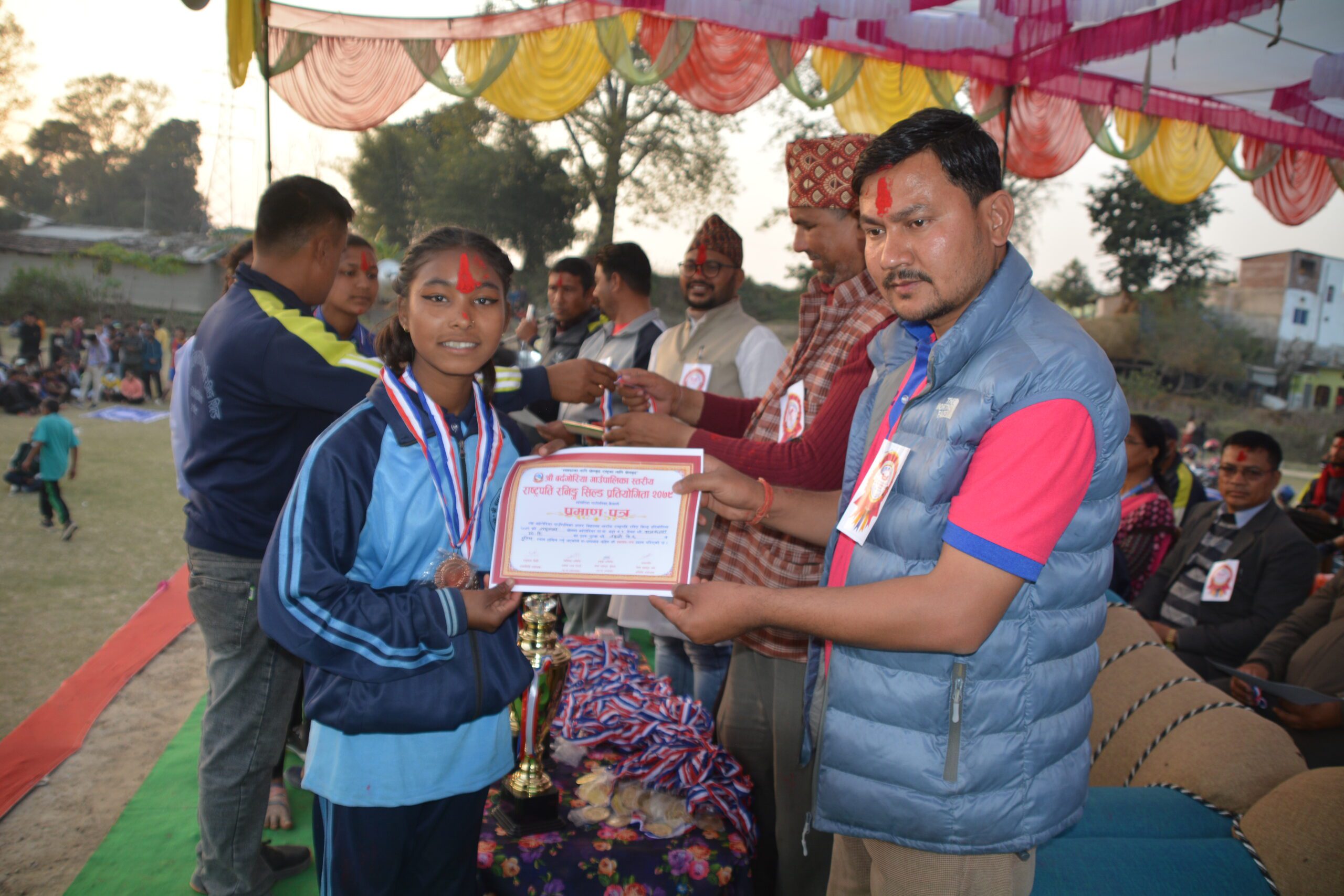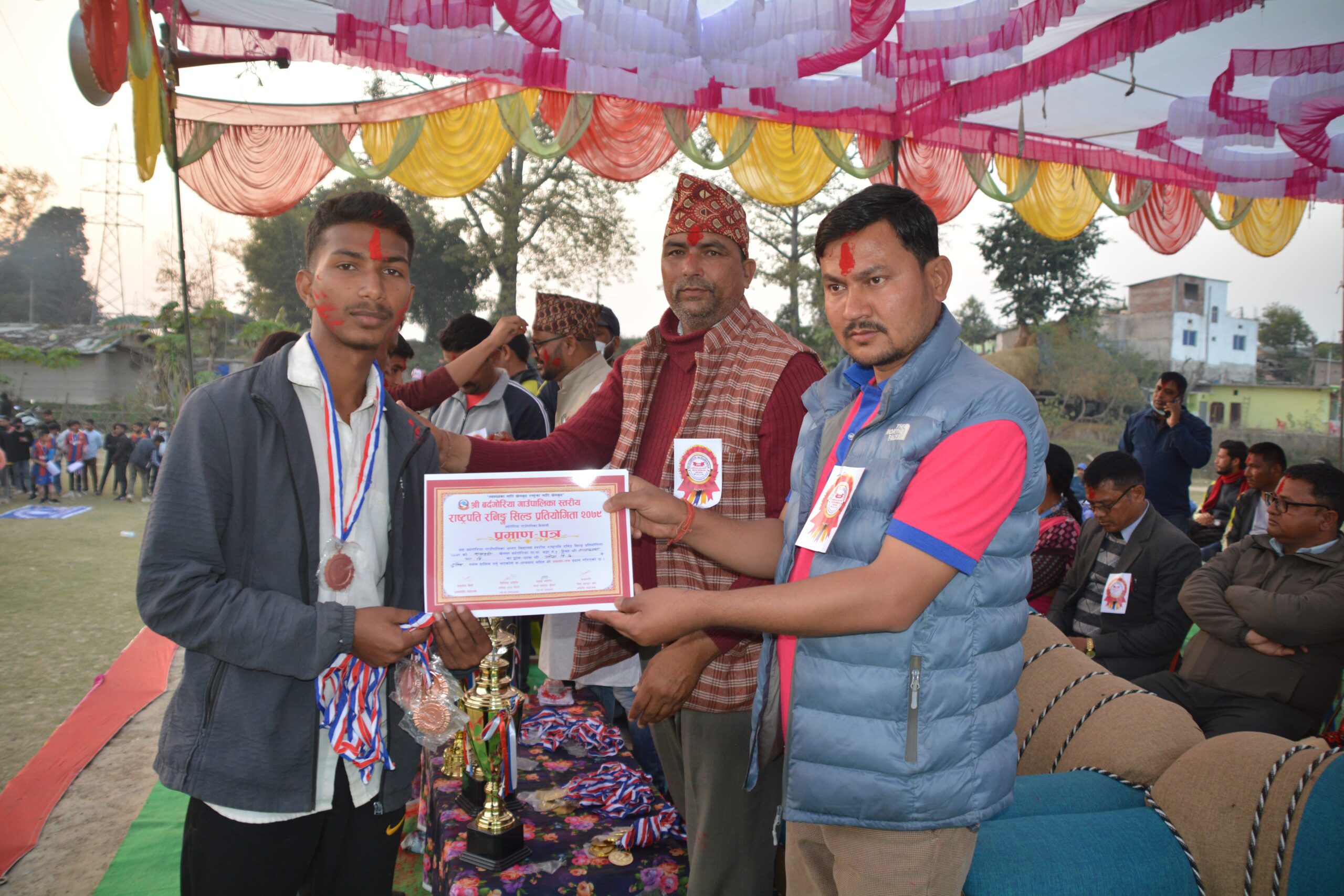 कैलाली । कैलालीको बर्दगोरिया गाउँपालिकामा गत मङ्गलवारबाट सुरु भएको पालिका स्तरीय राष्ट्रपति रनिङ्ग शिल्ड प्रतियोगिता सम्पन्न भएको छ । प्रतियोगितामा कक्षा ६ देखी १२ सम्मका १३ विद्यालयले भाग लिएका थिए । प्रतियोगिताका अधिकांश खेल विद्यालाई वसन्त मुरारी माध्यमिक विद्यालयले कब्जा गरेको छ । १० स्वर्ण, ७ रजत र २ कास्य सहित वसन्त मुरारी प्रथम हुँदा ५ स्वर्ण र ३ कास्य सहित नोबेल एकेडेमी दोस्रो बनेको छ । यस्तै ३ स्वर्ण, ८ रजत र २ कास्य सहित कालिका मा.वि. नौनिया तृतीय बनेको छ । प्रतियोगितामा मा.वि. कोटातुल्सीपुरले ३ स्वर्ण, ४ रजत र ७ कास्य हात पारेको छ । जगदम्बिके भगवती मा.वि. खैरेनीले ३ स्वर्ण, ४ रजत र ४ कास्य, महुन्याल मा.वि. बासकोटीले ३ स्वर्ण, २ रजत र ४ कास्य, बालकन्या मा.वि. कट्टीपुरले २ स्वर्ण, २ रजत र ७ कास्य र न्यु वालवाटीका मा.वि. बौनियाँले १ स्वर्ण, २ रजत र ३ कास्य हात पारेको छ । यस्तै द सनराईज मा.वि.बौनियाँले २ रजत र १ कास्य, आदर्श सामुदायिक मा.वि.ले १ कास्य, र माइकी मिडियमले १ कास्य प्राप्त गरेका छन् । प्रतियोगितामा १ सय, २ सय, ४ सय, ८ सय, १ हजार ५ सय र ३ हजार मिटर दौड, कबड्डी, १ सय मिटर र ४ सय मिटर रिले, भलिबल, हाई जम्प, लङ्ग जम्प, सट फुट, त्रिपल जम्प र ज्याइबलिन थ्रो गरी १५ विद्यामा खेल खेलाइएको थियो । जिल्ला स्तरमा हुने राष्ट्रपति रनिङ्ग शिल्डलाई मध्यनजर गरी सञ्चालन गरिएको यस प्रतियोगिताबाट खेलाडी तथा टिम समेट छनौट भएका छन् । हरेक खेल विद्याका प्रथम र द्धितिय हुने टिम तथा खेलाडी जिल्ला स्तरको प्रतियोगितामा सहभागी हुने छन् । यस अघि २०७६ मा जिल्ला स्तरमा भएको प्रतियोगितामा वसन्त मुरारी मा.वि.ले कबड्डी विद्यामा उपाधि हात पारेको थियो ।