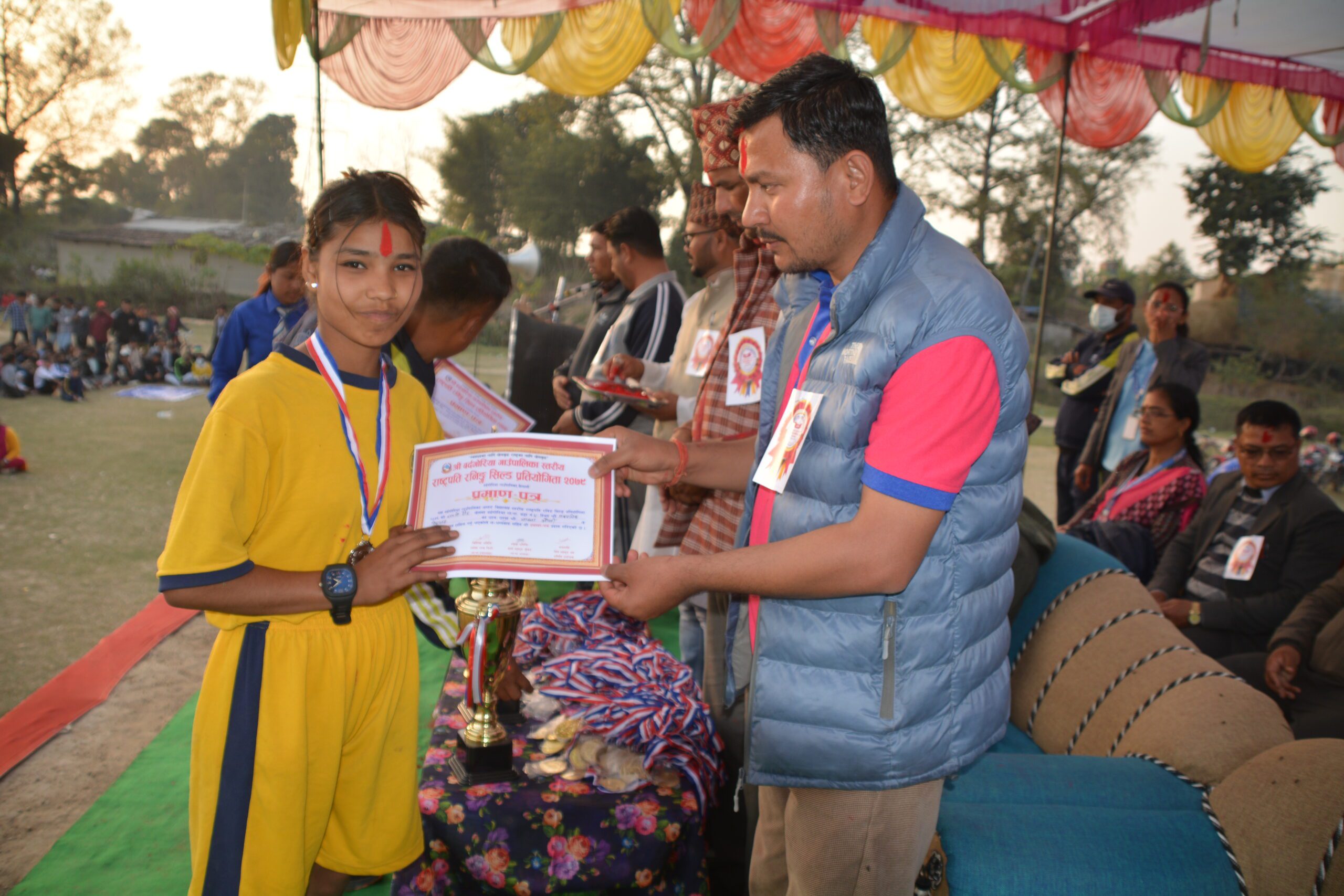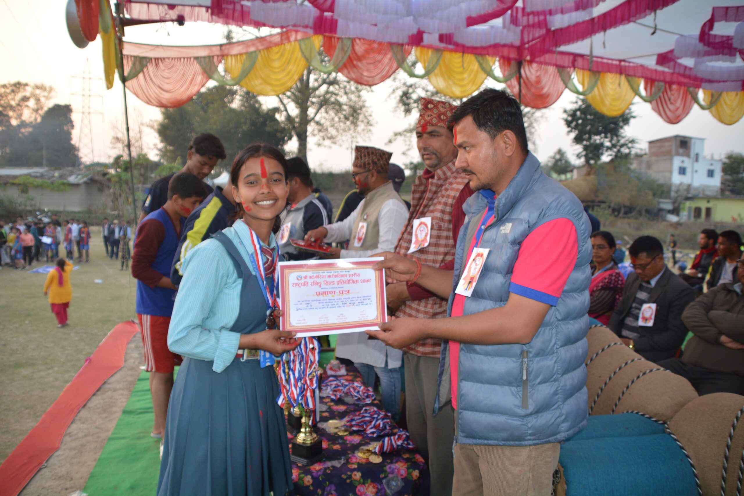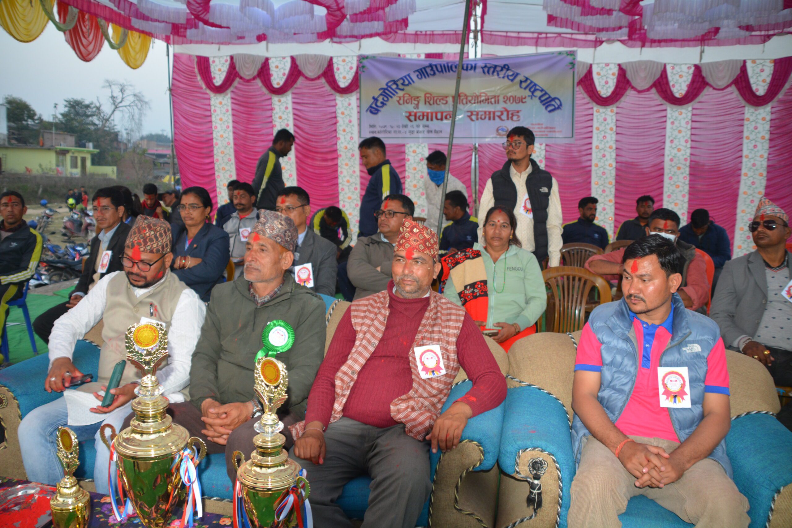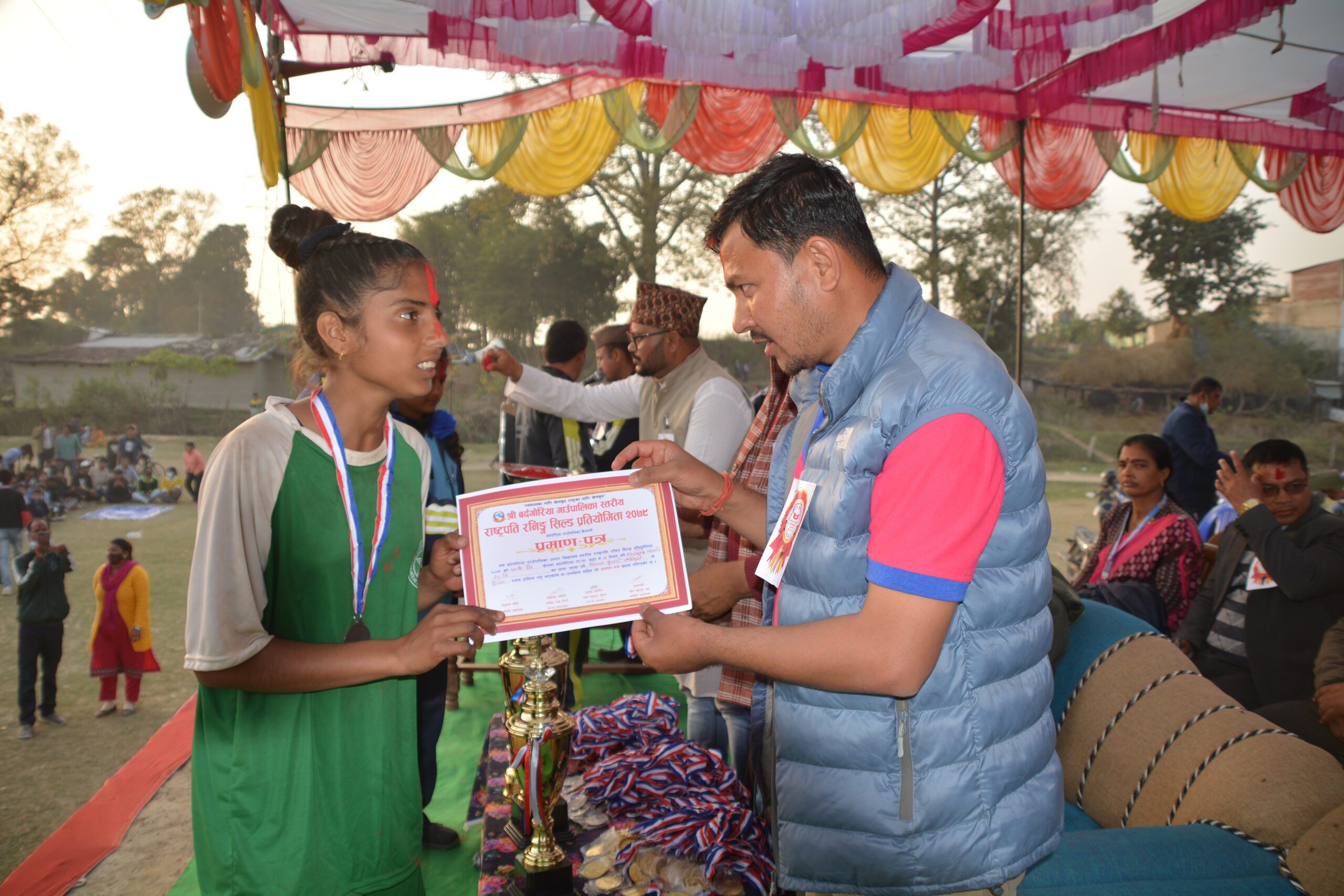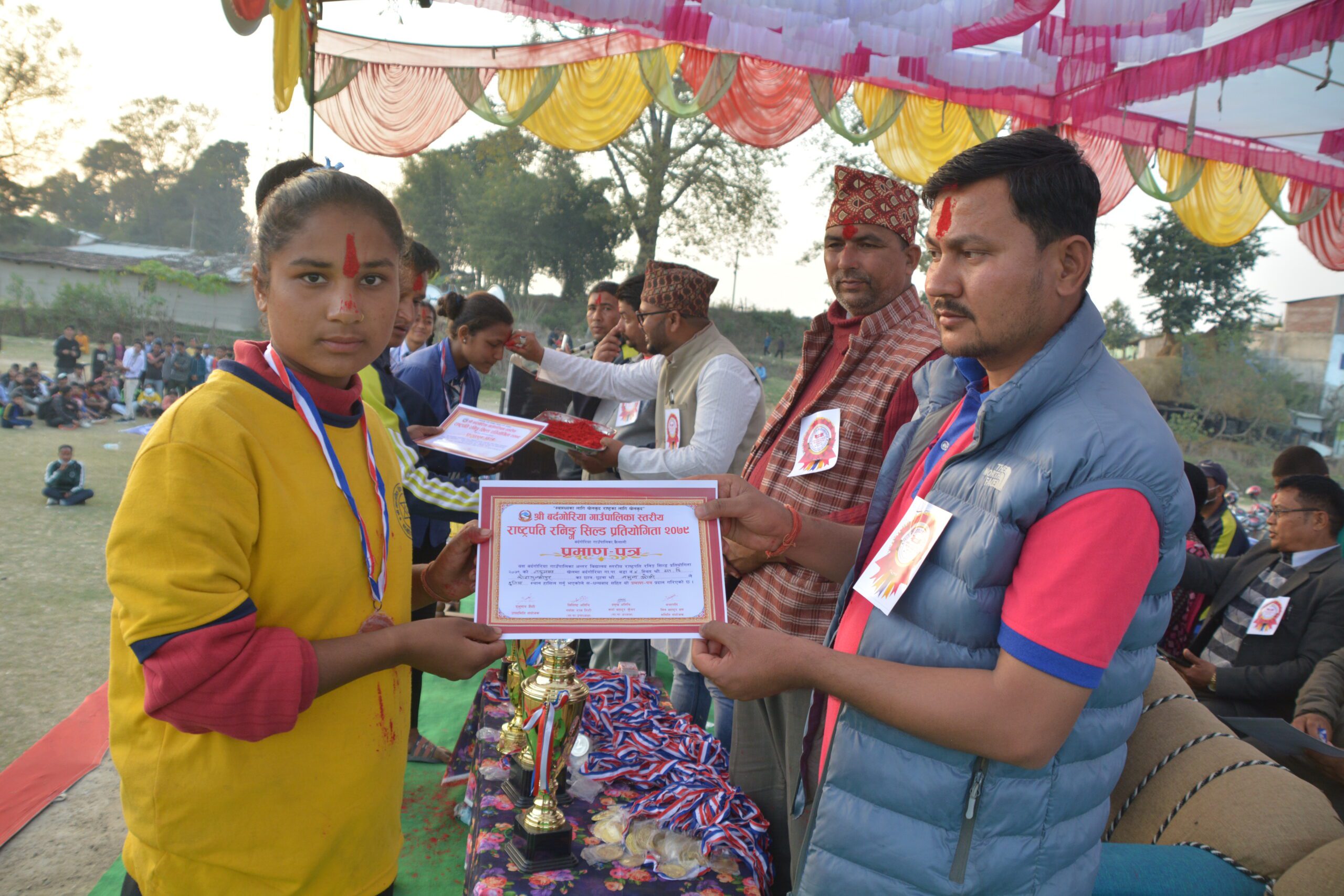 कैलाली । कैलालीको बर्दगोरिया गाउँपालिकामा गत मङ्गलवारबाट सुरु भएको पालिका स्तरीय राष्ट्रपति रनिङ्ग शिल्ड प्रतियोगिता सम्पन्न भएको छ । प्रतियोगितामा कक्षा ६ देखी १२ सम्मका १३ विद्यालयले भाग लिएका थिए । प्रतियोगिताका अधिकांश खेल विद्यालाई वसन्त मुरारी माध्यमिक विद्यालयले कब्जा गरेको छ । १० स्वर्ण, ७ रजत र २ कास्य सहित वसन्त मुरारी प्रथम हुँदा ५ स्वर्ण र ३ कास्य सहित नोबेल एकेडेमी दोस्रो बनेको छ । यस्तै ३ स्वर्ण, ८ रजत र २ कास्य सहित कालिका मा.वि. नौनिया तृतीय बनेको छ । प्रतियोगितामा मा.वि. कोटातुल्सीपुरले ३ स्वर्ण, ४ रजत र ७ कास्य हात पारेको छ । जगदम्बिके भगवती मा.वि. खैरेनीले ३ स्वर्ण, ४ रजत र ४ कास्य, महुन्याल मा.वि. बासकोटीले ३ स्वर्ण, २ रजत र ४ कास्य, बालकन्या मा.वि. कट्टीपुरले २ स्वर्ण, २ रजत र ७ कास्य र न्यु वालवाटीका मा.वि. बौनियाँले १ स्वर्ण, २ रजत र ३ कास्य हात पारेको छ । यस्तै द सनराईज मा.वि.बौनियाँले २ रजत र १ कास्य, आदर्श सामुदायिक मा.वि.ले १ कास्य, र माइकी मिडियमले १ कास्य प्राप्त गरेका छन् । प्रतियोगितामा १ सय, २ सय, ४ सय, ८ सय, १ हजार ५ सय र ३ हजार मिटर दौड, कबड्डी, १ सय मिटर र ४ सय मिटर रिले, भलिबल, हाई जम्प, लङ्ग जम्प, सट फुट, त्रिपल जम्प र ज्याइबलिन थ्रो गरी १५ विद्यामा खेल खेलाइएको थियो । जिल्ला स्तरमा हुने राष्ट्रपति रनिङ्ग शिल्डलाई मध्यनजर गरी सञ्चालन गरिएको यस प्रतियोगिताबाट खेलाडी तथा टिम समेट छनौट भएका छन् । हरेक खेल विद्याका प्रथम र द्धितिय हुने टिम तथा खेलाडी जिल्ला स्तरको प्रतियोगितामा सहभागी हुने छन् । यस अघि २०७६ मा जिल्ला स्तरमा भएको प्रतियोगितामा वसन्त मुरारी मा.वि.ले कबड्डी विद्यामा उपाधि हात पारेको थियो ।