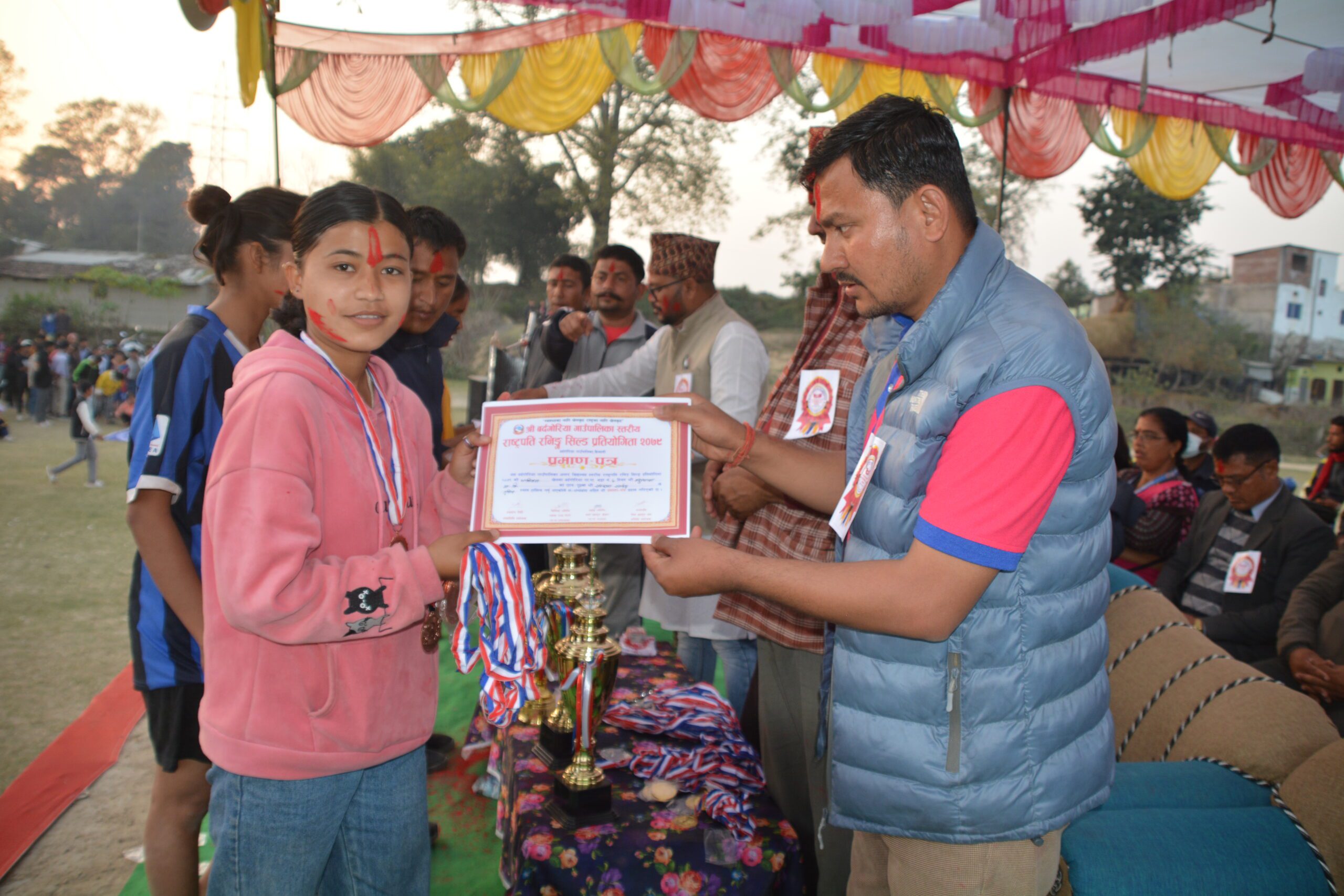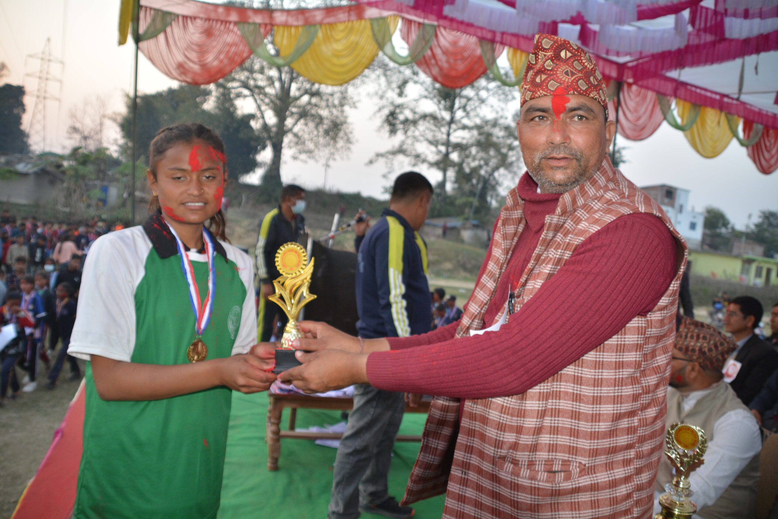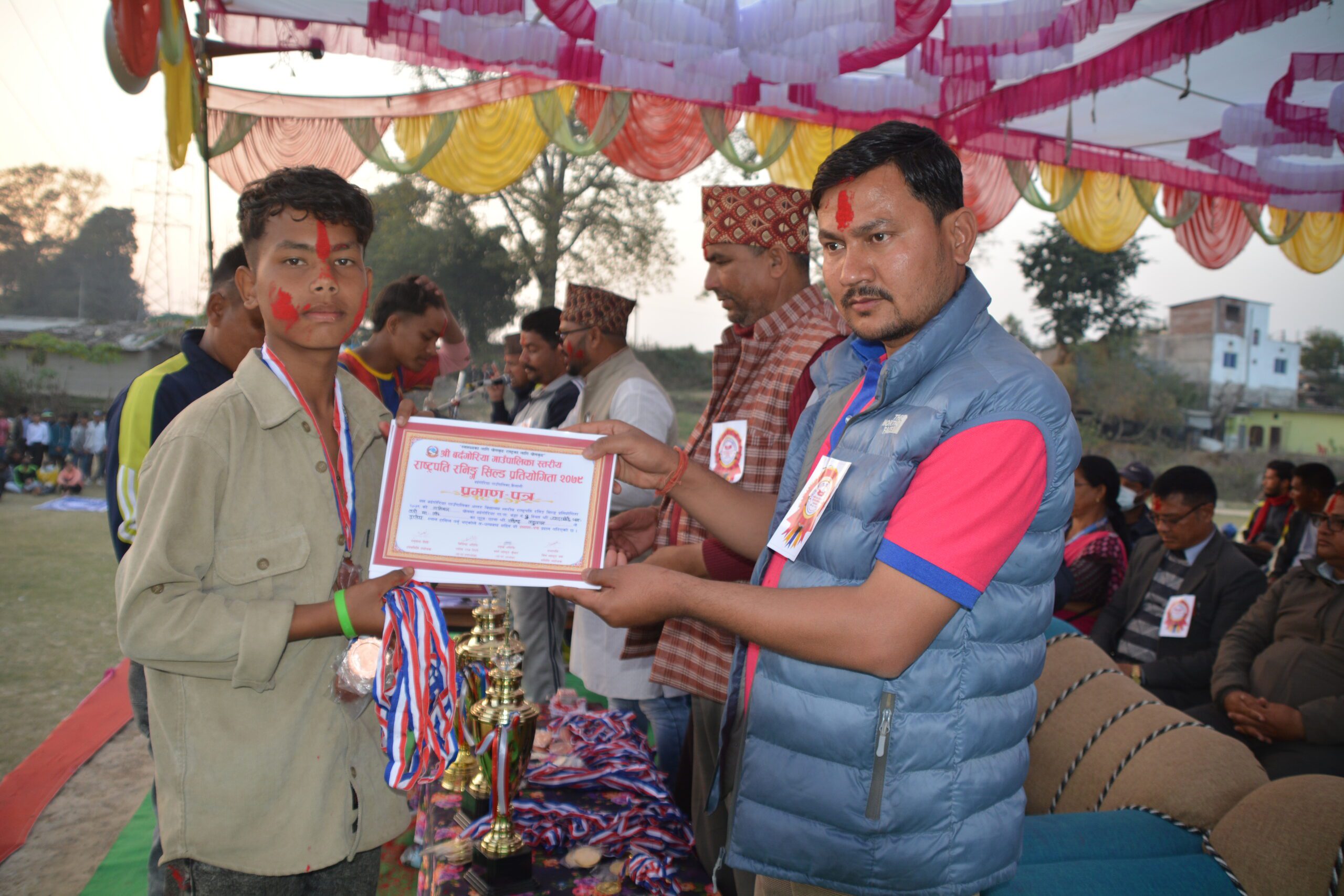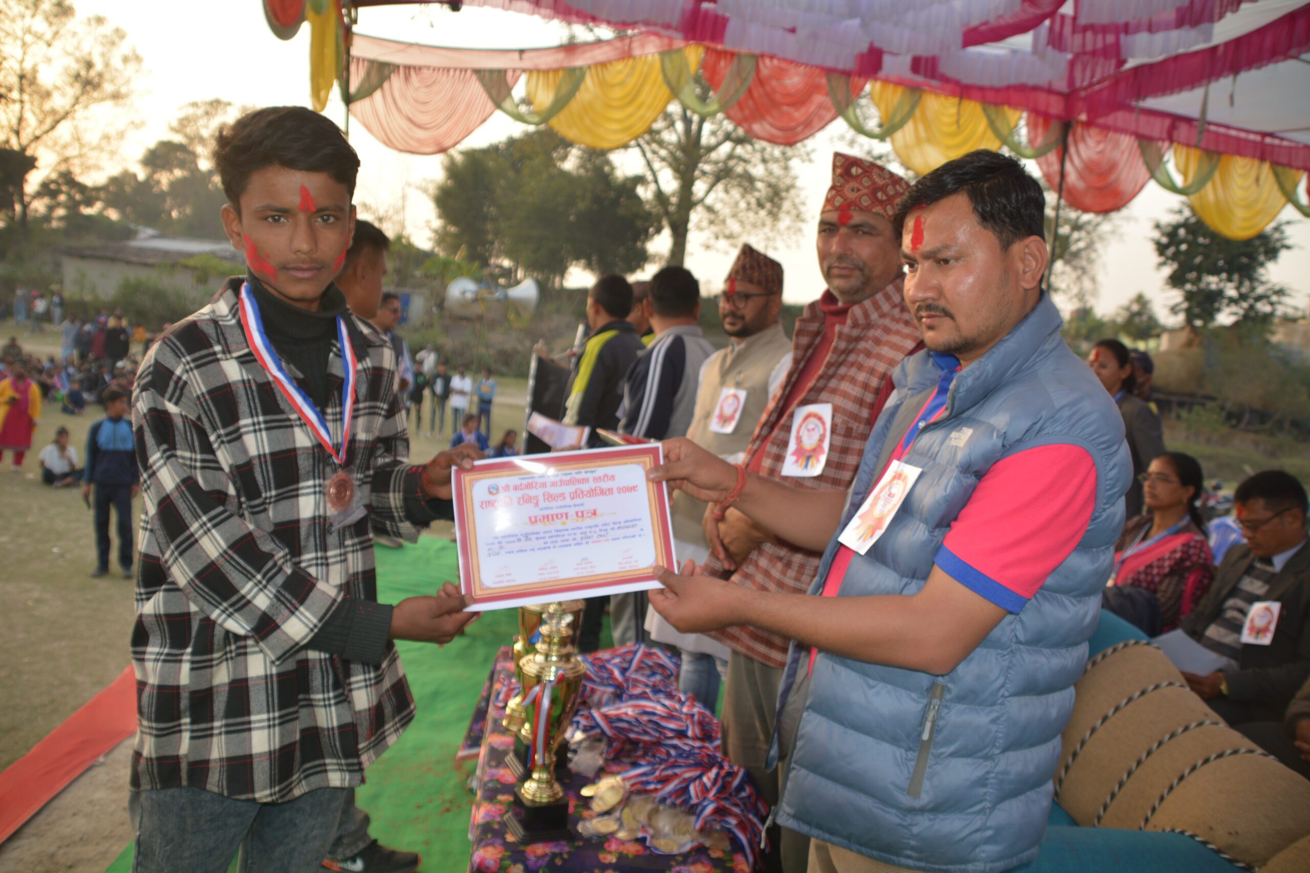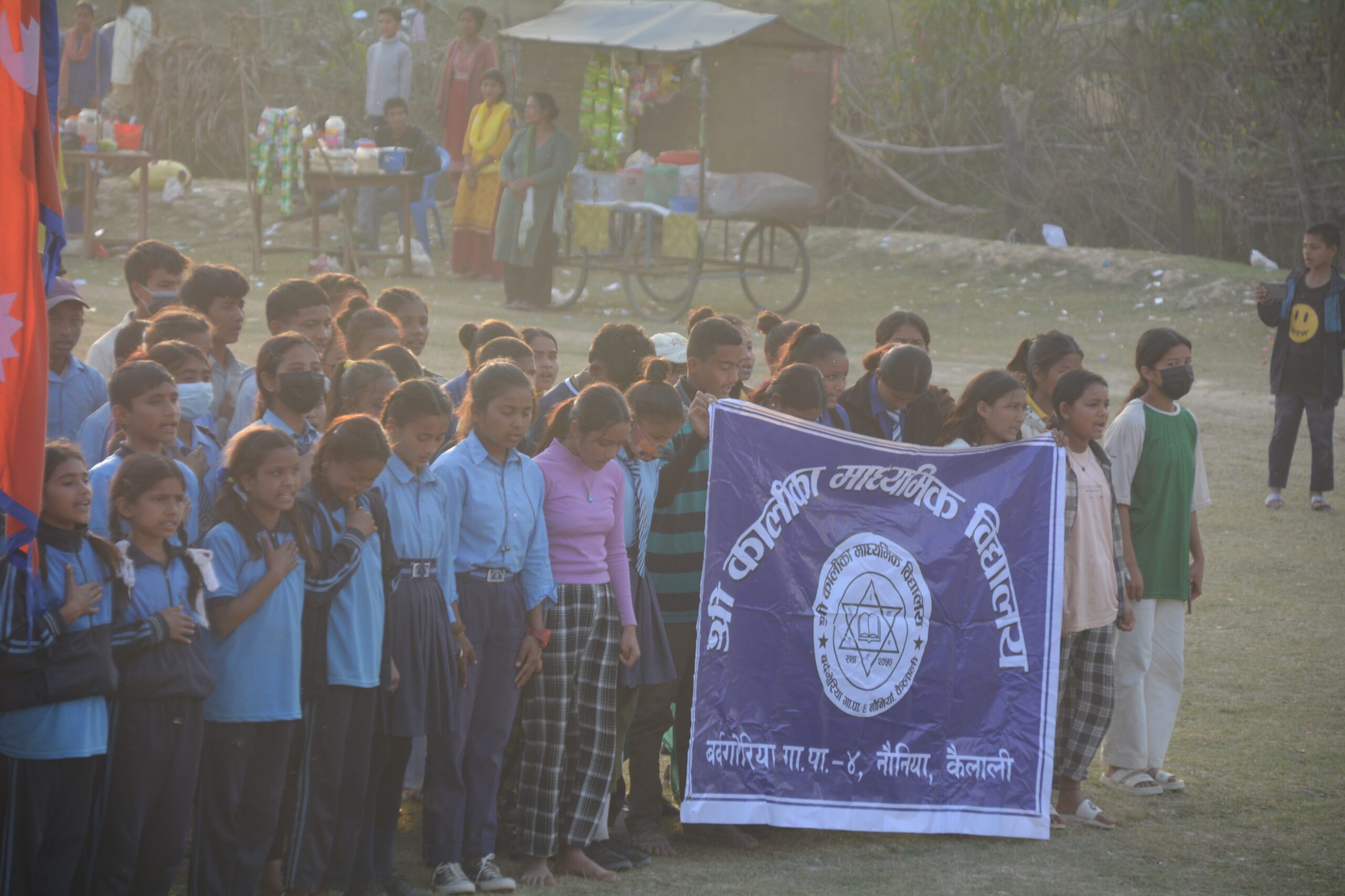 कैलाली । कैलालीको बर्दगोरिया गाउँपालिकामा गत मङ्गलवारबाट सुरु भएको पालिका स्तरीय राष्ट्रपति रनिङ्ग शिल्ड प्रतियोगिता सम्पन्न भएको छ । प्रतियोगितामा कक्षा ६ देखी १२ सम्मका १३ विद्यालयले भाग लिएका थिए । प्रतियोगिताका अधिकांश खेल विद्यालाई वसन्त मुरारी माध्यमिक विद्यालयले कब्जा गरेको छ । १० स्वर्ण, ७ रजत र २ कास्य सहित वसन्त मुरारी प्रथम हुँदा ५ स्वर्ण र ३ कास्य सहित नोबेल एकेडेमी दोस्रो बनेको छ । यस्तै ३ स्वर्ण, ८ रजत र २ कास्य सहित कालिका मा.वि. नौनिया तृतीय बनेको छ । प्रतियोगितामा मा.वि. कोटातुल्सीपुरले ३ स्वर्ण, ४ रजत र ७ कास्य हात पारेको छ । जगदम्बिके भगवती मा.वि. खैरेनीले ३ स्वर्ण, ४ रजत र ४ कास्य, महुन्याल मा.वि. बासकोटीले ३ स्वर्ण, २ रजत र ४ कास्य, बालकन्या मा.वि. कट्टीपुरले २ स्वर्ण, २ रजत र ७ कास्य र न्यु वालवाटीका मा.वि. बौनियाँले १ स्वर्ण, २ रजत र ३ कास्य हात पारेको छ । यस्तै द सनराईज मा.वि.बौनियाँले २ रजत र १ कास्य, आदर्श सामुदायिक मा.वि.ले १ कास्य, र माइकी मिडियमले १ कास्य प्राप्त गरेका छन् । प्रतियोगितामा १ सय, २ सय, ४ सय, ८ सय, १ हजार ५ सय र ३ हजार मिटर दौड, कबड्डी, १ सय मिटर र ४ सय मिटर रिले, भलिबल, हाई जम्प, लङ्ग जम्प, सट फुट, त्रिपल जम्प र ज्याइबलिन थ्रो गरी १५ विद्यामा खेल खेलाइएको थियो । जिल्ला स्तरमा हुने राष्ट्रपति रनिङ्ग शिल्डलाई मध्यनजर गरी सञ्चालन गरिएको यस प्रतियोगिताबाट खेलाडी तथा टिम समेट छनौट भएका छन् । हरेक खेल विद्याका प्रथम र द्धितिय हुने टिम तथा खेलाडी जिल्ला स्तरको प्रतियोगितामा सहभागी हुने छन् । यस अघि २०७६ मा जिल्ला स्तरमा भएको प्रतियोगितामा वसन्त मुरारी मा.वि.ले कबड्डी विद्यामा उपाधि हात पारेको थियो ।