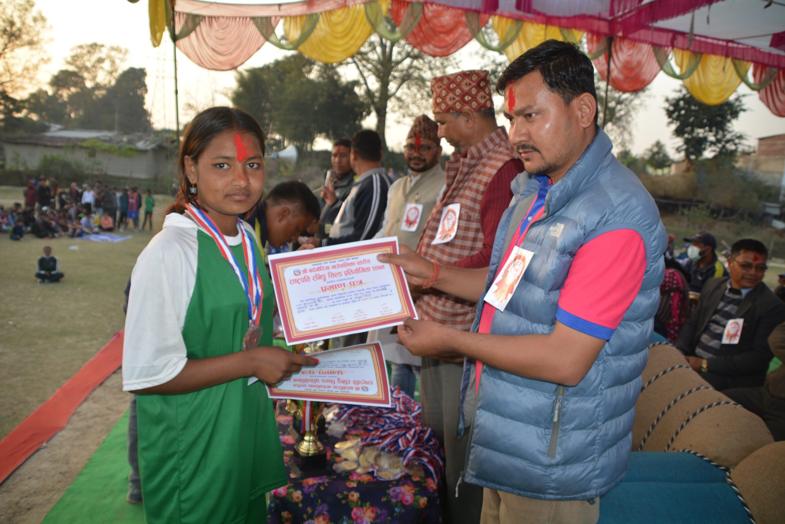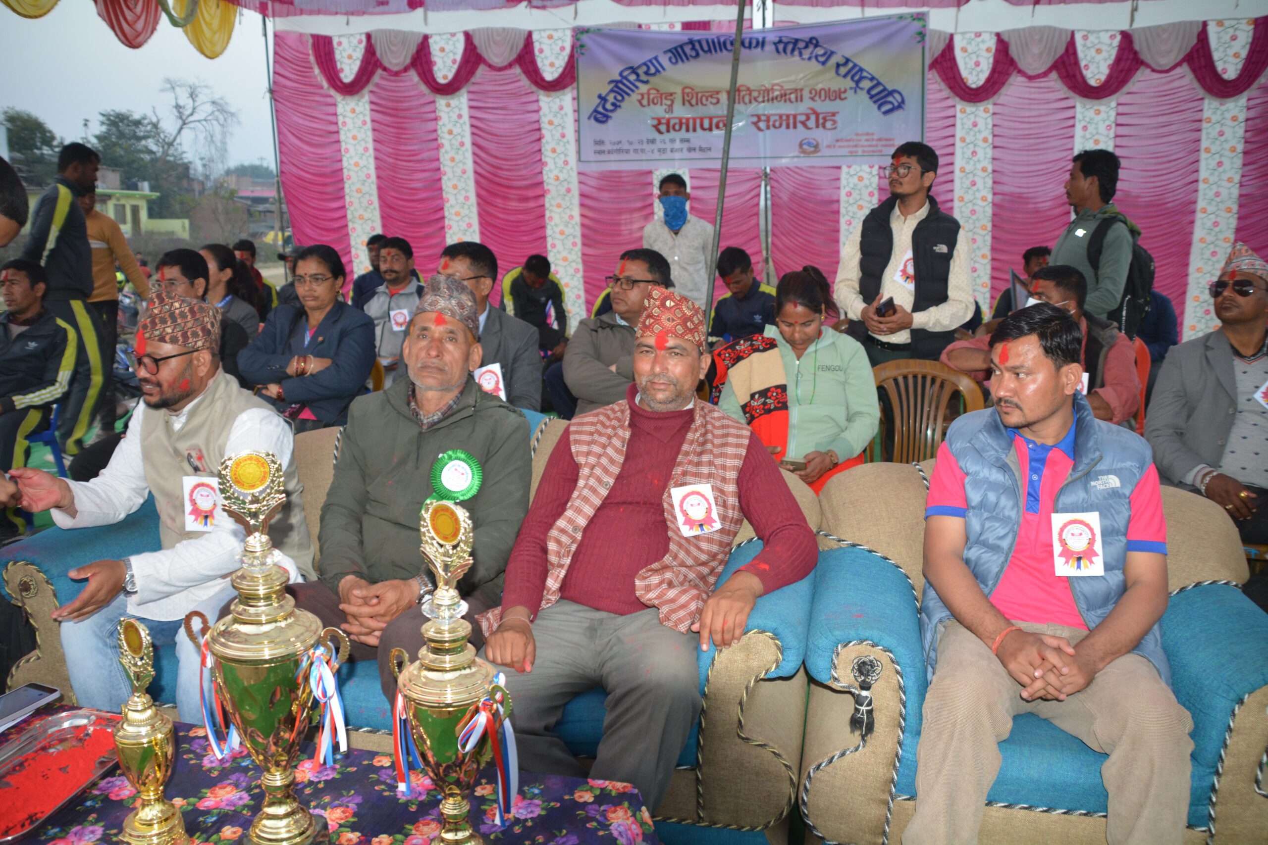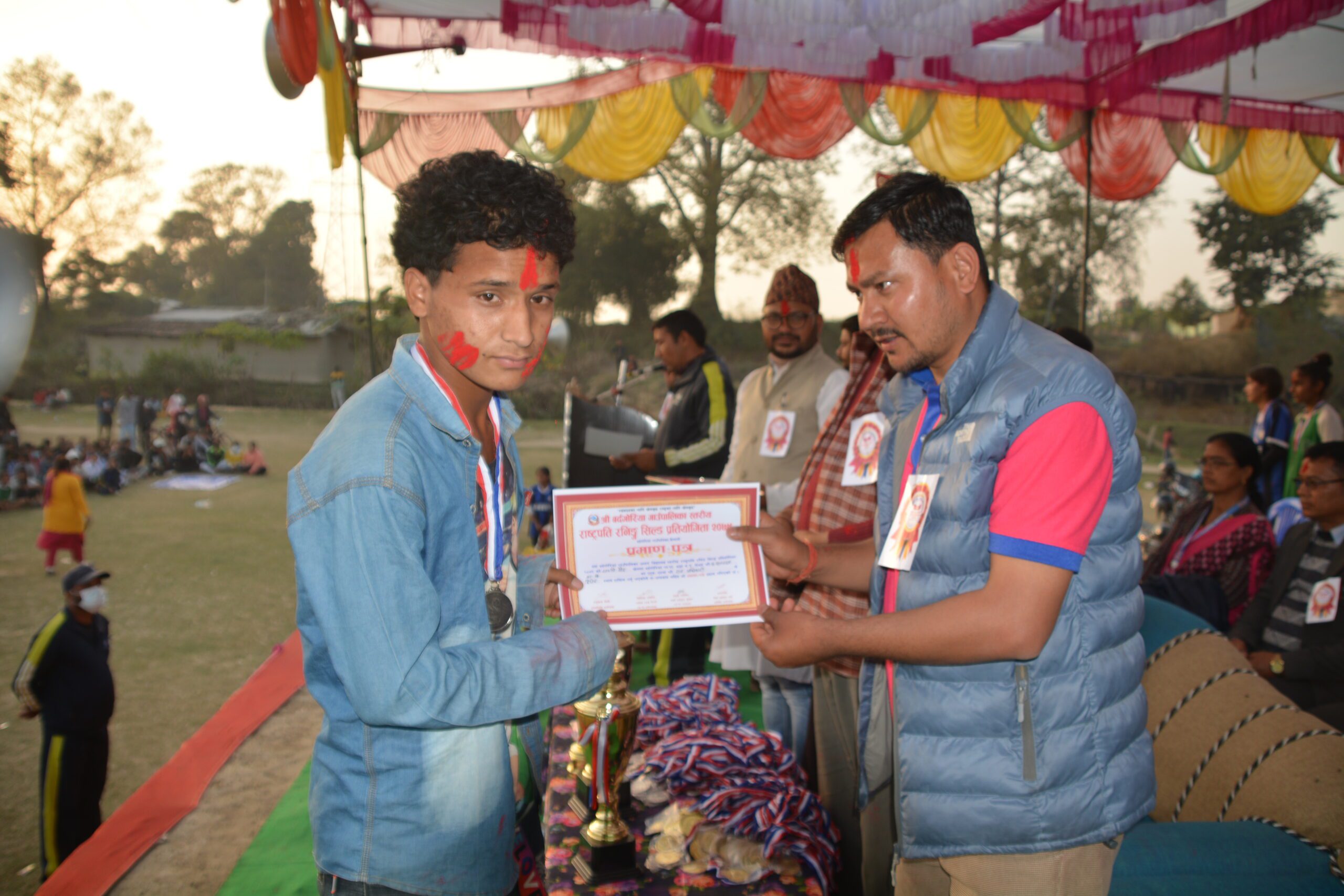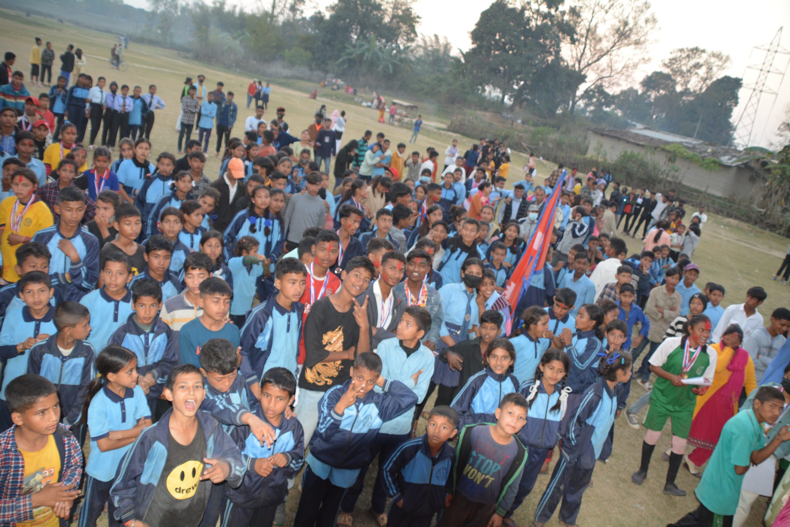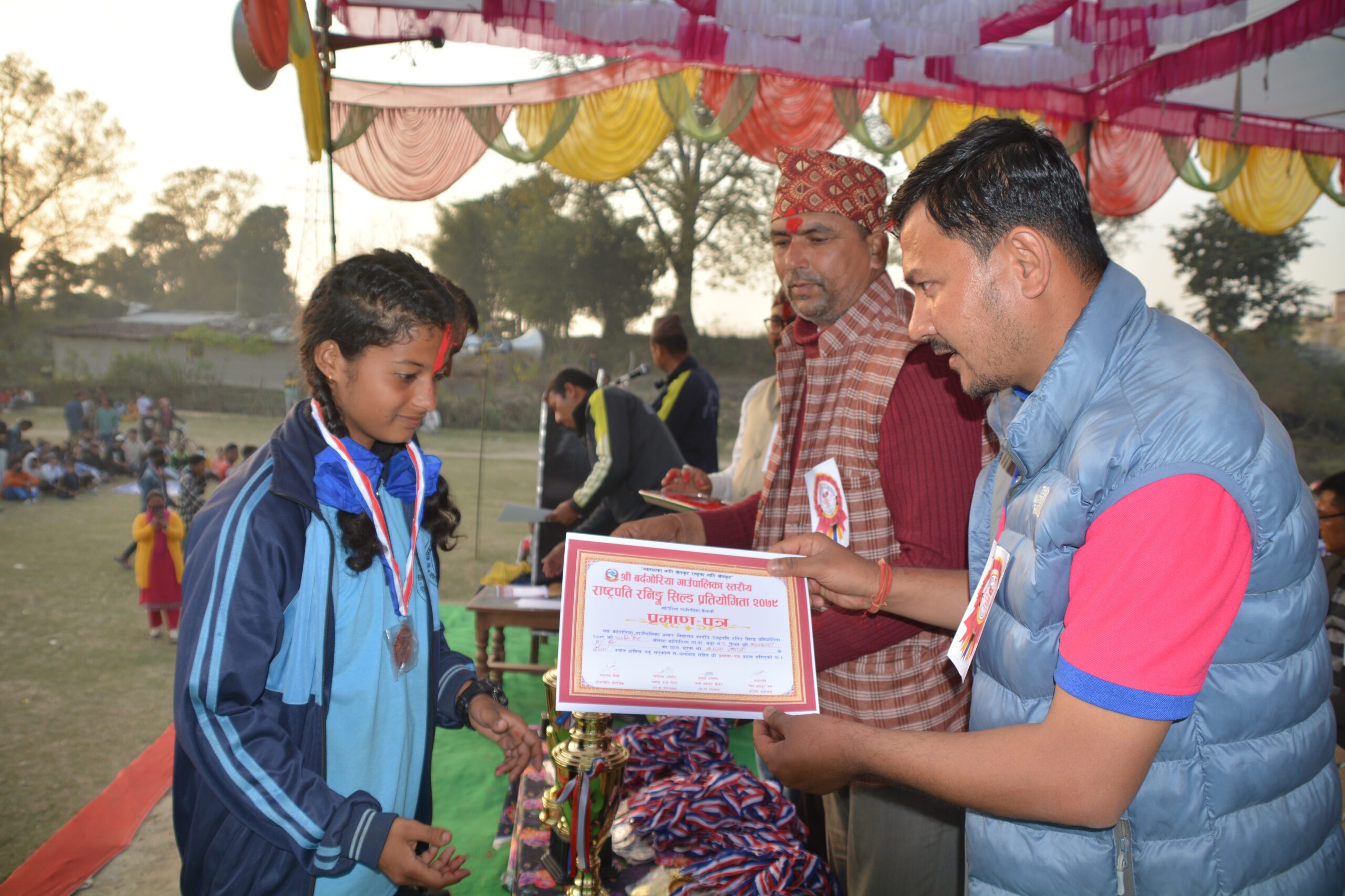 कैलाली । कैलालीको बर्दगोरिया गाउँपालिकामा गत मङ्गलवारबाट सुरु भएको पालिका स्तरीय राष्ट्रपति रनिङ्ग शिल्ड प्रतियोगिता सम्पन्न भएको छ । प्रतियोगितामा कक्षा ६ देखी १२ सम्मका १३ विद्यालयले भाग लिएका थिए । प्रतियोगिताका अधिकांश खेल विद्यालाई वसन्त मुरारी माध्यमिक विद्यालयले कब्जा गरेको छ । १० स्वर्ण, ७ रजत र २ कास्य सहित वसन्त मुरारी प्रथम हुँदा ५ स्वर्ण र ३ कास्य सहित नोबेल एकेडेमी दोस्रो बनेको छ । यस्तै ३ स्वर्ण, ८ रजत र २ कास्य सहित कालिका मा.वि. नौनिया तृतीय बनेको छ । प्रतियोगितामा मा.वि. कोटातुल्सीपुरले ३ स्वर्ण, ४ रजत र ७ कास्य हात पारेको छ । जगदम्बिके भगवती मा.वि. खैरेनीले ३ स्वर्ण, ४ रजत र ४ कास्य, महुन्याल मा.वि. बासकोटीले ३ स्वर्ण, २ रजत र ४ कास्य, बालकन्या मा.वि. कट्टीपुरले २ स्वर्ण, २ रजत र ७ कास्य र न्यु वालवाटीका मा.वि. बौनियाँले १ स्वर्ण, २ रजत र ३ कास्य हात पारेको छ । यस्तै द सनराईज मा.वि.बौनियाँले २ रजत र १ कास्य, आदर्श सामुदायिक मा.वि.ले १ कास्य, र माइकी मिडियमले १ कास्य प्राप्त गरेका छन् । प्रतियोगितामा १ सय, २ सय, ४ सय, ८ सय, १ हजार ५ सय र ३ हजार मिटर दौड, कबड्डी, १ सय मिटर र ४ सय मिटर रिले, भलिबल, हाई जम्प, लङ्ग जम्प, सट फुट, त्रिपल जम्प र ज्याइबलिन थ्रो गरी १५ विद्यामा खेल खेलाइएको थियो । जिल्ला स्तरमा हुने राष्ट्रपति रनिङ्ग शिल्डलाई मध्यनजर गरी सञ्चालन गरिएको यस प्रतियोगिताबाट खेलाडी तथा टिम समेट छनौट भएका छन् । हरेक खेल विद्याका प्रथम र द्धितिय हुने टिम तथा खेलाडी जिल्ला स्तरको प्रतियोगितामा सहभागी हुने छन् । यस अघि २०७६ मा जिल्ला स्तरमा भएको प्रतियोगितामा वसन्त मुरारी मा.वि.ले कबड्डी विद्यामा उपाधि हात पारेको थियो ।