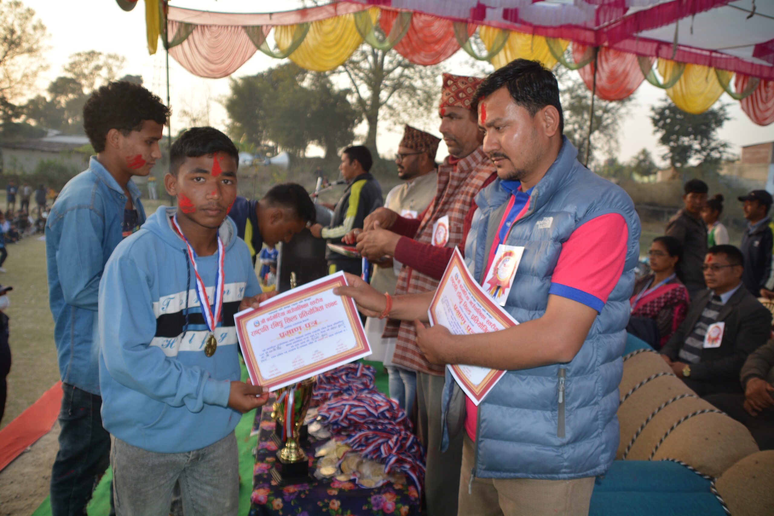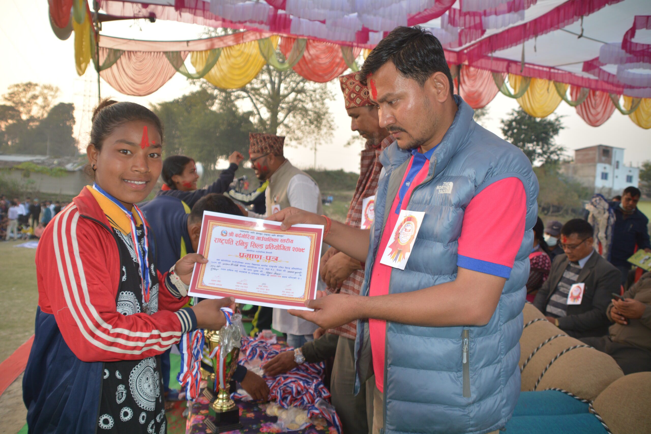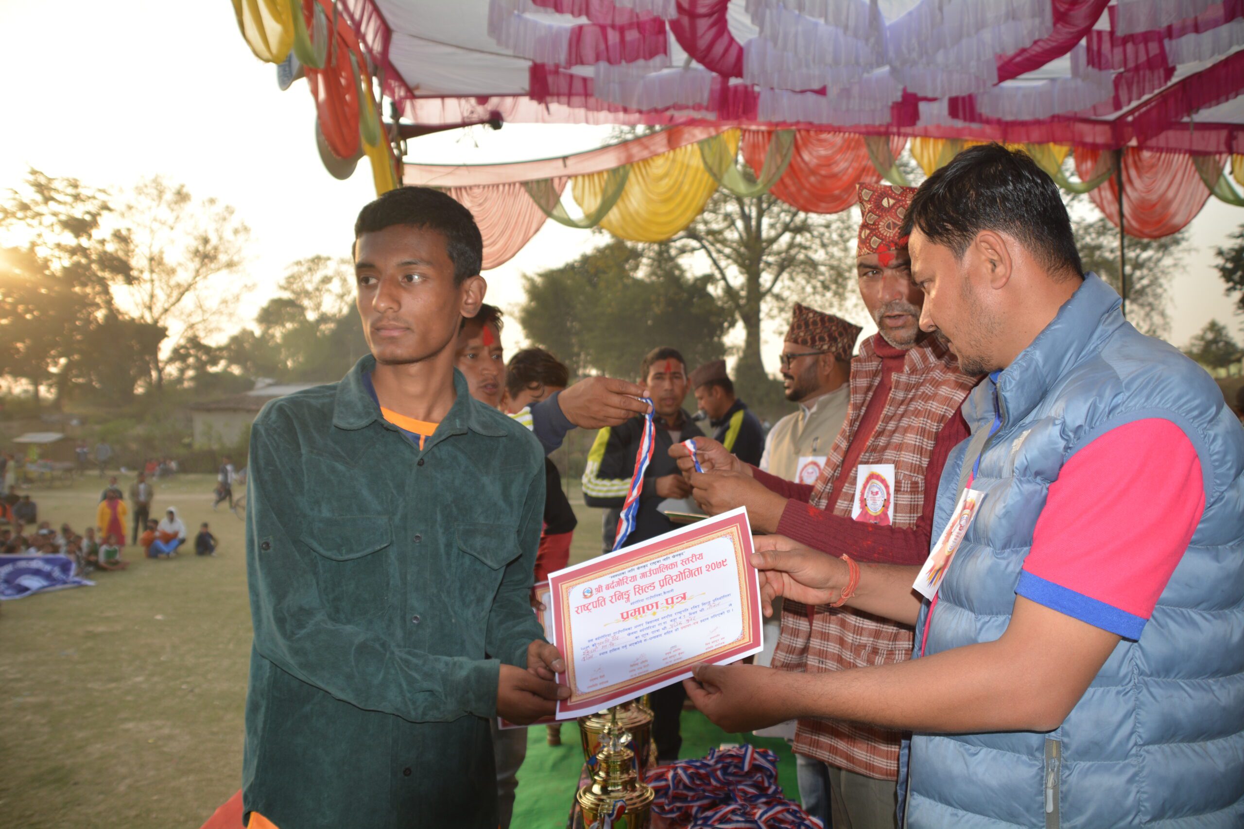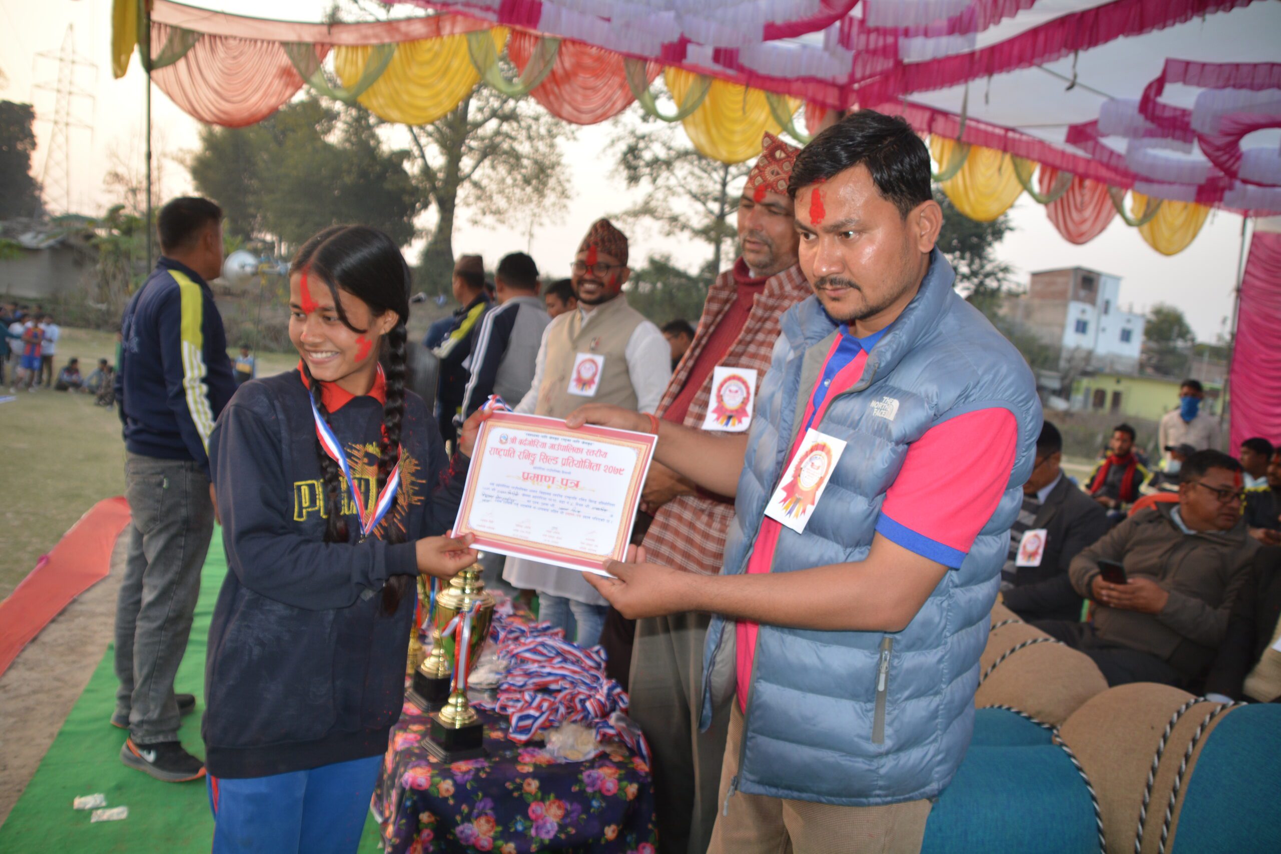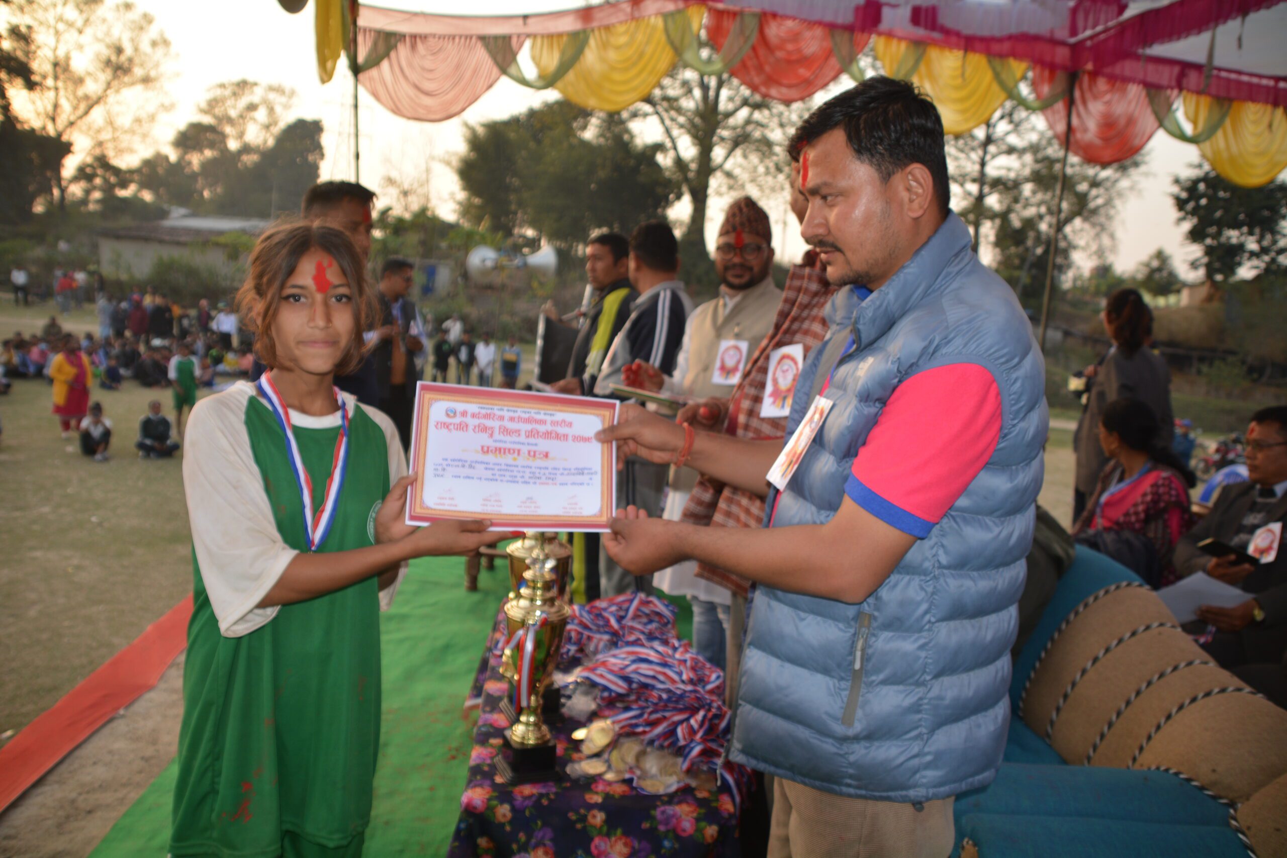 कैलाली । कैलालीको बर्दगोरिया गाउँपालिकामा गत मङ्गलवारबाट सुरु भएको पालिका स्तरीय राष्ट्रपति रनिङ्ग शिल्ड प्रतियोगिता सम्पन्न भएको छ । प्रतियोगितामा कक्षा ६ देखी १२ सम्मका १३ विद्यालयले भाग लिएका थिए । प्रतियोगिताका अधिकांश खेल विद्यालाई वसन्त मुरारी माध्यमिक विद्यालयले कब्जा गरेको छ । १० स्वर्ण, ७ रजत र २ कास्य सहित वसन्त मुरारी प्रथम हुँदा ५ स्वर्ण र ३ कास्य सहित नोबेल एकेडेमी दोस्रो बनेको छ । यस्तै ३ स्वर्ण, ८ रजत र २ कास्य सहित कालिका मा.वि. नौनिया तृतीय बनेको छ । प्रतियोगितामा मा.वि. कोटातुल्सीपुरले ३ स्वर्ण, ४ रजत र ७ कास्य हात पारेको छ । जगदम्बिके भगवती मा.वि. खैरेनीले ३ स्वर्ण, ४ रजत र ४ कास्य, महुन्याल मा.वि. बासकोटीले ३ स्वर्ण, २ रजत र ४ कास्य, बालकन्या मा.वि. कट्टीपुरले २ स्वर्ण, २ रजत र ७ कास्य र न्यु वालवाटीका मा.वि. बौनियाँले १ स्वर्ण, २ रजत र ३ कास्य हात पारेको छ । यस्तै द सनराईज मा.वि.बौनियाँले २ रजत र १ कास्य, आदर्श सामुदायिक मा.वि.ले १ कास्य, र माइकी मिडियमले १ कास्य प्राप्त गरेका छन् । प्रतियोगितामा १ सय, २ सय, ४ सय, ८ सय, १ हजार ५ सय र ३ हजार मिटर दौड, कबड्डी, १ सय मिटर र ४ सय मिटर रिले, भलिबल, हाई जम्प, लङ्ग जम्प, सट फुट, त्रिपल जम्प र ज्याइबलिन थ्रो गरी १५ विद्यामा खेल खेलाइएको थियो । जिल्ला स्तरमा हुने राष्ट्रपति रनिङ्ग शिल्डलाई मध्यनजर गरी सञ्चालन गरिएको यस प्रतियोगिताबाट खेलाडी तथा टिम समेट छनौट भएका छन् । हरेक खेल विद्याका प्रथम र द्धितिय हुने टिम तथा खेलाडी जिल्ला स्तरको प्रतियोगितामा सहभागी हुने छन् । यस अघि २०७६ मा जिल्ला स्तरमा भएको प्रतियोगितामा वसन्त मुरारी मा.वि.ले कबड्डी विद्यामा उपाधि हात पारेको थियो ।