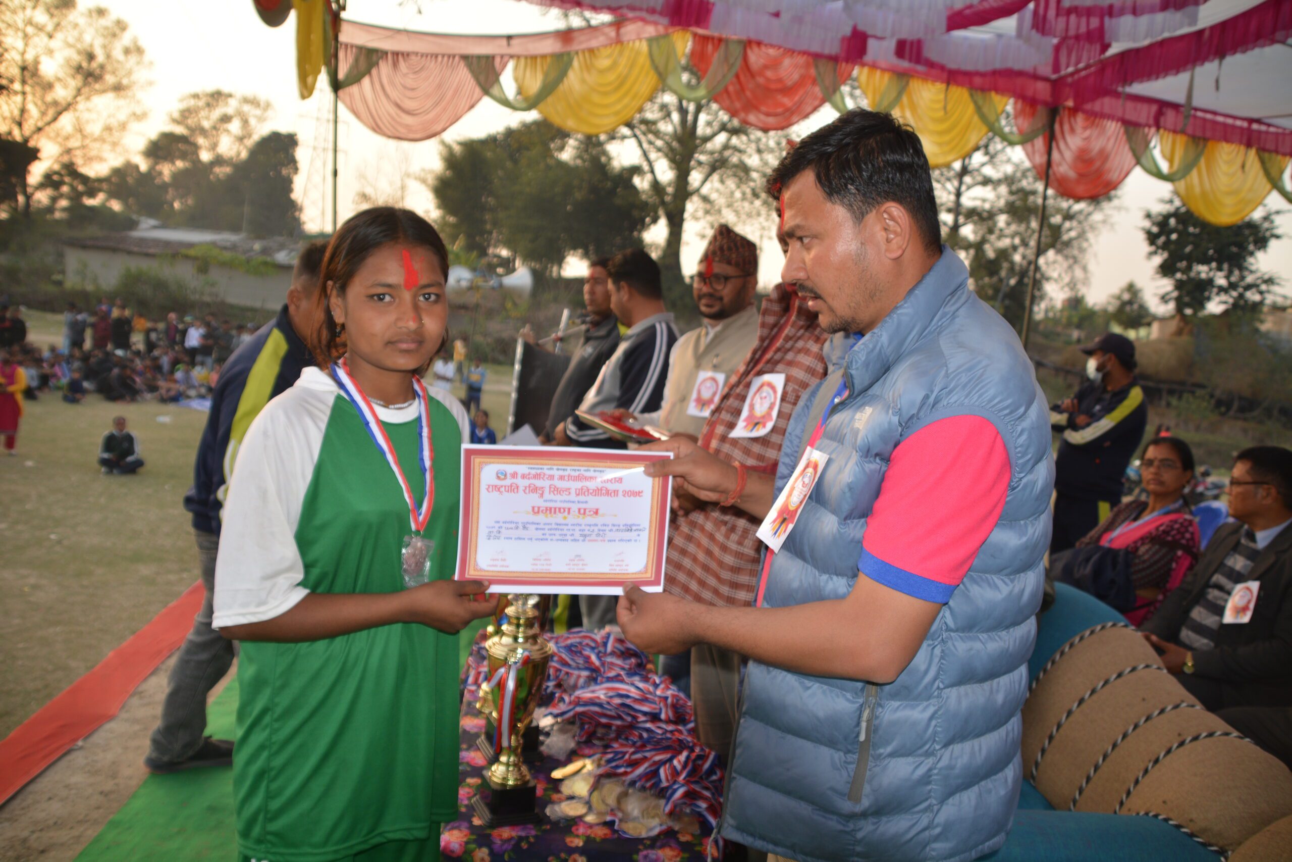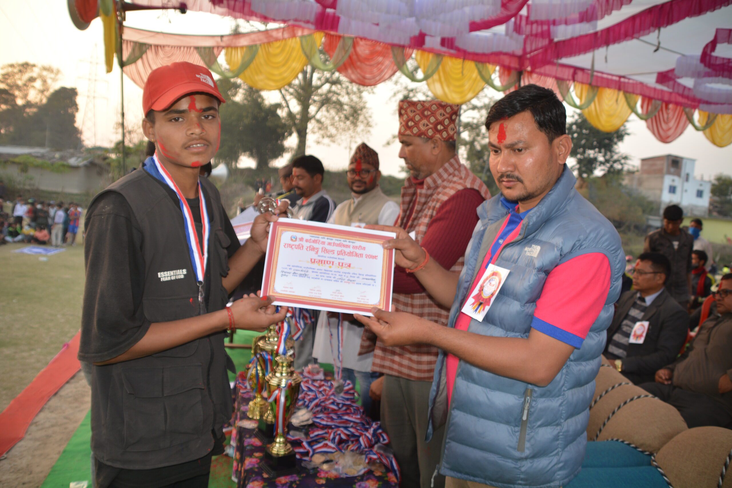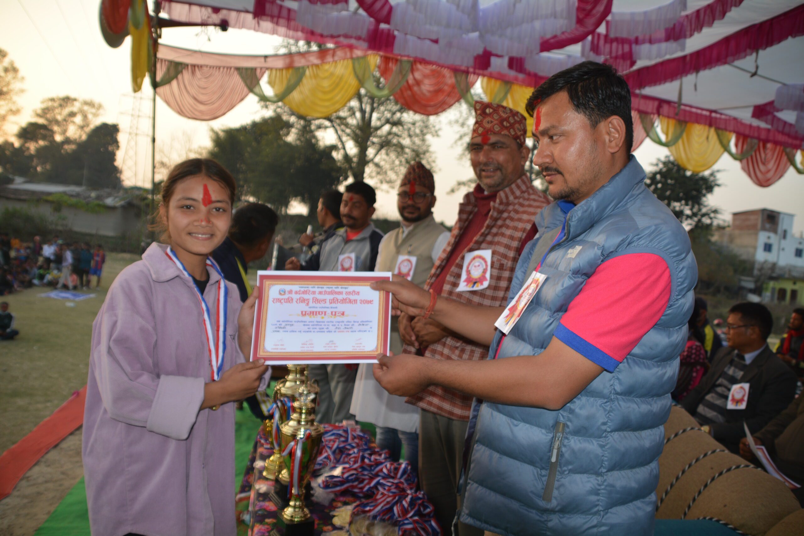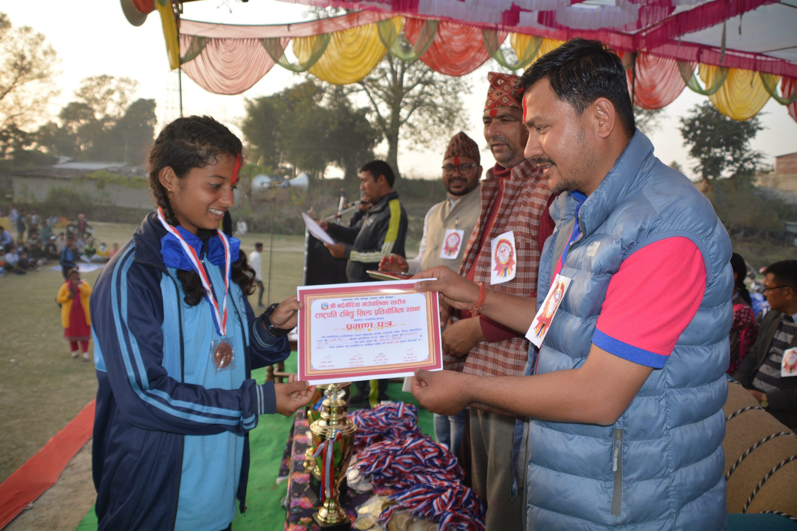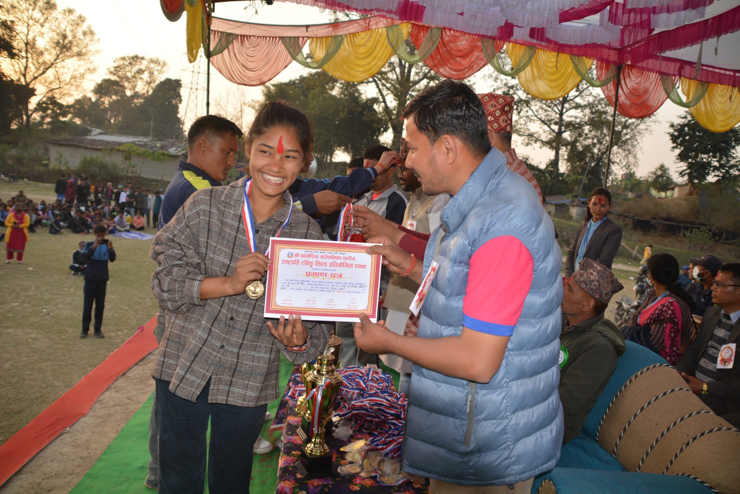 कैलाली । कैलालीको बर्दगोरिया गाउँपालिकामा गत मङ्गलवारबाट सुरु भएको पालिका स्तरीय राष्ट्रपति रनिङ्ग शिल्ड प्रतियोगिता सम्पन्न भएको छ । प्रतियोगितामा कक्षा ६ देखी १२ सम्मका १३ विद्यालयले भाग लिएका थिए । प्रतियोगिताका अधिकांश खेल विद्यालाई वसन्त मुरारी माध्यमिक विद्यालयले कब्जा गरेको छ । १० स्वर्ण, ७ रजत र २ कास्य सहित वसन्त मुरारी प्रथम हुँदा ५ स्वर्ण र ३ कास्य सहित नोबेल एकेडेमी दोस्रो बनेको छ । यस्तै ३ स्वर्ण, ८ रजत र २ कास्य सहित कालिका मा.वि. नौनिया तृतीय बनेको छ । प्रतियोगितामा मा.वि. कोटातुल्सीपुरले ३ स्वर्ण, ४ रजत र ७ कास्य हात पारेको छ । जगदम्बिके भगवती मा.वि. खैरेनीले ३ स्वर्ण, ४ रजत र ४ कास्य, महुन्याल मा.वि. बासकोटीले ३ स्वर्ण, २ रजत र ४ कास्य, बालकन्या मा.वि. कट्टीपुरले २ स्वर्ण, २ रजत र ७ कास्य र न्यु वालवाटीका मा.वि. बौनियाँले १ स्वर्ण, २ रजत र ३ कास्य हात पारेको छ । यस्तै द सनराईज मा.वि.बौनियाँले २ रजत र १ कास्य, आदर्श सामुदायिक मा.वि.ले १ कास्य, र माइकी मिडियमले १ कास्य प्राप्त गरेका छन् । प्रतियोगितामा १ सय, २ सय, ४ सय, ८ सय, १ हजार ५ सय र ३ हजार मिटर दौड, कबड्डी, १ सय मिटर र ४ सय मिटर रिले, भलिबल, हाई जम्प, लङ्ग जम्प, सट फुट, त्रिपल जम्प र ज्याइबलिन थ्रो गरी १५ विद्यामा खेल खेलाइएको थियो । जिल्ला स्तरमा हुने राष्ट्रपति रनिङ्ग शिल्डलाई मध्यनजर गरी सञ्चालन गरिएको यस प्रतियोगिताबाट खेलाडी तथा टिम समेट छनौट भएका छन् । हरेक खेल विद्याका प्रथम र द्धितिय हुने टिम तथा खेलाडी जिल्ला स्तरको प्रतियोगितामा सहभागी हुने छन् । यस अघि २०७६ मा जिल्ला स्तरमा भएको प्रतियोगितामा वसन्त मुरारी मा.वि.ले कबड्डी विद्यामा उपाधि हात पारेको थियो ।