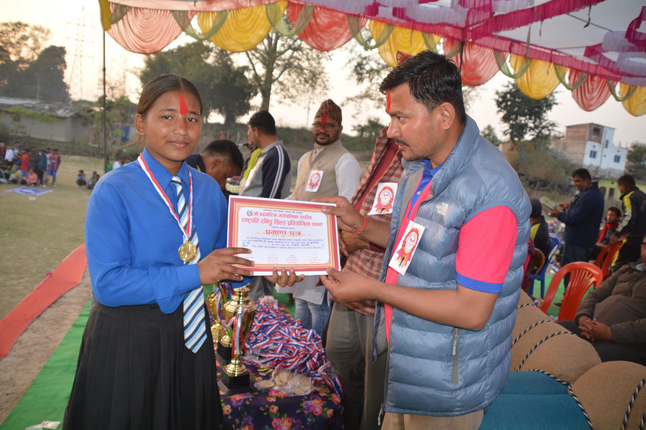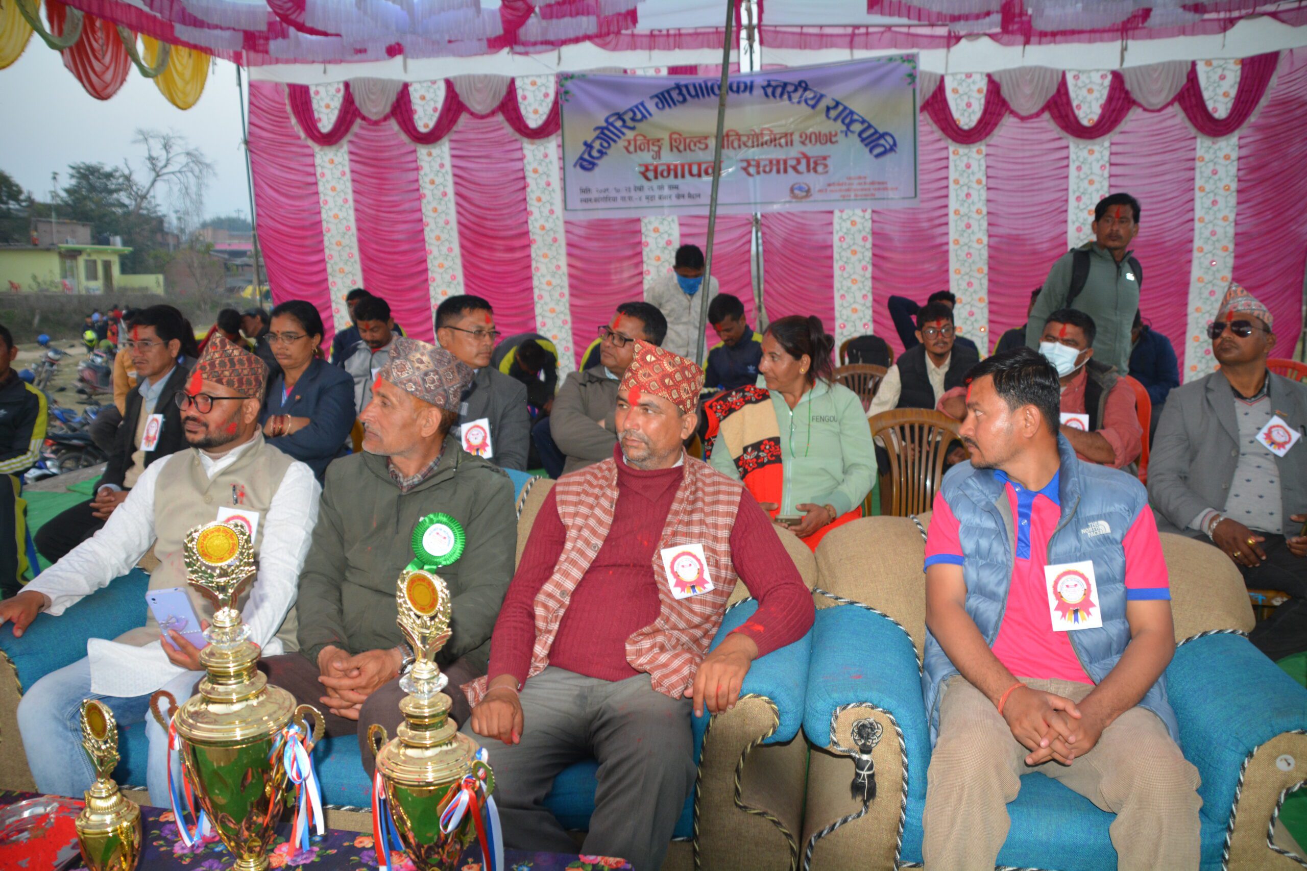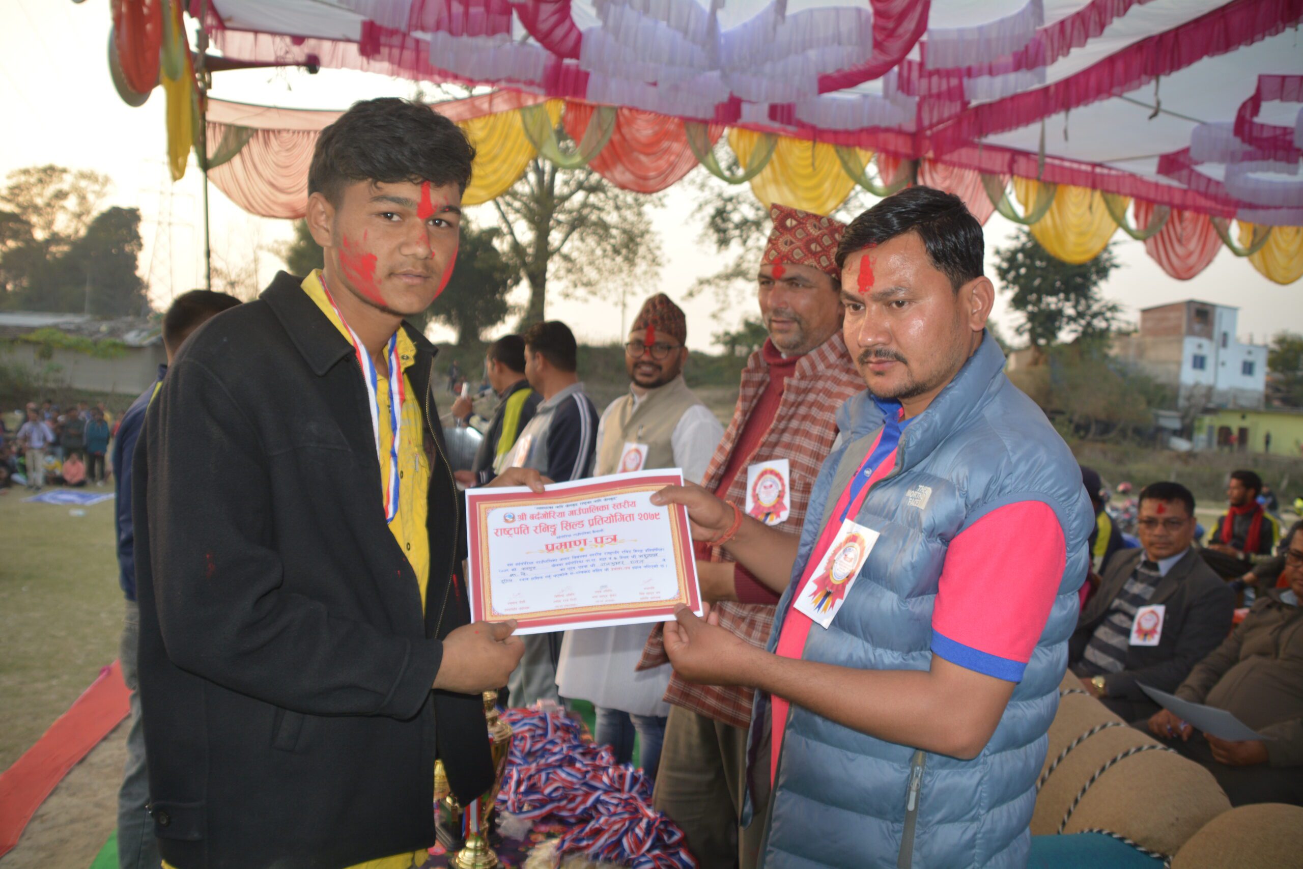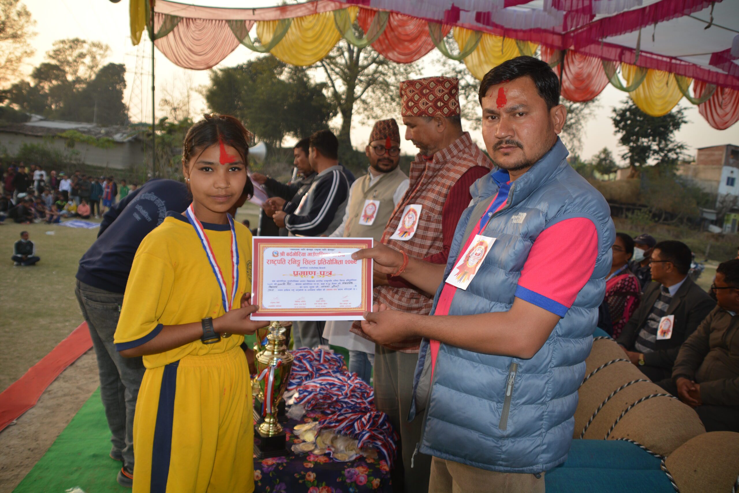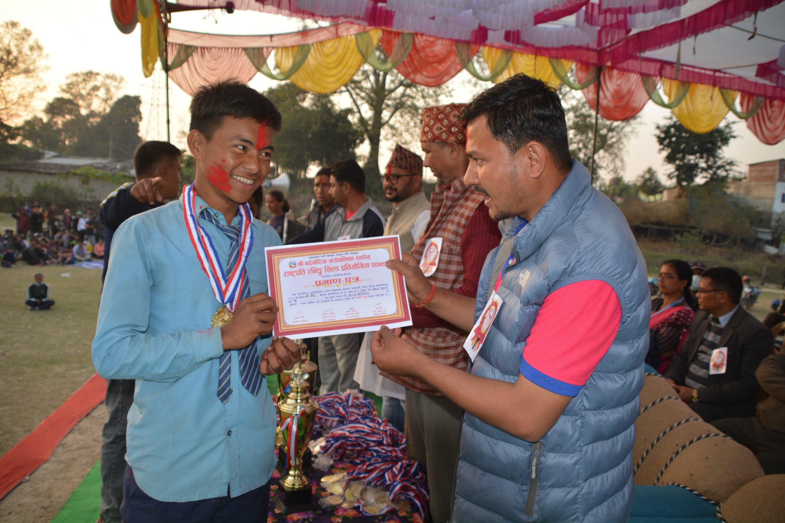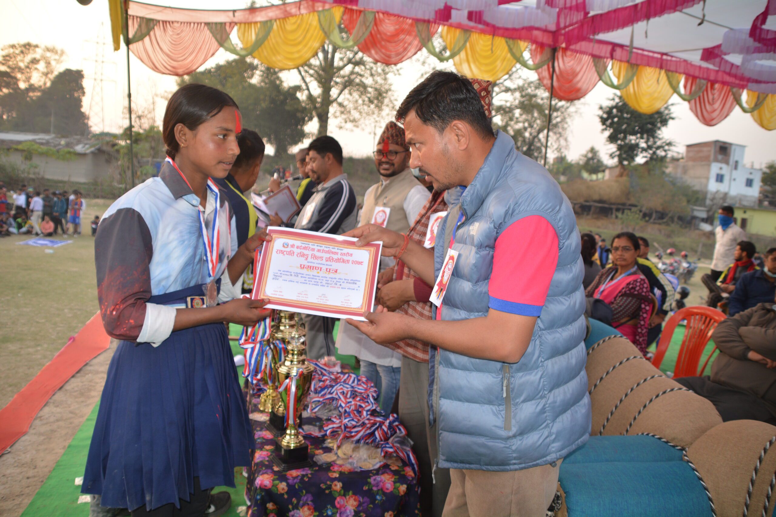 कैलाली । कैलालीको बर्दगोरिया गाउँपालिकामा गत मङ्गलवारबाट सुरु भएको पालिका स्तरीय राष्ट्रपति रनिङ्ग शिल्ड प्रतियोगिता सम्पन्न भएको छ । प्रतियोगितामा कक्षा ६ देखी १२ सम्मका १३ विद्यालयले भाग लिएका थिए । प्रतियोगिताका अधिकांश खेल विद्यालाई वसन्त मुरारी माध्यमिक विद्यालयले कब्जा गरेको छ । १० स्वर्ण, ७ रजत र २ कास्य सहित वसन्त मुरारी प्रथम हुँदा ५ स्वर्ण र ३ कास्य सहित नोबेल एकेडेमी दोस्रो बनेको छ । यस्तै ३ स्वर्ण, ८ रजत र २ कास्य सहित कालिका मा.वि. नौनिया तृतीय बनेको छ । प्रतियोगितामा मा.वि. कोटातुल्सीपुरले ३ स्वर्ण, ४ रजत र ७ कास्य हात पारेको छ । जगदम्बिके भगवती मा.वि. खैरेनीले ३ स्वर्ण, ४ रजत र ४ कास्य, महुन्याल मा.वि. बासकोटीले ३ स्वर्ण, २ रजत र ४ कास्य, बालकन्या मा.वि. कट्टीपुरले २ स्वर्ण, २ रजत र ७ कास्य र न्यु वालवाटीका मा.वि. बौनियाँले १ स्वर्ण, २ रजत र ३ कास्य हात पारेको छ । यस्तै द सनराईज मा.वि.बौनियाँले २ रजत र १ कास्य, आदर्श सामुदायिक मा.वि.ले १ कास्य, र माइकी मिडियमले १ कास्य प्राप्त गरेका छन् । प्रतियोगितामा १ सय, २ सय, ४ सय, ८ सय, १ हजार ५ सय र ३ हजार मिटर दौड, कबड्डी, १ सय मिटर र ४ सय मिटर रिले, भलिबल, हाई जम्प, लङ्ग जम्प, सट फुट, त्रिपल जम्प र ज्याइबलिन थ्रो गरी १५ विद्यामा खेल खेलाइएको थियो । जिल्ला स्तरमा हुने राष्ट्रपति रनिङ्ग शिल्डलाई मध्यनजर गरी सञ्चालन गरिएको यस प्रतियोगिताबाट खेलाडी तथा टिम समेट छनौट भएका छन् । हरेक खेल विद्याका प्रथम र द्धितिय हुने टिम तथा खेलाडी जिल्ला स्तरको प्रतियोगितामा सहभागी हुने छन् । यस अघि २०७६ मा जिल्ला स्तरमा भएको प्रतियोगितामा वसन्त मुरारी मा.वि.ले कबड्डी विद्यामा उपाधि हात पारेको थियो ।