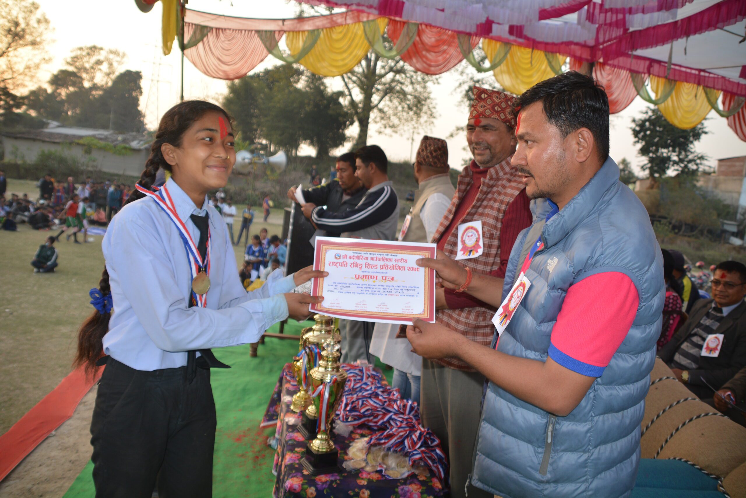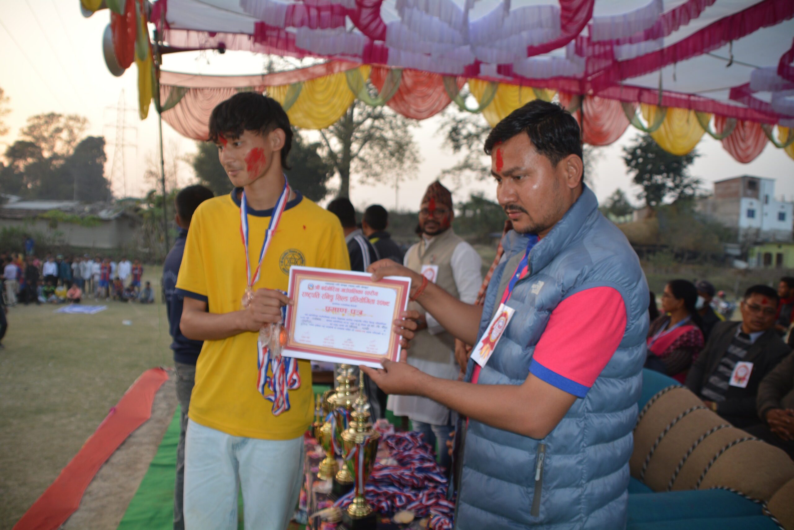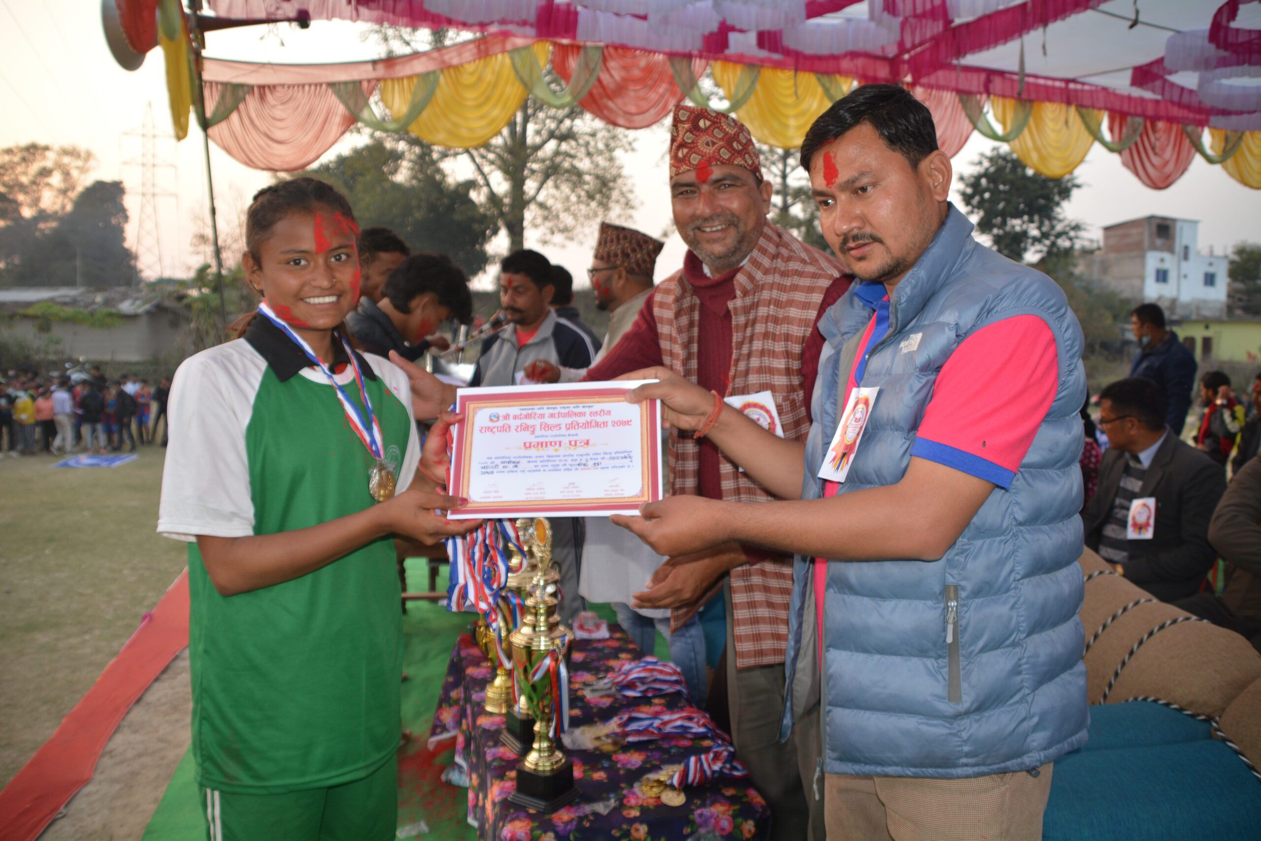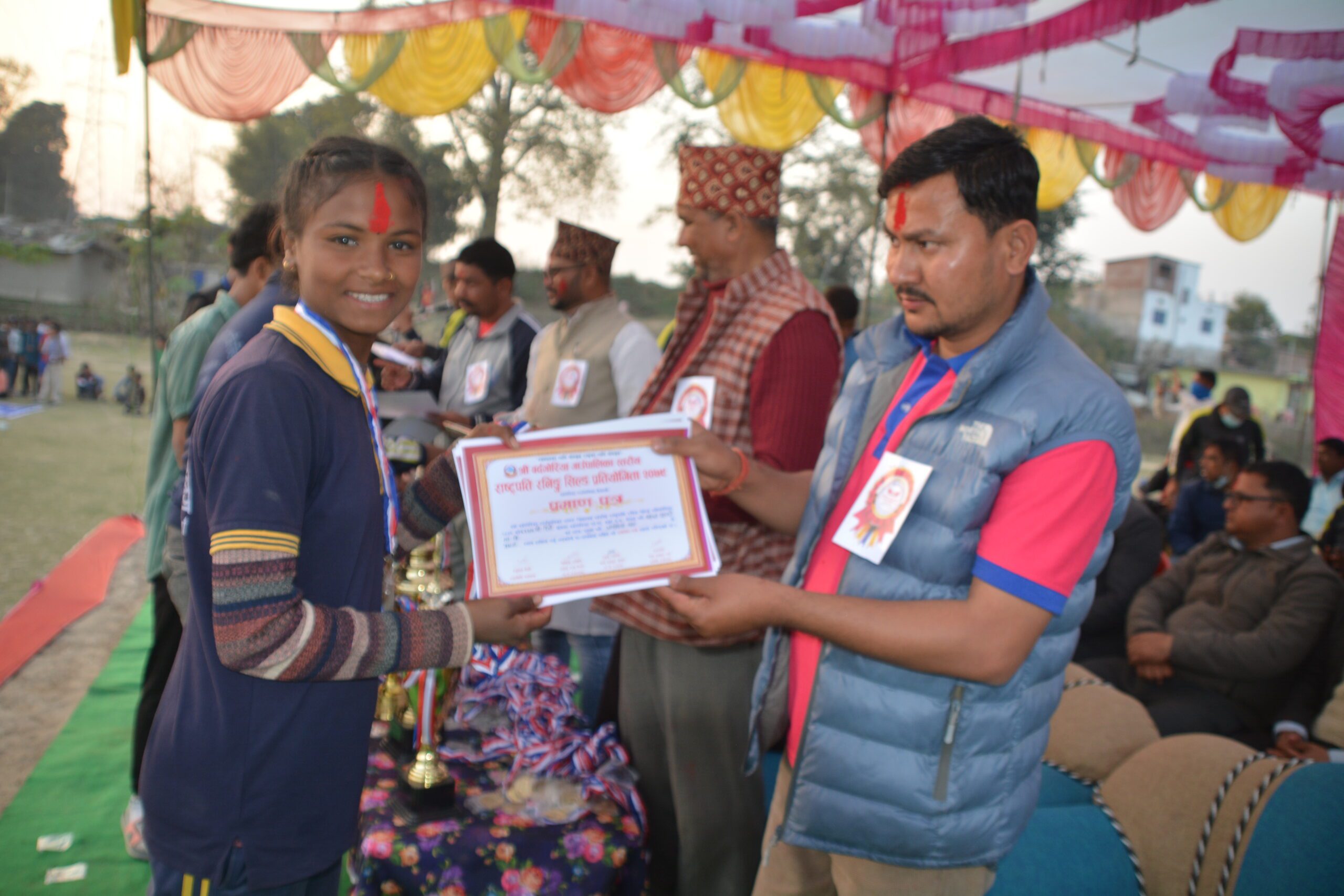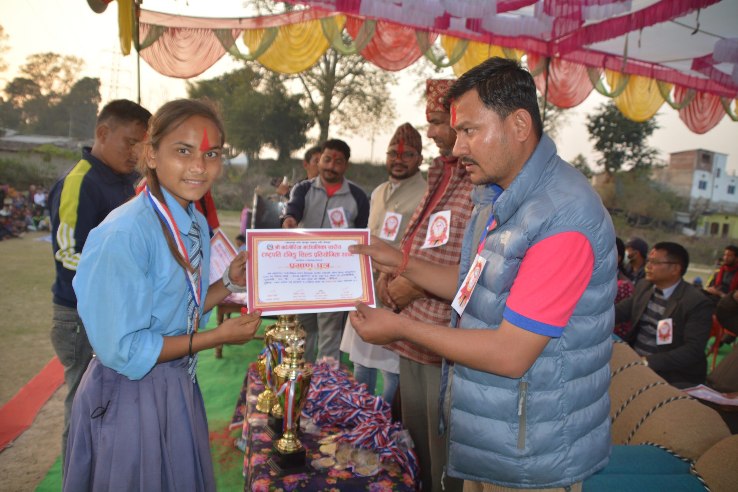 कैलाली । कैलालीको बर्दगोरिया गाउँपालिकामा गत मङ्गलवारबाट सुरु भएको पालिका स्तरीय राष्ट्रपति रनिङ्ग शिल्ड प्रतियोगिता सम्पन्न भएको छ । प्रतियोगितामा कक्षा ६ देखी १२ सम्मका १३ विद्यालयले भाग लिएका थिए । प्रतियोगिताका अधिकांश खेल विद्यालाई वसन्त मुरारी माध्यमिक विद्यालयले कब्जा गरेको छ । १० स्वर्ण, ७ रजत र २ कास्य सहित वसन्त मुरारी प्रथम हुँदा ५ स्वर्ण र ३ कास्य सहित नोबेल एकेडेमी दोस्रो बनेको छ । यस्तै ३ स्वर्ण, ८ रजत र २ कास्य सहित कालिका मा.वि. नौनिया तृतीय बनेको छ । प्रतियोगितामा मा.वि. कोटातुल्सीपुरले ३ स्वर्ण, ४ रजत र ७ कास्य हात पारेको छ । जगदम्बिके भगवती मा.वि. खैरेनीले ३ स्वर्ण, ४ रजत र ४ कास्य, महुन्याल मा.वि. बासकोटीले ३ स्वर्ण, २ रजत र ४ कास्य, बालकन्या मा.वि. कट्टीपुरले २ स्वर्ण, २ रजत र ७ कास्य र न्यु वालवाटीका मा.वि. बौनियाँले १ स्वर्ण, २ रजत र ३ कास्य हात पारेको छ । यस्तै द सनराईज मा.वि.बौनियाँले २ रजत र १ कास्य, आदर्श सामुदायिक मा.वि.ले १ कास्य, र माइकी मिडियमले १ कास्य प्राप्त गरेका छन् । प्रतियोगितामा १ सय, २ सय, ४ सय, ८ सय, १ हजार ५ सय र ३ हजार मिटर दौड, कबड्डी, १ सय मिटर र ४ सय मिटर रिले, भलिबल, हाई जम्प, लङ्ग जम्प, सट फुट, त्रिपल जम्प र ज्याइबलिन थ्रो गरी १५ विद्यामा खेल खेलाइएको थियो । जिल्ला स्तरमा हुने राष्ट्रपति रनिङ्ग शिल्डलाई मध्यनजर गरी सञ्चालन गरिएको यस प्रतियोगिताबाट खेलाडी तथा टिम समेट छनौट भएका छन् । हरेक खेल विद्याका प्रथम र द्धितिय हुने टिम तथा खेलाडी जिल्ला स्तरको प्रतियोगितामा सहभागी हुने छन् । यस अघि २०७६ मा जिल्ला स्तरमा भएको प्रतियोगितामा वसन्त मुरारी मा.वि.ले कबड्डी विद्यामा उपाधि हात पारेको थियो ।