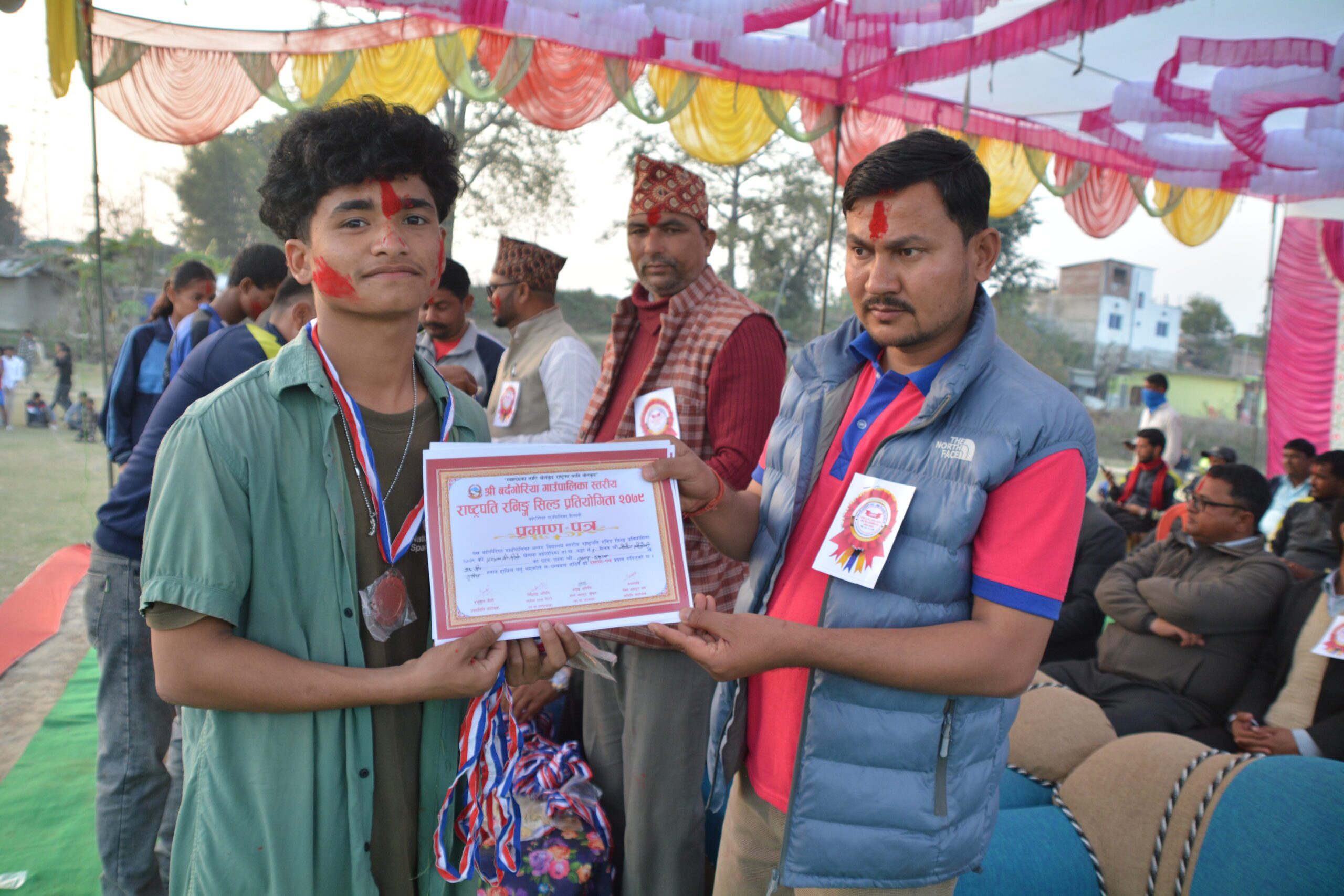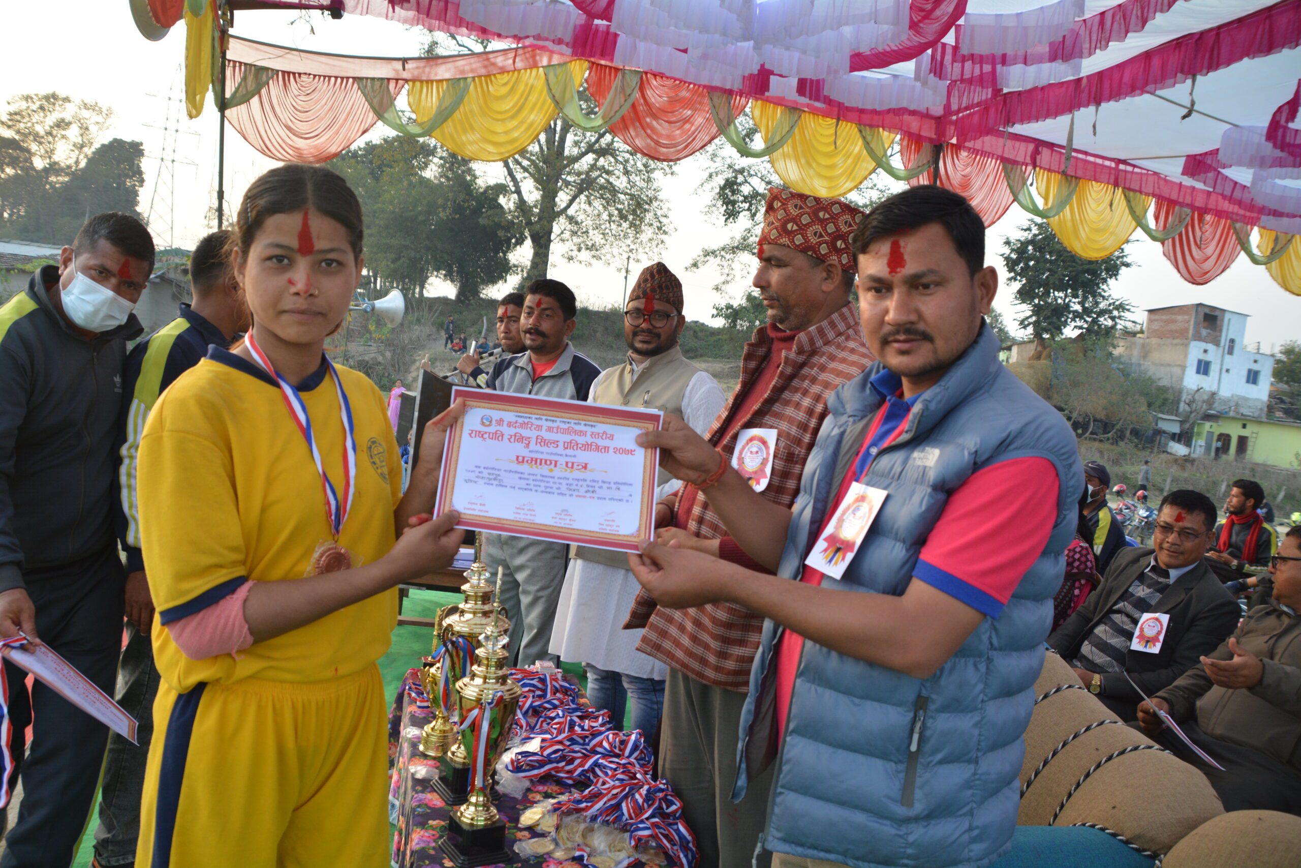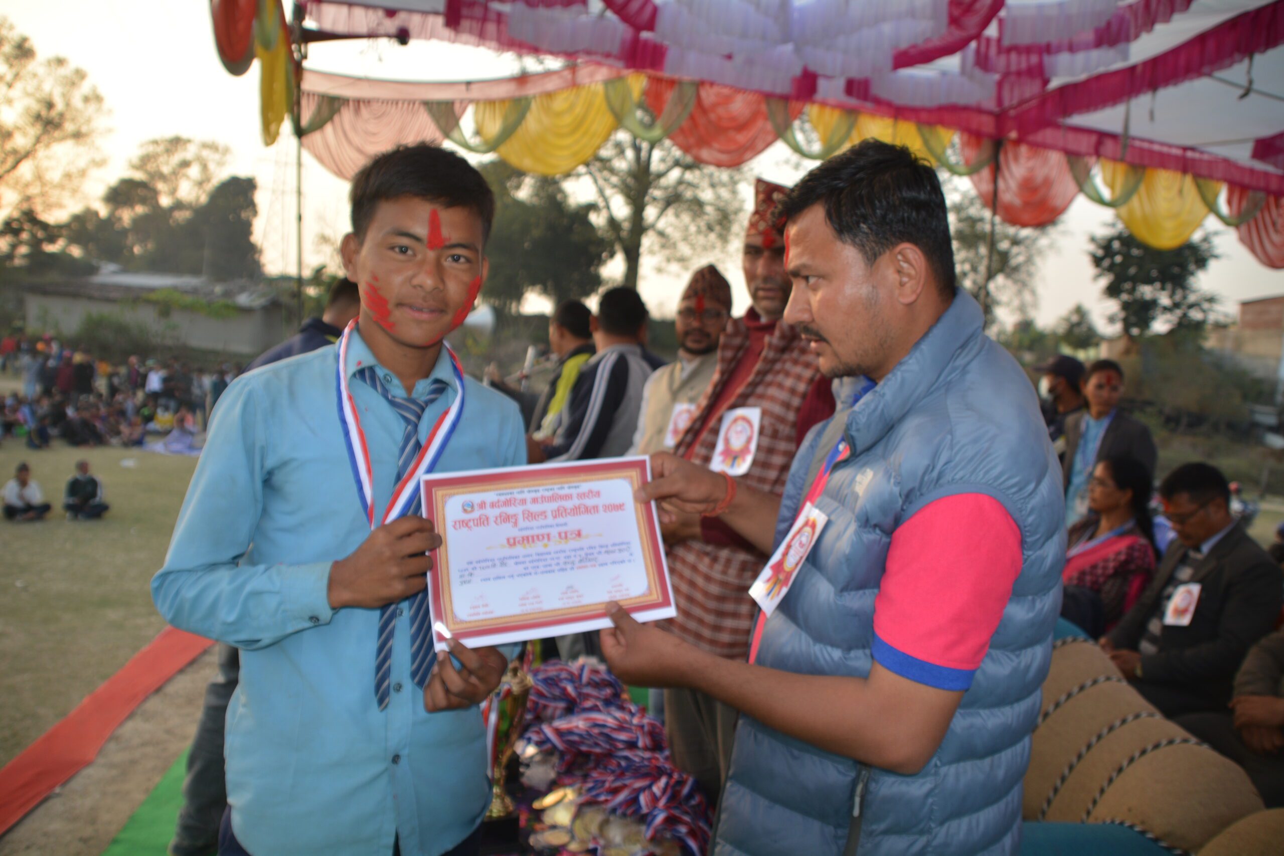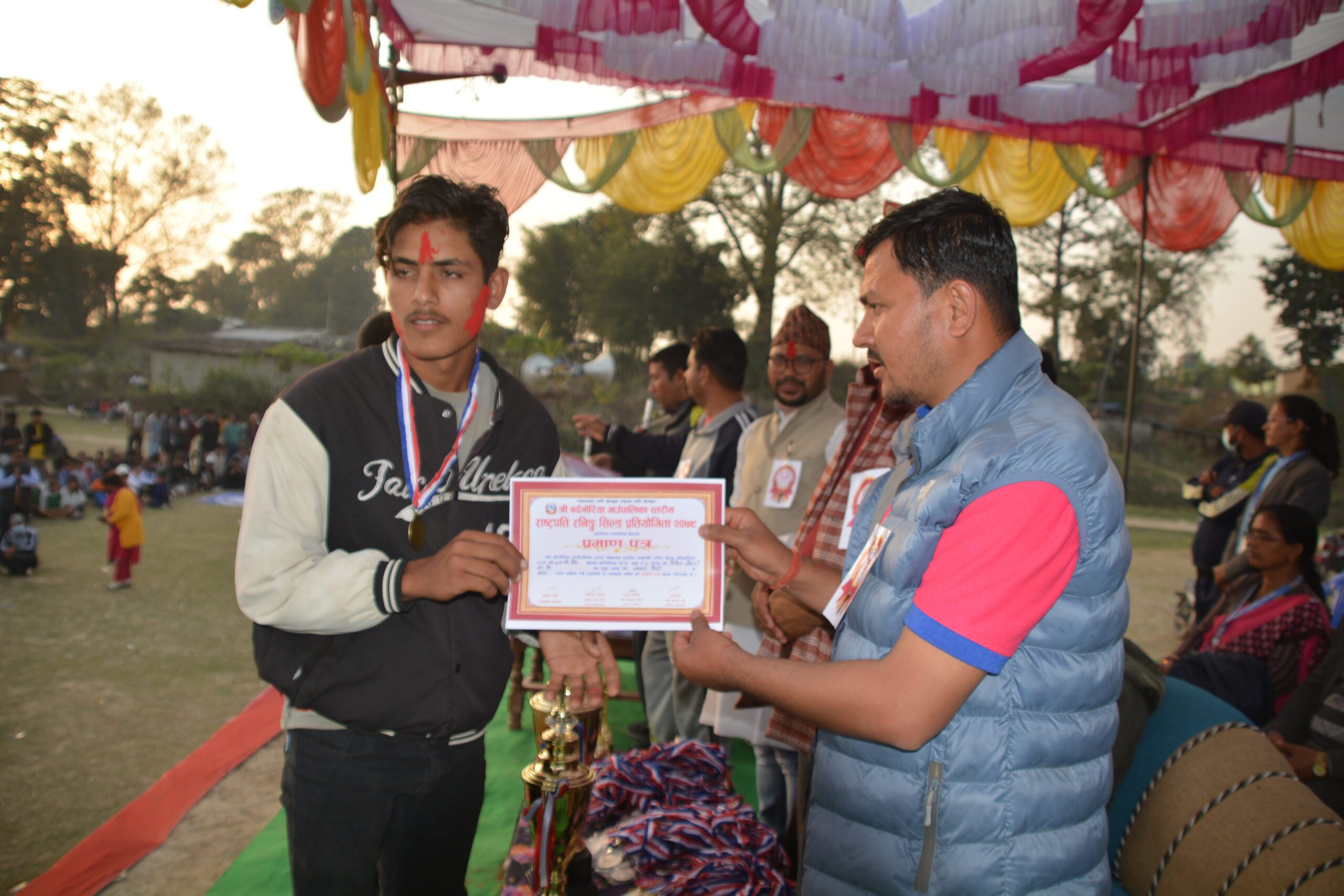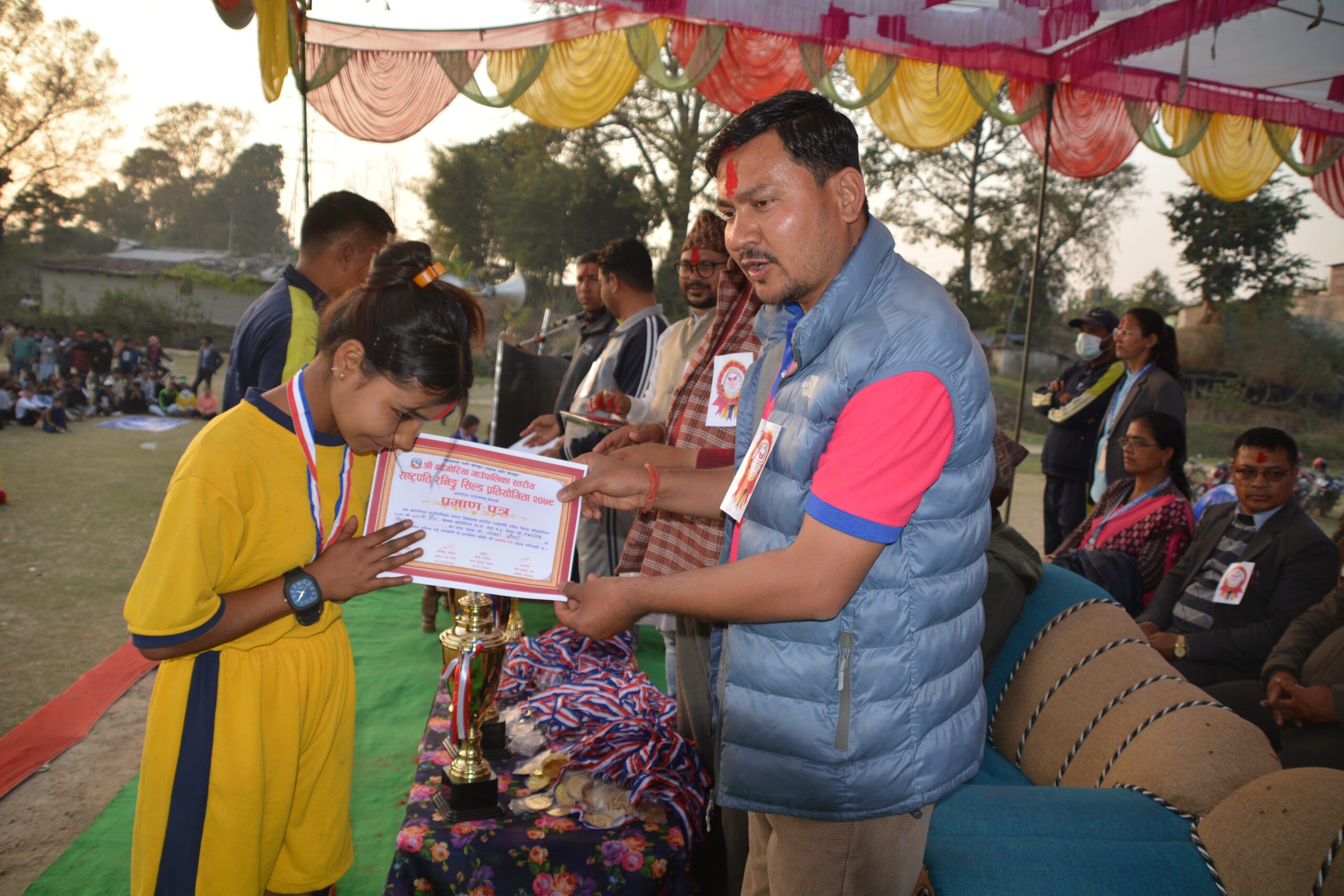 कैलाली । कैलालीको बर्दगोरिया गाउँपालिकामा गत मङ्गलवारबाट सुरु भएको पालिका स्तरीय राष्ट्रपति रनिङ्ग शिल्ड प्रतियोगिता सम्पन्न भएको छ । प्रतियोगितामा कक्षा ६ देखी १२ सम्मका १३ विद्यालयले भाग लिएका थिए । प्रतियोगिताका अधिकांश खेल विद्यालाई वसन्त मुरारी माध्यमिक विद्यालयले कब्जा गरेको छ । १० स्वर्ण, ७ रजत र २ कास्य सहित वसन्त मुरारी प्रथम हुँदा ५ स्वर्ण र ३ कास्य सहित नोबेल एकेडेमी दोस्रो बनेको छ । यस्तै ३ स्वर्ण, ८ रजत र २ कास्य सहित कालिका मा.वि. नौनिया तृतीय बनेको छ । प्रतियोगितामा मा.वि. कोटातुल्सीपुरले ३ स्वर्ण, ४ रजत र ७ कास्य हात पारेको छ । जगदम्बिके भगवती मा.वि. खैरेनीले ३ स्वर्ण, ४ रजत र ४ कास्य, महुन्याल मा.वि. बासकोटीले ३ स्वर्ण, २ रजत र ४ कास्य, बालकन्या मा.वि. कट्टीपुरले २ स्वर्ण, २ रजत र ७ कास्य र न्यु वालवाटीका मा.वि. बौनियाँले १ स्वर्ण, २ रजत र ३ कास्य हात पारेको छ । यस्तै द सनराईज मा.वि.बौनियाँले २ रजत र १ कास्य, आदर्श सामुदायिक मा.वि.ले १ कास्य, र माइकी मिडियमले १ कास्य प्राप्त गरेका छन् । प्रतियोगितामा १ सय, २ सय, ४ सय, ८ सय, १ हजार ५ सय र ३ हजार मिटर दौड, कबड्डी, १ सय मिटर र ४ सय मिटर रिले, भलिबल, हाई जम्प, लङ्ग जम्प, सट फुट, त्रिपल जम्प र ज्याइबलिन थ्रो गरी १५ विद्यामा खेल खेलाइएको थियो । जिल्ला स्तरमा हुने राष्ट्रपति रनिङ्ग शिल्डलाई मध्यनजर गरी सञ्चालन गरिएको यस प्रतियोगिताबाट खेलाडी तथा टिम समेट छनौट भएका छन् । हरेक खेल विद्याका प्रथम र द्धितिय हुने टिम तथा खेलाडी जिल्ला स्तरको प्रतियोगितामा सहभागी हुने छन् । यस अघि २०७६ मा जिल्ला स्तरमा भएको प्रतियोगितामा वसन्त मुरारी मा.वि.ले कबड्डी विद्यामा उपाधि हात पारेको थियो ।