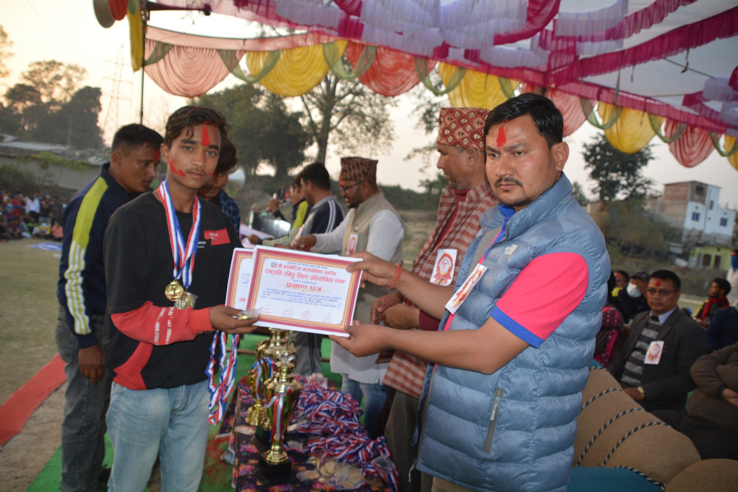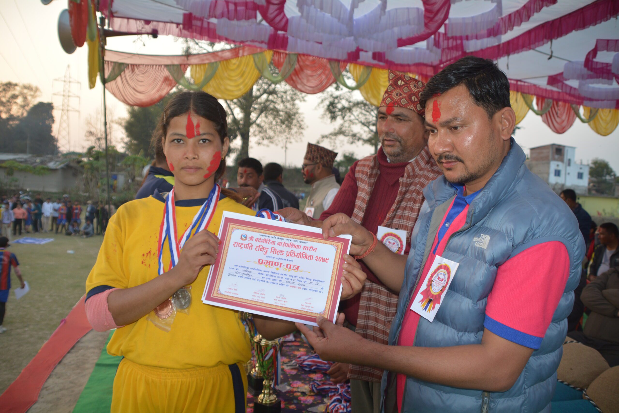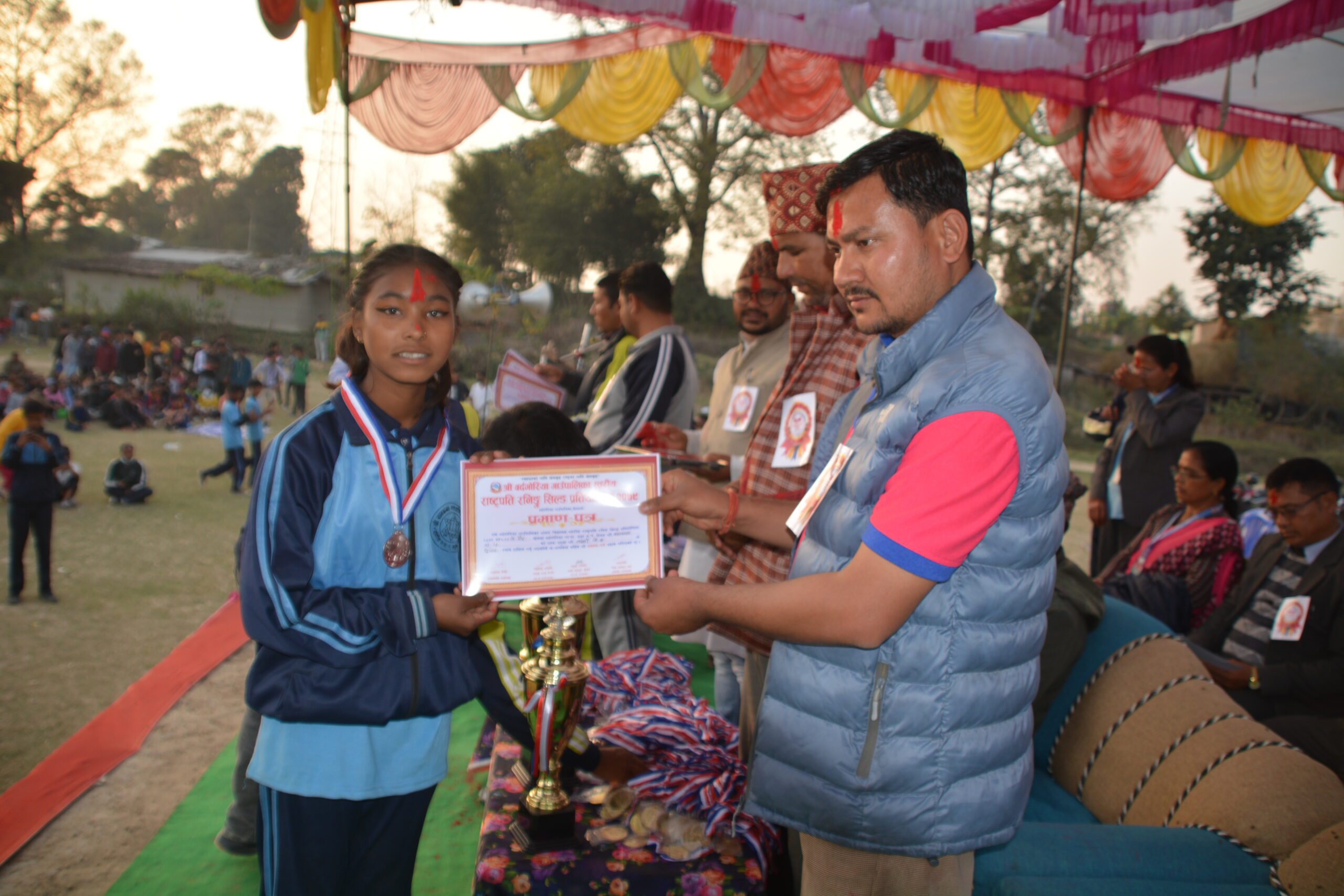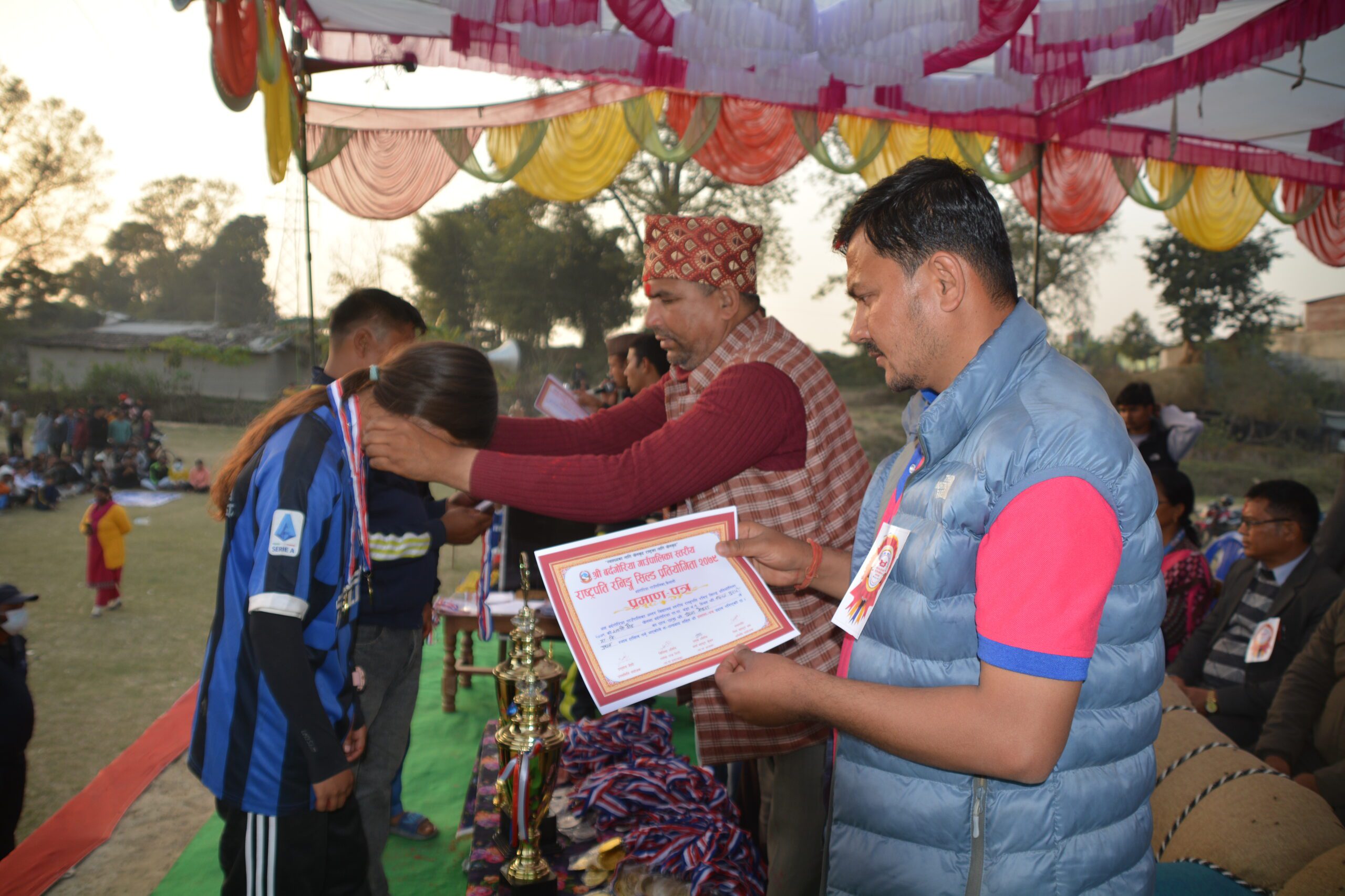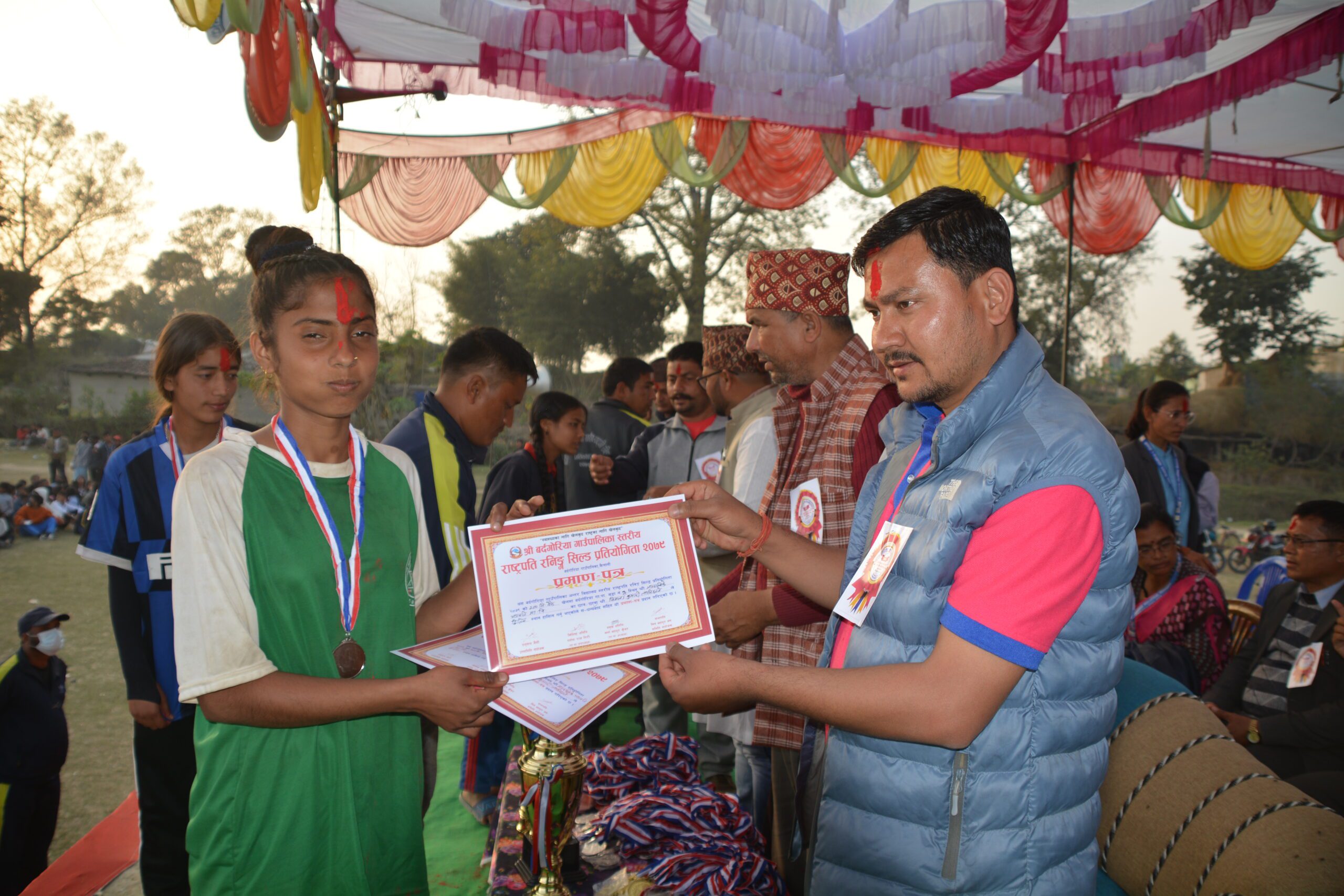 कैलाली । कैलालीको बर्दगोरिया गाउँपालिकामा गत मङ्गलवारबाट सुरु भएको पालिका स्तरीय राष्ट्रपति रनिङ्ग शिल्ड प्रतियोगिता सम्पन्न भएको छ । प्रतियोगितामा कक्षा ६ देखी १२ सम्मका १३ विद्यालयले भाग लिएका थिए । प्रतियोगिताका अधिकांश खेल विद्यालाई वसन्त मुरारी माध्यमिक विद्यालयले कब्जा गरेको छ । १० स्वर्ण, ७ रजत र २ कास्य सहित वसन्त मुरारी प्रथम हुँदा ५ स्वर्ण र ३ कास्य सहित नोबेल एकेडेमी दोस्रो बनेको छ । यस्तै ३ स्वर्ण, ८ रजत र २ कास्य सहित कालिका मा.वि. नौनिया तृतीय बनेको छ । प्रतियोगितामा मा.वि. कोटातुल्सीपुरले ३ स्वर्ण, ४ रजत र ७ कास्य हात पारेको छ । जगदम्बिके भगवती मा.वि. खैरेनीले ३ स्वर्ण, ४ रजत र ४ कास्य, महुन्याल मा.वि. बासकोटीले ३ स्वर्ण, २ रजत र ४ कास्य, बालकन्या मा.वि. कट्टीपुरले २ स्वर्ण, २ रजत र ७ कास्य र न्यु वालवाटीका मा.वि. बौनियाँले १ स्वर्ण, २ रजत र ३ कास्य हात पारेको छ । यस्तै द सनराईज मा.वि.बौनियाँले २ रजत र १ कास्य, आदर्श सामुदायिक मा.वि.ले १ कास्य, र माइकी मिडियमले १ कास्य प्राप्त गरेका छन् । प्रतियोगितामा १ सय, २ सय, ४ सय, ८ सय, १ हजार ५ सय र ३ हजार मिटर दौड, कबड्डी, १ सय मिटर र ४ सय मिटर रिले, भलिबल, हाई जम्प, लङ्ग जम्प, सट फुट, त्रिपल जम्प र ज्याइबलिन थ्रो गरी १५ विद्यामा खेल खेलाइएको थियो । जिल्ला स्तरमा हुने राष्ट्रपति रनिङ्ग शिल्डलाई मध्यनजर गरी सञ्चालन गरिएको यस प्रतियोगिताबाट खेलाडी तथा टिम समेट छनौट भएका छन् । हरेक खेल विद्याका प्रथम र द्धितिय हुने टिम तथा खेलाडी जिल्ला स्तरको प्रतियोगितामा सहभागी हुने छन् । यस अघि २०७६ मा जिल्ला स्तरमा भएको प्रतियोगितामा वसन्त मुरारी मा.वि.ले कबड्डी विद्यामा उपाधि हात पारेको थियो ।