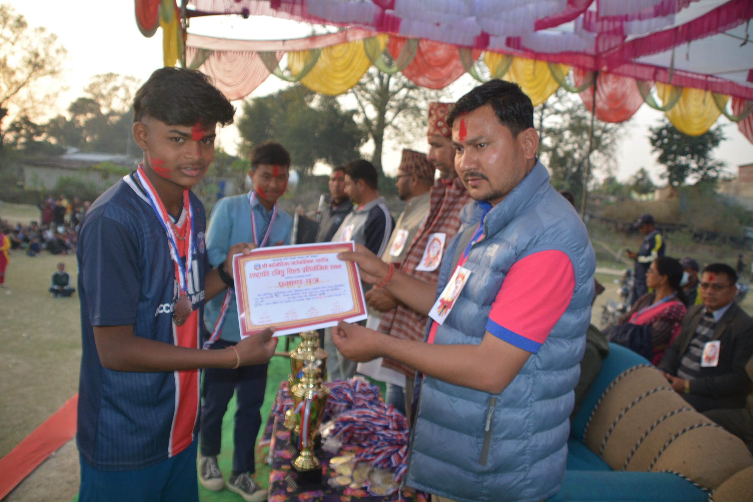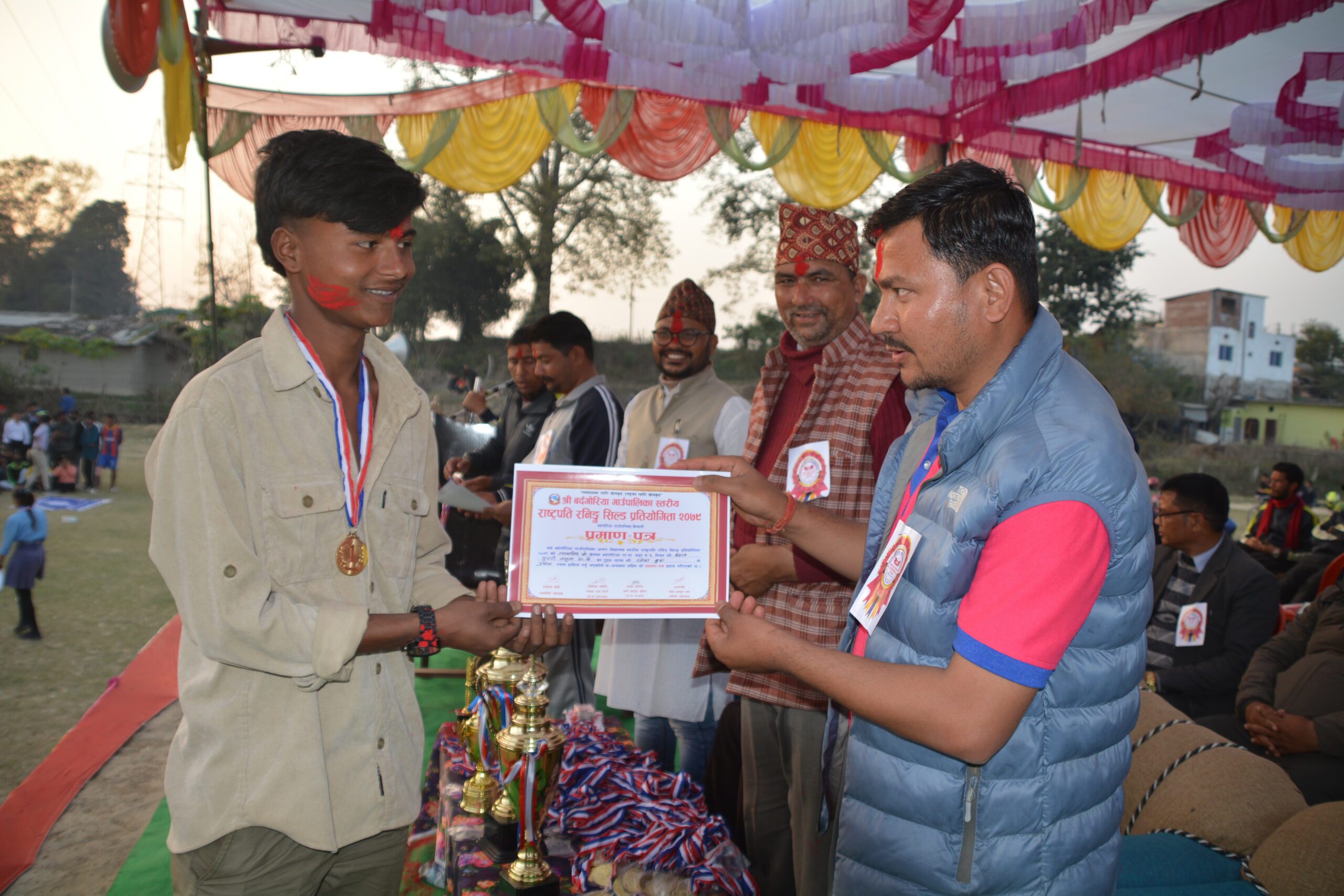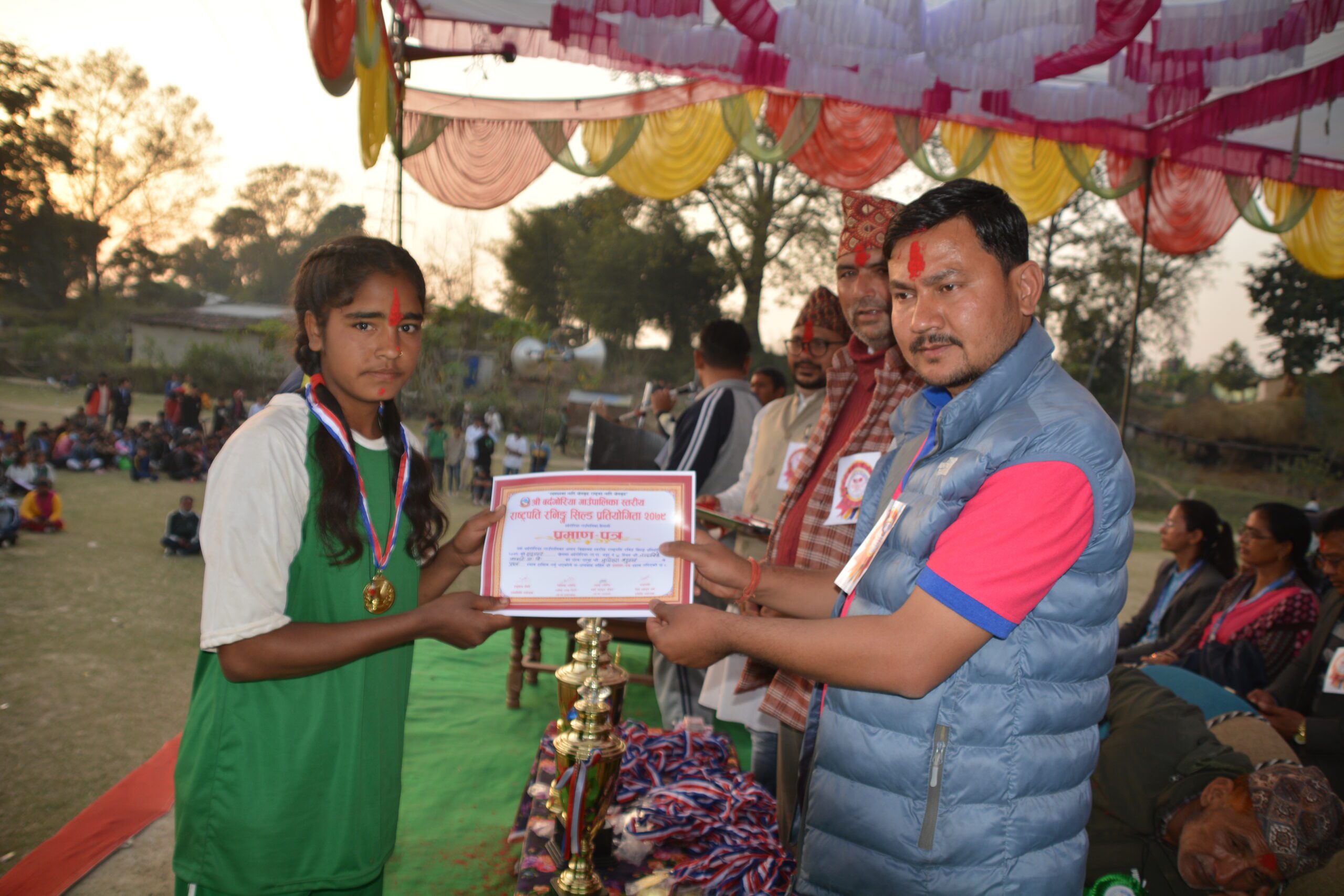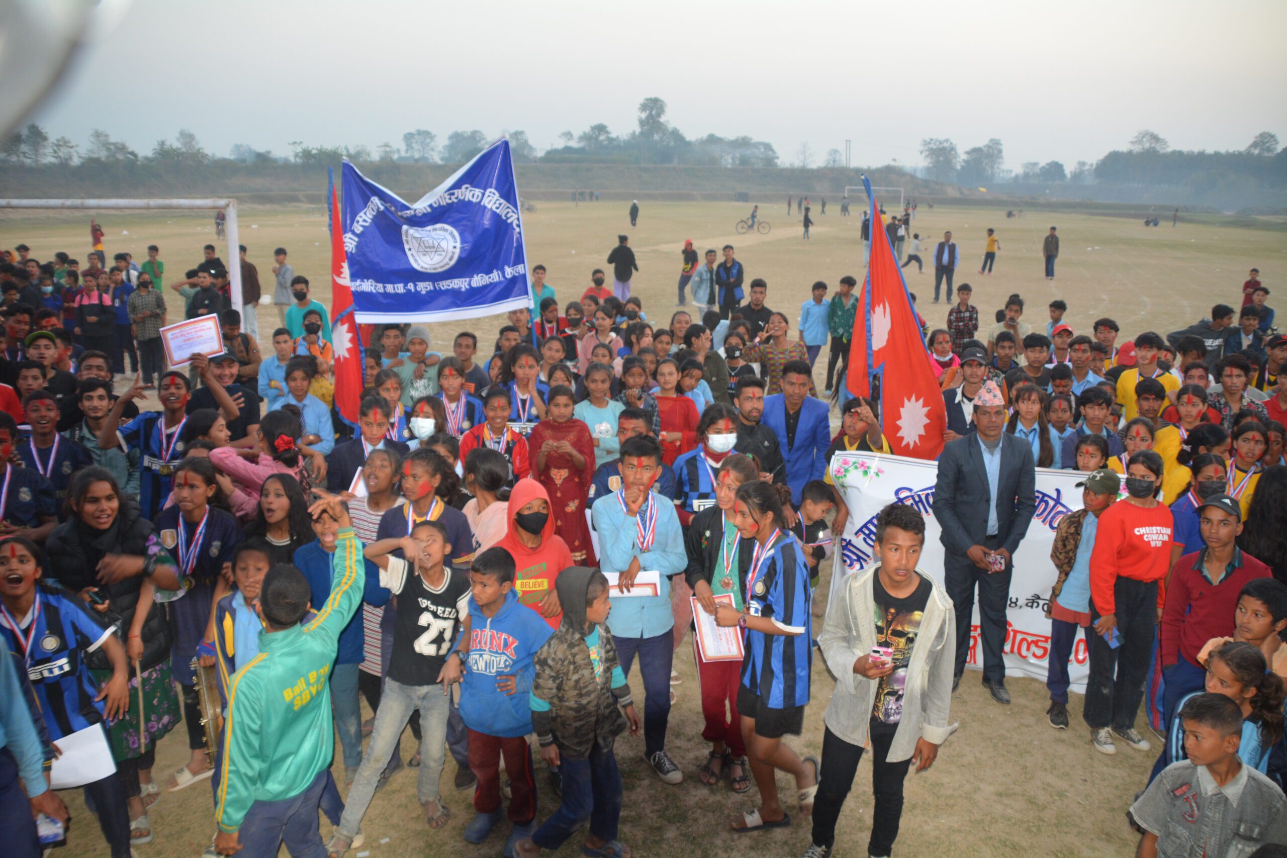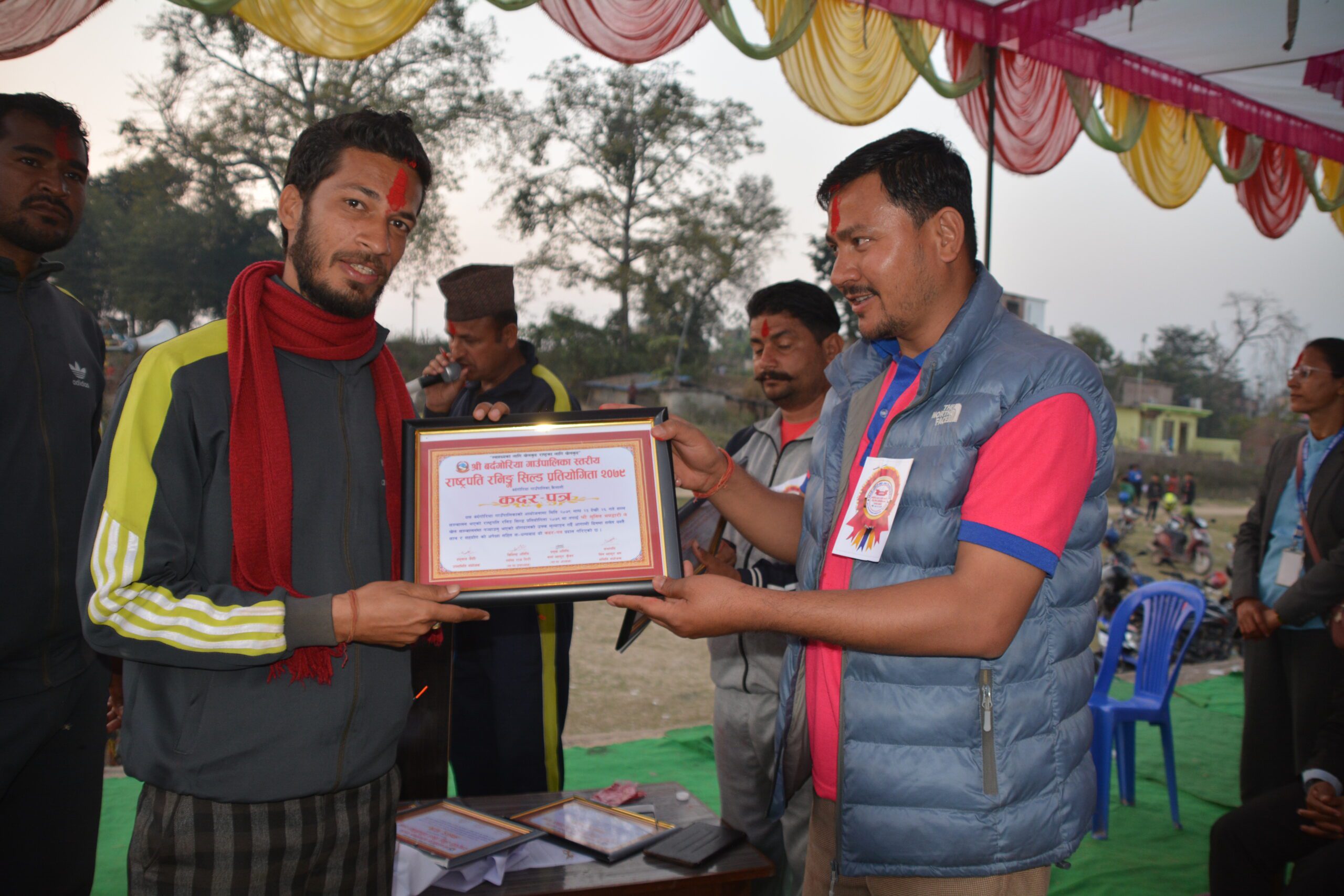 कैलाली । कैलालीको बर्दगोरिया गाउँपालिकामा गत मङ्गलवारबाट सुरु भएको पालिका स्तरीय राष्ट्रपति रनिङ्ग शिल्ड प्रतियोगिता सम्पन्न भएको छ । प्रतियोगितामा कक्षा ६ देखी १२ सम्मका १३ विद्यालयले भाग लिएका थिए । प्रतियोगिताका अधिकांश खेल विद्यालाई वसन्त मुरारी माध्यमिक विद्यालयले कब्जा गरेको छ । १० स्वर्ण, ७ रजत र २ कास्य सहित वसन्त मुरारी प्रथम हुँदा ५ स्वर्ण र ३ कास्य सहित नोबेल एकेडेमी दोस्रो बनेको छ । यस्तै ३ स्वर्ण, ८ रजत र २ कास्य सहित कालिका मा.वि. नौनिया तृतीय बनेको छ । प्रतियोगितामा मा.वि. कोटातुल्सीपुरले ३ स्वर्ण, ४ रजत र ७ कास्य हात पारेको छ । जगदम्बिके भगवती मा.वि. खैरेनीले ३ स्वर्ण, ४ रजत र ४ कास्य, महुन्याल मा.वि. बासकोटीले ३ स्वर्ण, २ रजत र ४ कास्य, बालकन्या मा.वि. कट्टीपुरले २ स्वर्ण, २ रजत र ७ कास्य र न्यु वालवाटीका मा.वि. बौनियाँले १ स्वर्ण, २ रजत र ३ कास्य हात पारेको छ । यस्तै द सनराईज मा.वि.बौनियाँले २ रजत र १ कास्य, आदर्श सामुदायिक मा.वि.ले १ कास्य, र माइकी मिडियमले १ कास्य प्राप्त गरेका छन् । प्रतियोगितामा १ सय, २ सय, ४ सय, ८ सय, १ हजार ५ सय र ३ हजार मिटर दौड, कबड्डी, १ सय मिटर र ४ सय मिटर रिले, भलिबल, हाई जम्प, लङ्ग जम्प, सट फुट, त्रिपल जम्प र ज्याइबलिन थ्रो गरी १५ विद्यामा खेल खेलाइएको थियो । जिल्ला स्तरमा हुने राष्ट्रपति रनिङ्ग शिल्डलाई मध्यनजर गरी सञ्चालन गरिएको यस प्रतियोगिताबाट खेलाडी तथा टिम समेट छनौट भएका छन् । हरेक खेल विद्याका प्रथम र द्धितिय हुने टिम तथा खेलाडी जिल्ला स्तरको प्रतियोगितामा सहभागी हुने छन् । यस अघि २०७६ मा जिल्ला स्तरमा भएको प्रतियोगितामा वसन्त मुरारी मा.वि.ले कबड्डी विद्यामा उपाधि हात पारेको थियो ।