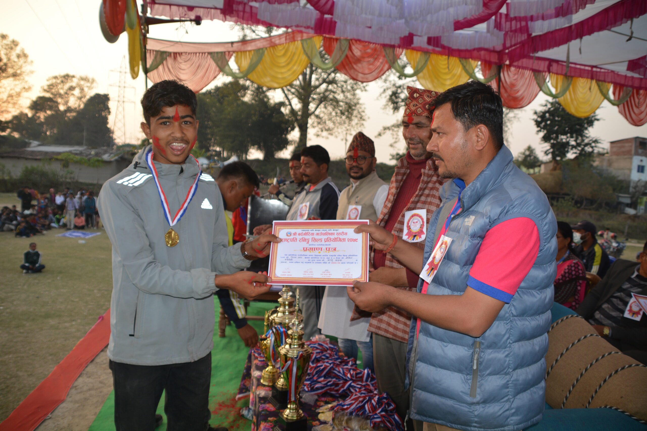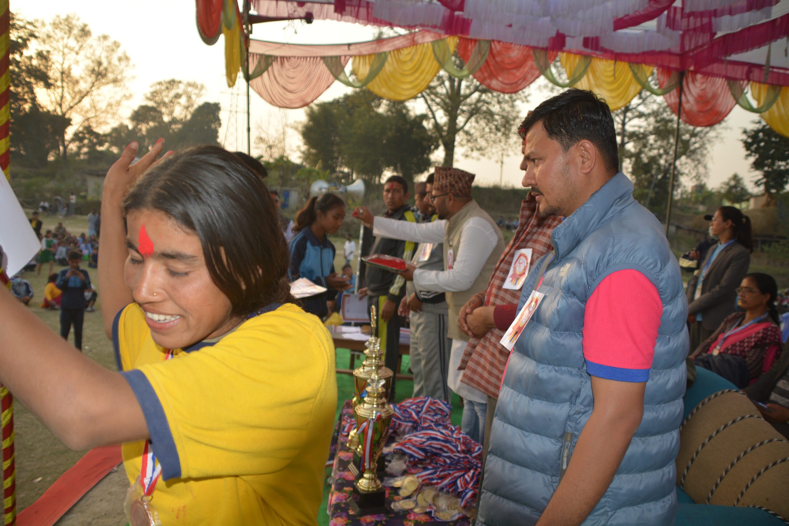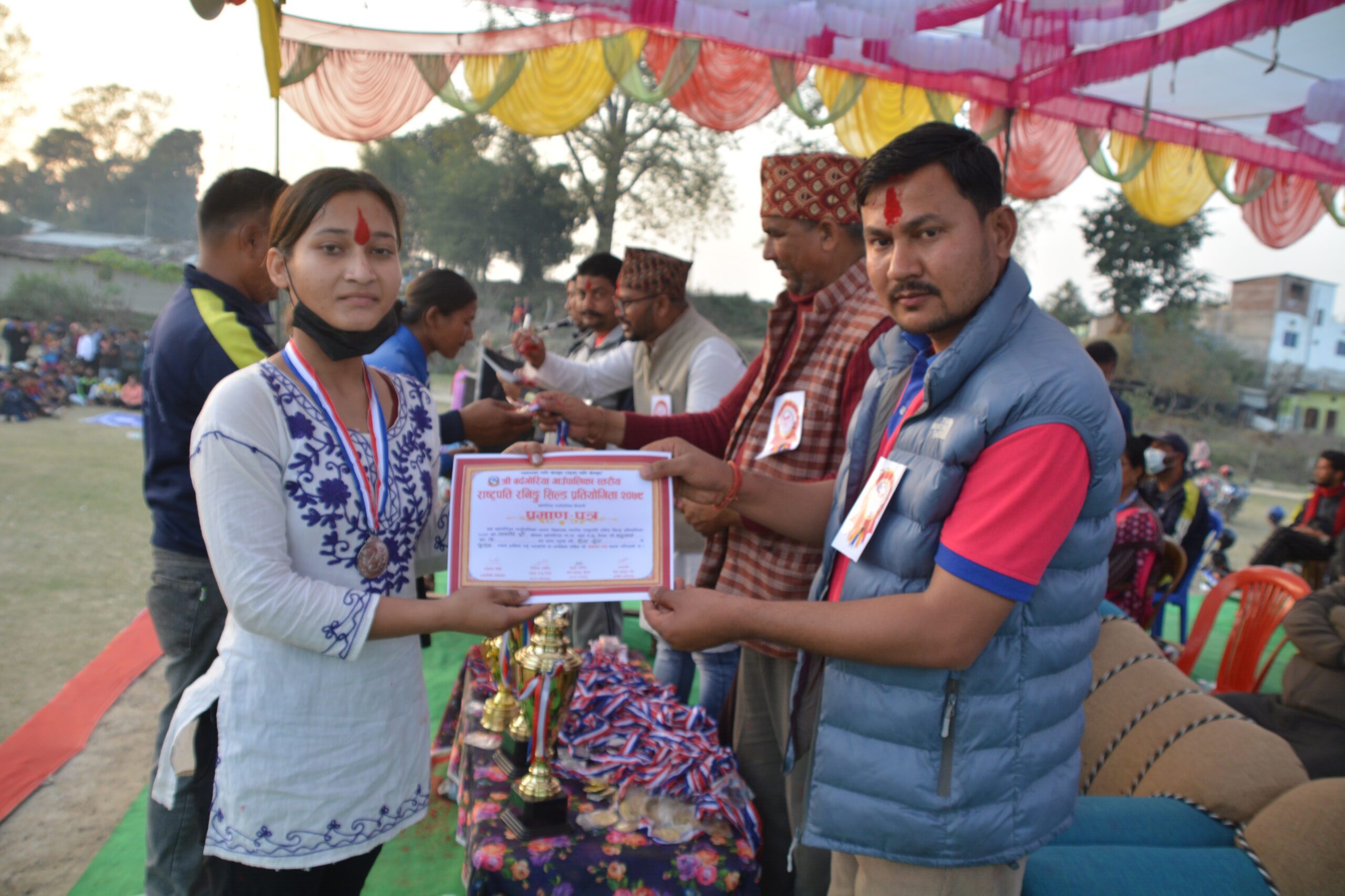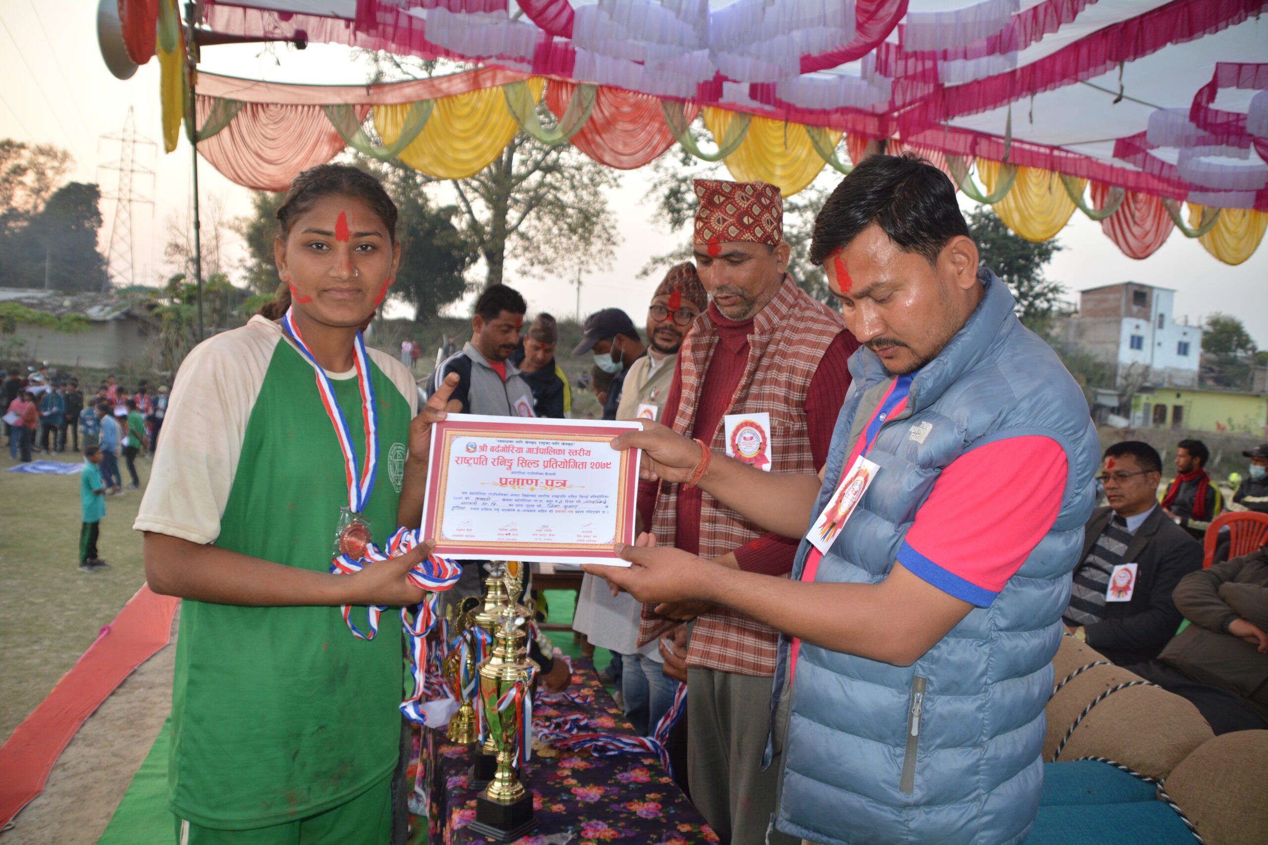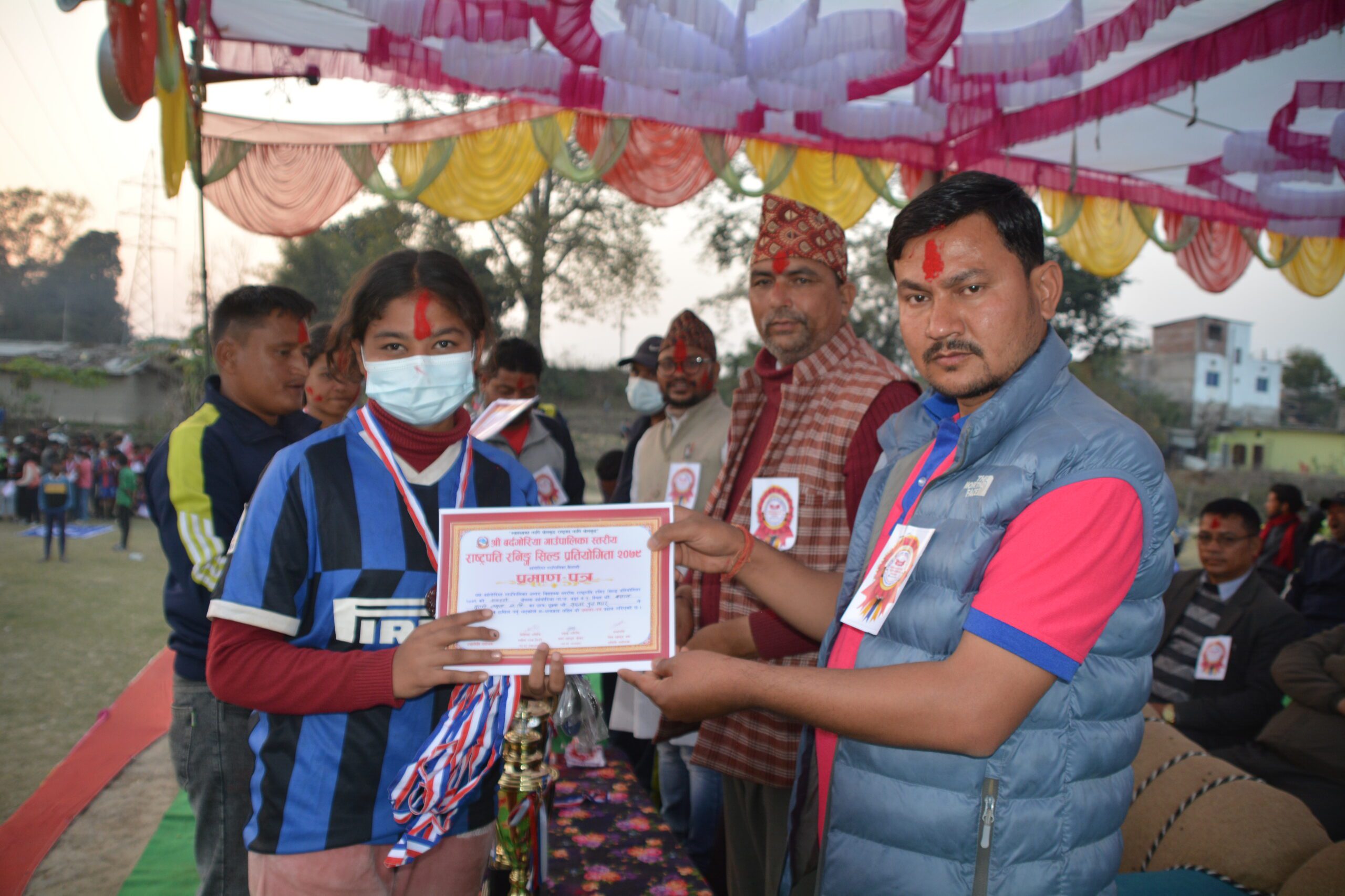 कैलाली । कैलालीको बर्दगोरिया गाउँपालिकामा गत मङ्गलवारबाट सुरु भएको पालिका स्तरीय राष्ट्रपति रनिङ्ग शिल्ड प्रतियोगिता सम्पन्न भएको छ । प्रतियोगितामा कक्षा ६ देखी १२ सम्मका १३ विद्यालयले भाग लिएका थिए । प्रतियोगिताका अधिकांश खेल विद्यालाई वसन्त मुरारी माध्यमिक विद्यालयले कब्जा गरेको छ । १० स्वर्ण, ७ रजत र २ कास्य सहित वसन्त मुरारी प्रथम हुँदा ५ स्वर्ण र ३ कास्य सहित नोबेल एकेडेमी दोस्रो बनेको छ । यस्तै ३ स्वर्ण, ८ रजत र २ कास्य सहित कालिका मा.वि. नौनिया तृतीय बनेको छ । प्रतियोगितामा मा.वि. कोटातुल्सीपुरले ३ स्वर्ण, ४ रजत र ७ कास्य हात पारेको छ । जगदम्बिके भगवती मा.वि. खैरेनीले ३ स्वर्ण, ४ रजत र ४ कास्य, महुन्याल मा.वि. बासकोटीले ३ स्वर्ण, २ रजत र ४ कास्य, बालकन्या मा.वि. कट्टीपुरले २ स्वर्ण, २ रजत र ७ कास्य र न्यु वालवाटीका मा.वि. बौनियाँले १ स्वर्ण, २ रजत र ३ कास्य हात पारेको छ । यस्तै द सनराईज मा.वि.बौनियाँले २ रजत र १ कास्य, आदर्श सामुदायिक मा.वि.ले १ कास्य, र माइकी मिडियमले १ कास्य प्राप्त गरेका छन् । प्रतियोगितामा १ सय, २ सय, ४ सय, ८ सय, १ हजार ५ सय र ३ हजार मिटर दौड, कबड्डी, १ सय मिटर र ४ सय मिटर रिले, भलिबल, हाई जम्प, लङ्ग जम्प, सट फुट, त्रिपल जम्प र ज्याइबलिन थ्रो गरी १५ विद्यामा खेल खेलाइएको थियो । जिल्ला स्तरमा हुने राष्ट्रपति रनिङ्ग शिल्डलाई मध्यनजर गरी सञ्चालन गरिएको यस प्रतियोगिताबाट खेलाडी तथा टिम समेट छनौट भएका छन् । हरेक खेल विद्याका प्रथम र द्धितिय हुने टिम तथा खेलाडी जिल्ला स्तरको प्रतियोगितामा सहभागी हुने छन् । यस अघि २०७६ मा जिल्ला स्तरमा भएको प्रतियोगितामा वसन्त मुरारी मा.वि.ले कबड्डी विद्यामा उपाधि हात पारेको थियो ।