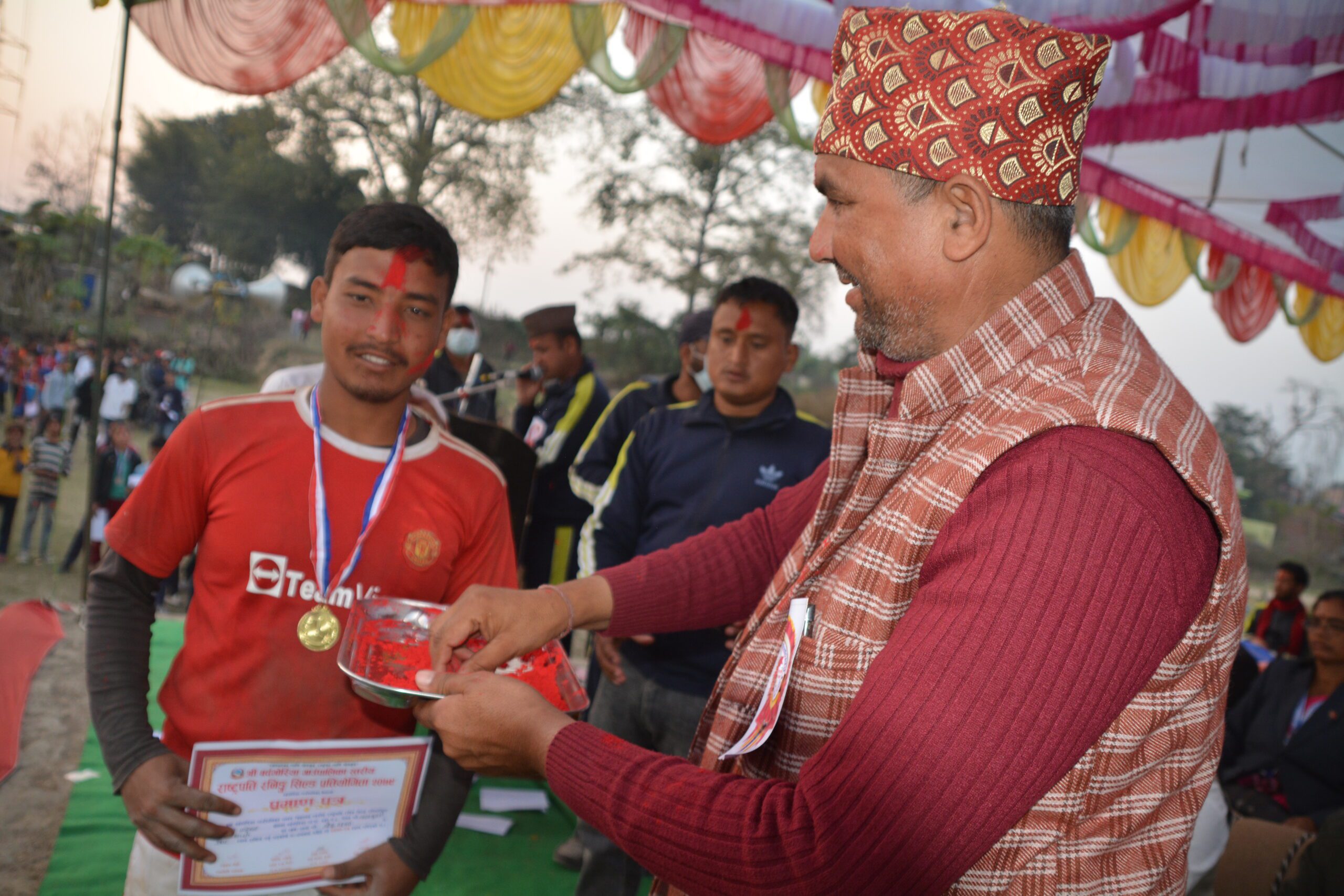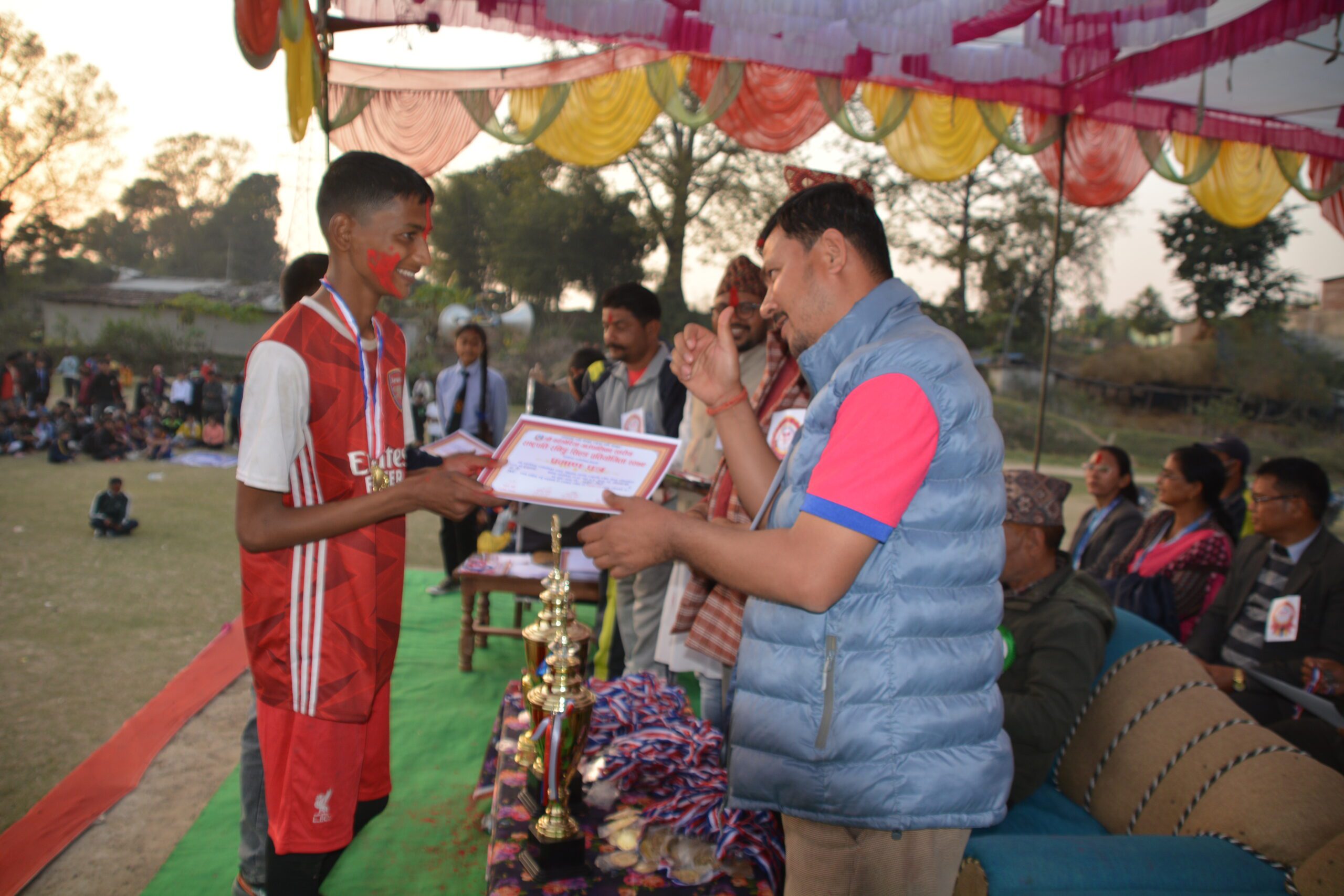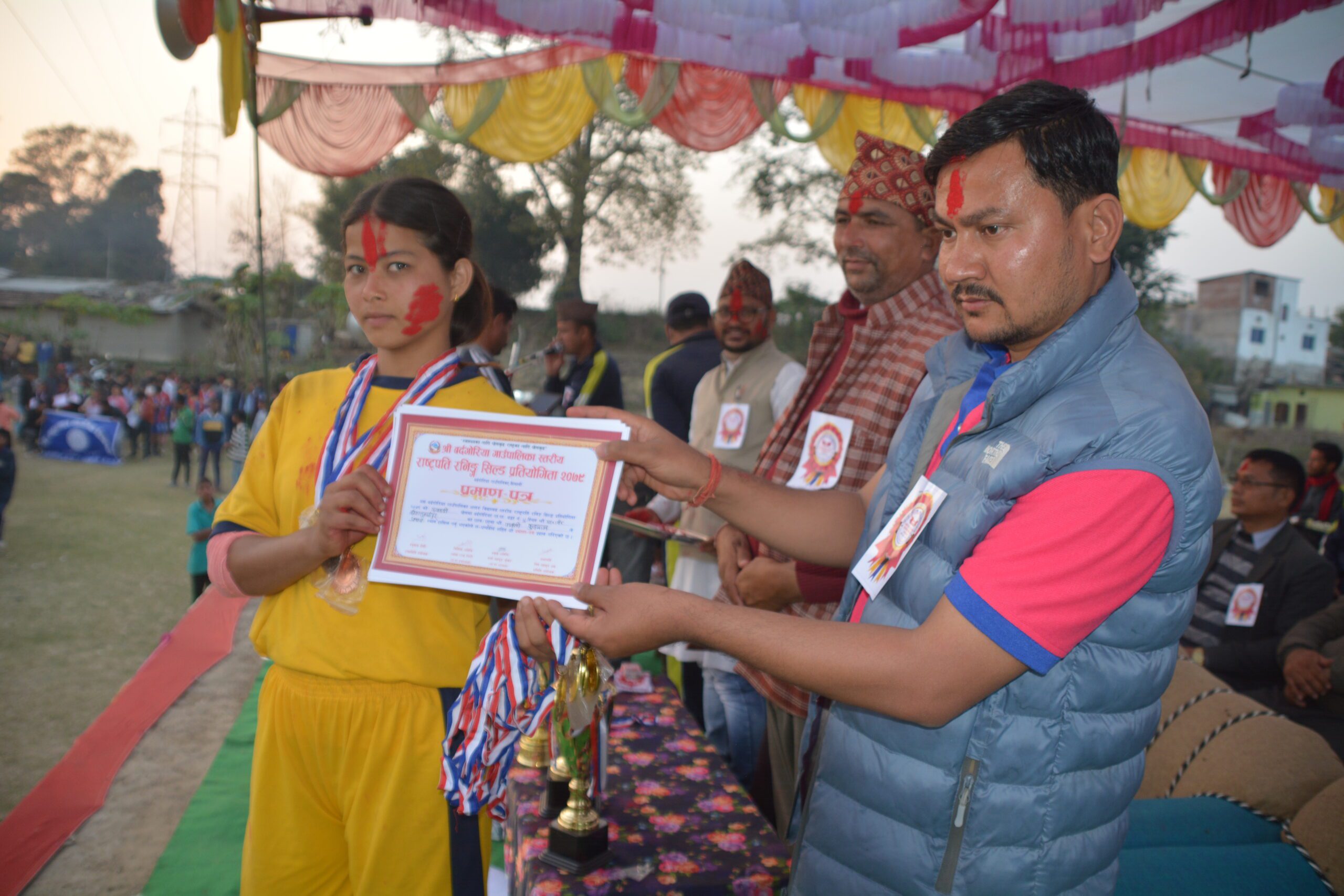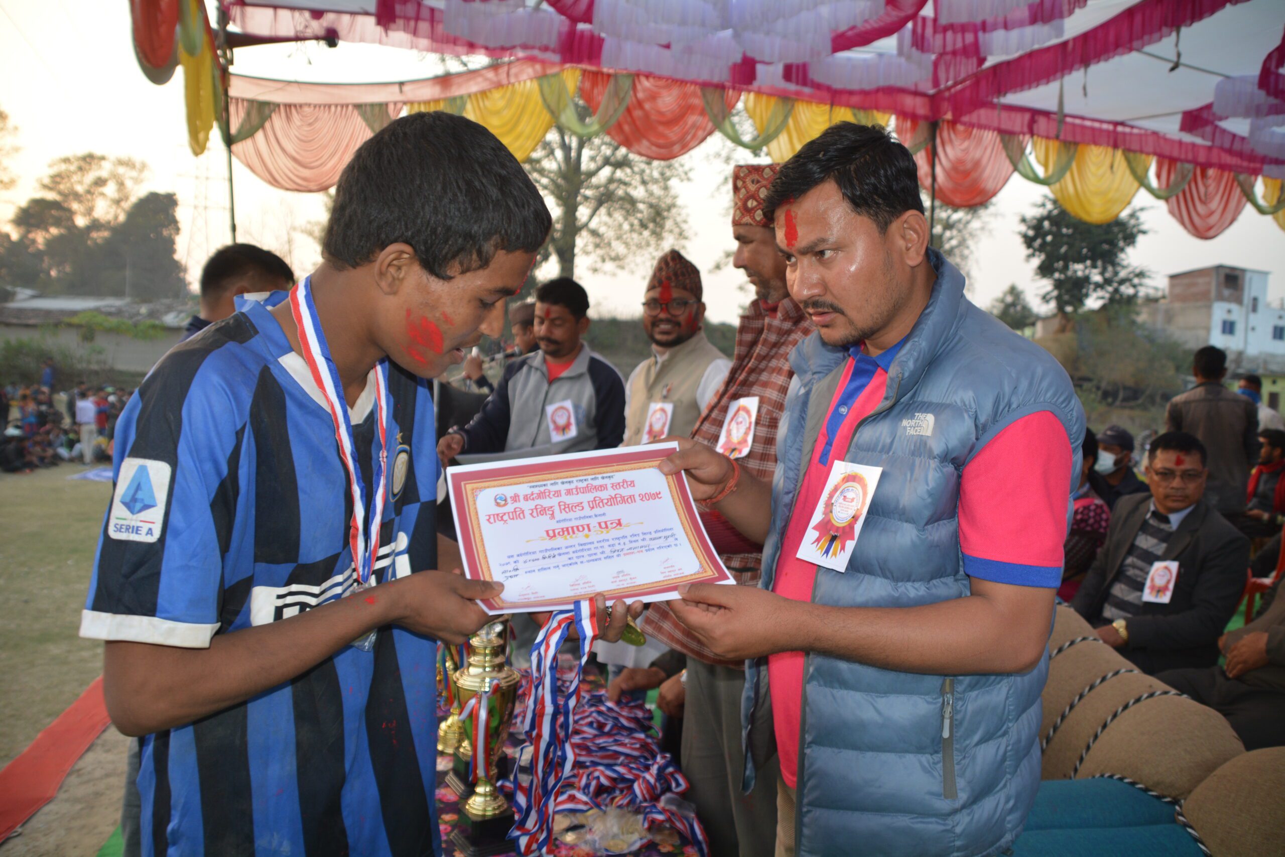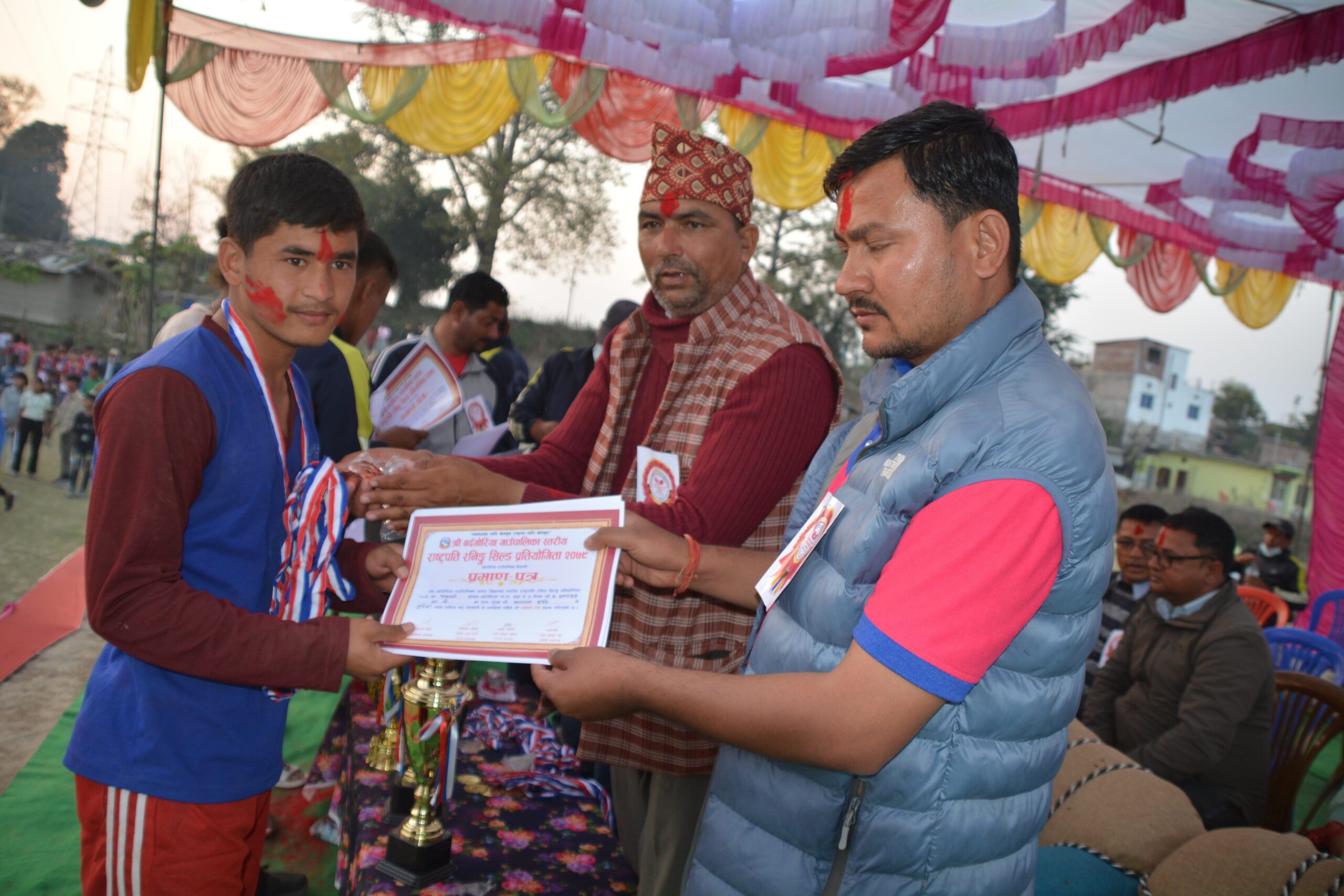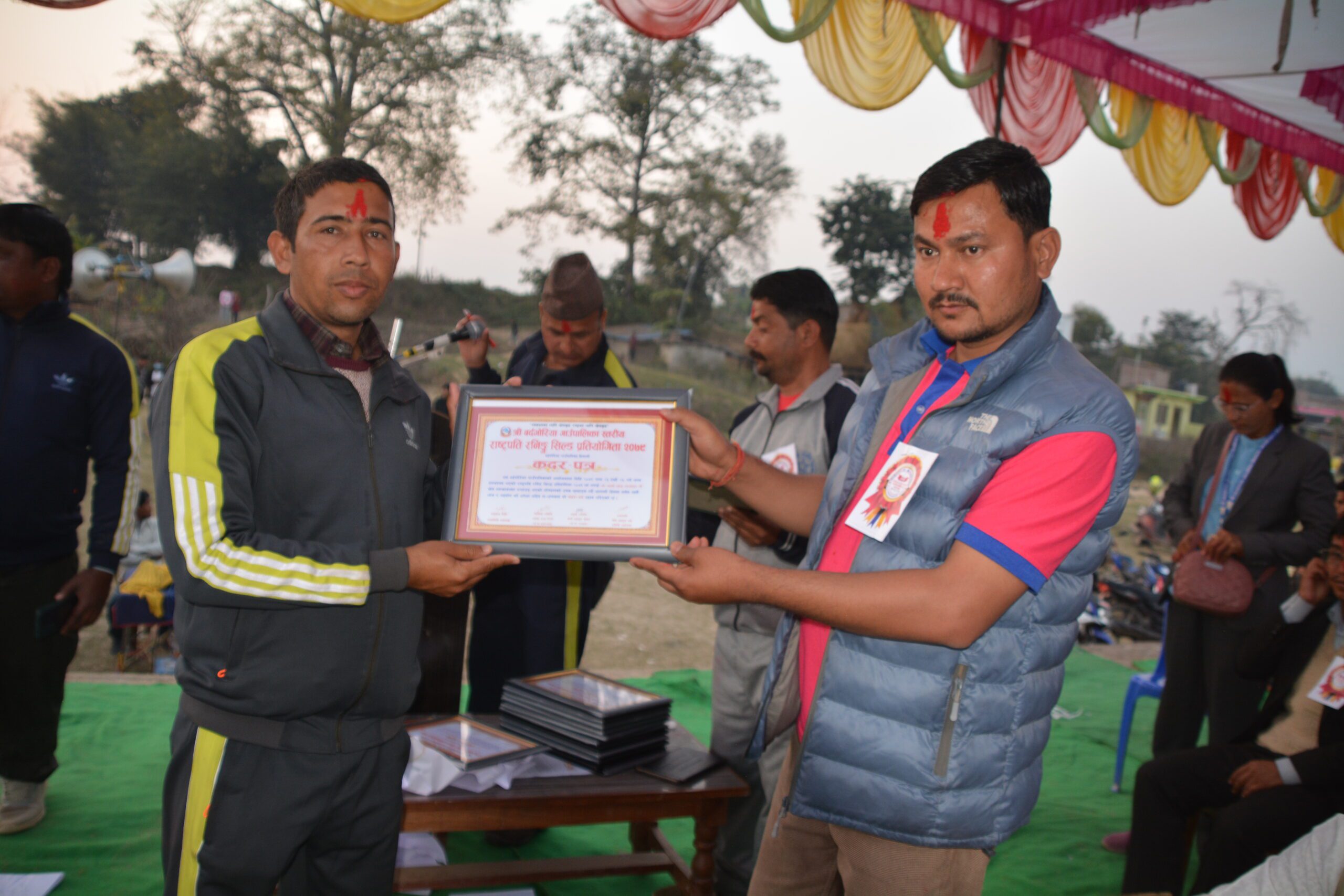 कैलाली । कैलालीको बर्दगोरिया गाउँपालिकामा गत मङ्गलवारबाट सुरु भएको पालिका स्तरीय राष्ट्रपति रनिङ्ग शिल्ड प्रतियोगिता सम्पन्न भएको छ । प्रतियोगितामा कक्षा ६ देखी १२ सम्मका १३ विद्यालयले भाग लिएका थिए । प्रतियोगिताका अधिकांश खेल विद्यालाई वसन्त मुरारी माध्यमिक विद्यालयले कब्जा गरेको छ । १० स्वर्ण, ७ रजत र २ कास्य सहित वसन्त मुरारी प्रथम हुँदा ५ स्वर्ण र ३ कास्य सहित नोबेल एकेडेमी दोस्रो बनेको छ । यस्तै ३ स्वर्ण, ८ रजत र २ कास्य सहित कालिका मा.वि. नौनिया तृतीय बनेको छ । प्रतियोगितामा मा.वि. कोटातुल्सीपुरले ३ स्वर्ण, ४ रजत र ७ कास्य हात पारेको छ । जगदम्बिके भगवती मा.वि. खैरेनीले ३ स्वर्ण, ४ रजत र ४ कास्य, महुन्याल मा.वि. बासकोटीले ३ स्वर्ण, २ रजत र ४ कास्य, बालकन्या मा.वि. कट्टीपुरले २ स्वर्ण, २ रजत र ७ कास्य र न्यु वालवाटीका मा.वि. बौनियाँले १ स्वर्ण, २ रजत र ३ कास्य हात पारेको छ । यस्तै द सनराईज मा.वि.बौनियाँले २ रजत र १ कास्य, आदर्श सामुदायिक मा.वि.ले १ कास्य, र माइकी मिडियमले १ कास्य प्राप्त गरेका छन् । प्रतियोगितामा १ सय, २ सय, ४ सय, ८ सय, १ हजार ५ सय र ३ हजार मिटर दौड, कबड्डी, १ सय मिटर र ४ सय मिटर रिले, भलिबल, हाई जम्प, लङ्ग जम्प, सट फुट, त्रिपल जम्प र ज्याइबलिन थ्रो गरी १५ विद्यामा खेल खेलाइएको थियो । जिल्ला स्तरमा हुने राष्ट्रपति रनिङ्ग शिल्डलाई मध्यनजर गरी सञ्चालन गरिएको यस प्रतियोगिताबाट खेलाडी तथा टिम समेट छनौट भएका छन् । हरेक खेल विद्याका प्रथम र द्धितिय हुने टिम तथा खेलाडी जिल्ला स्तरको प्रतियोगितामा सहभागी हुने छन् । यस अघि २०७६ मा जिल्ला स्तरमा भएको प्रतियोगितामा वसन्त मुरारी मा.वि.ले कबड्डी विद्यामा उपाधि हात पारेको थियो ।