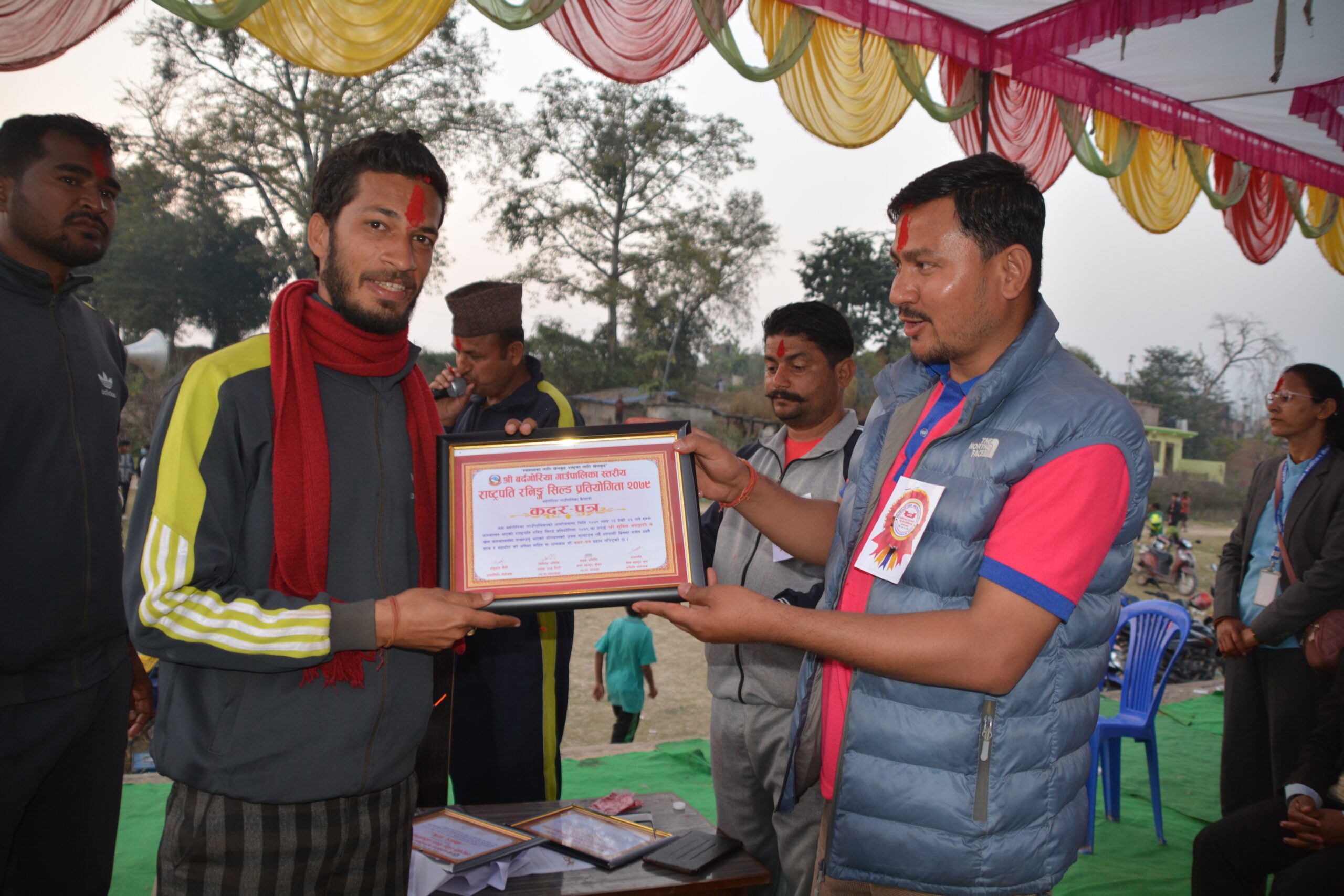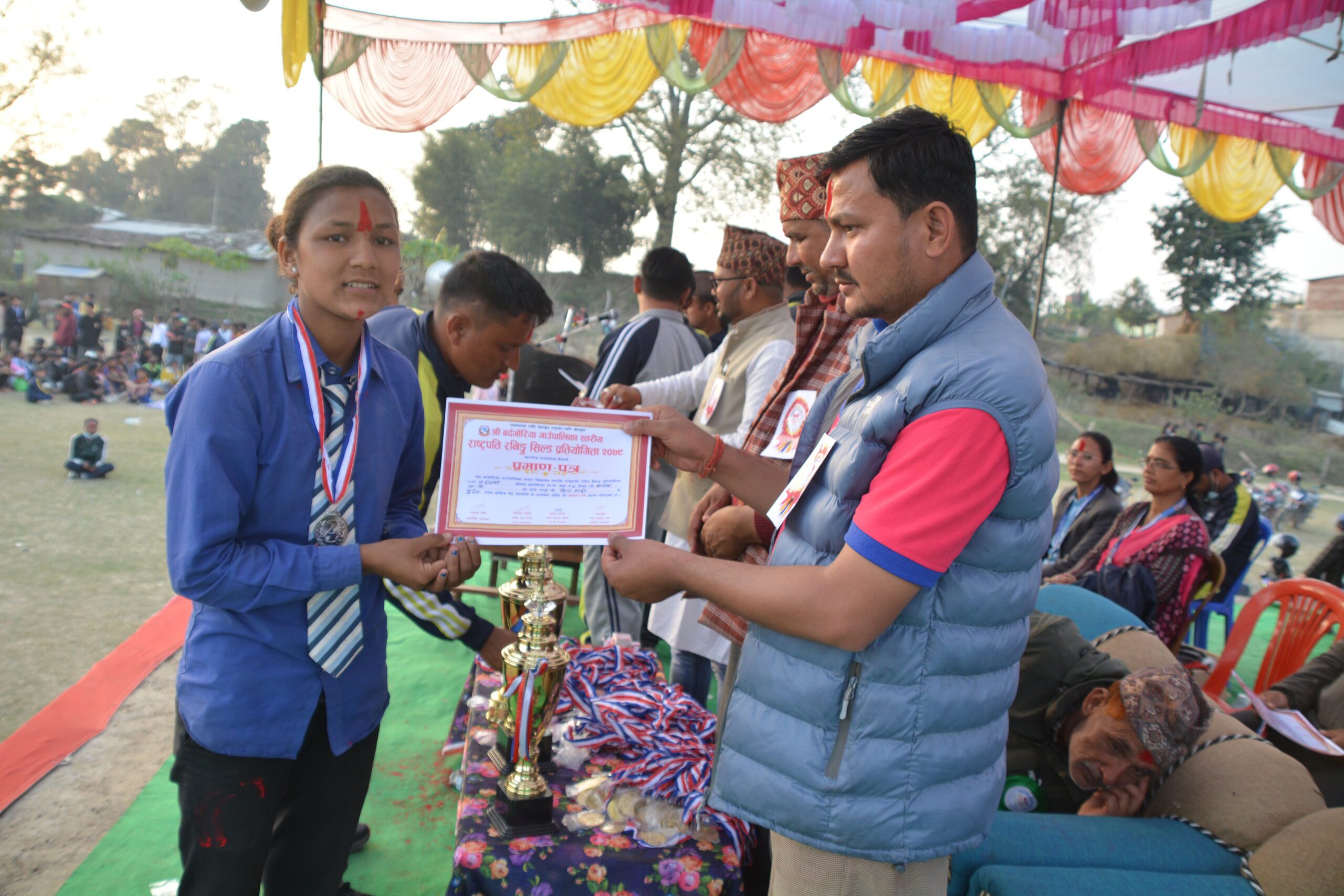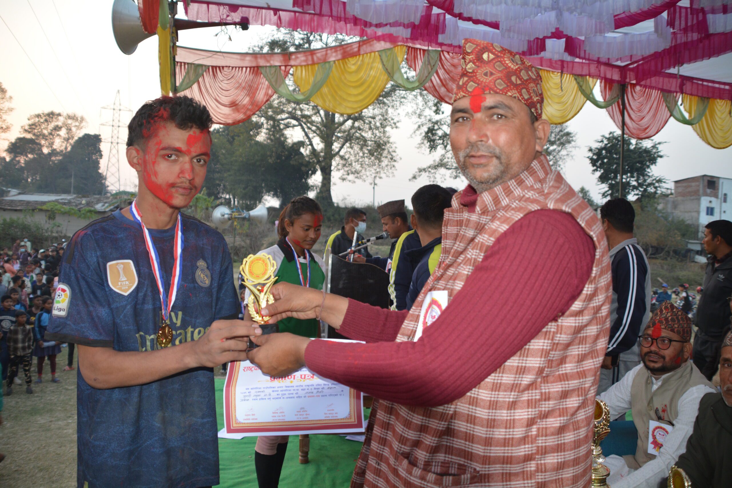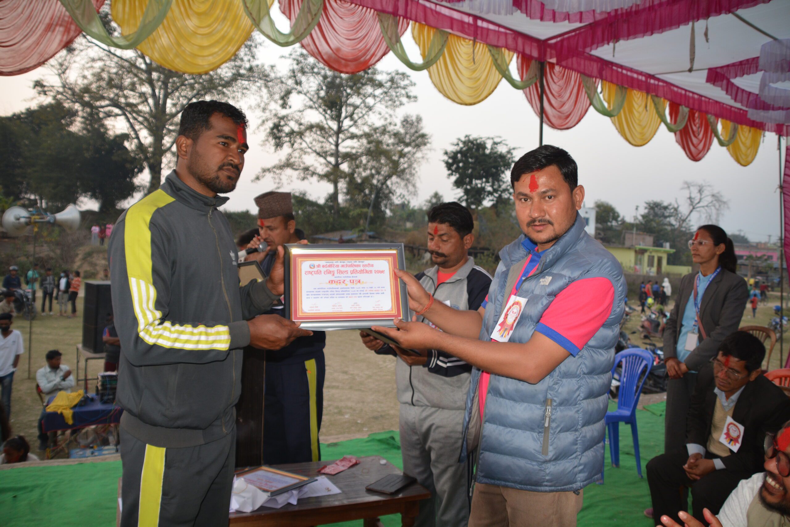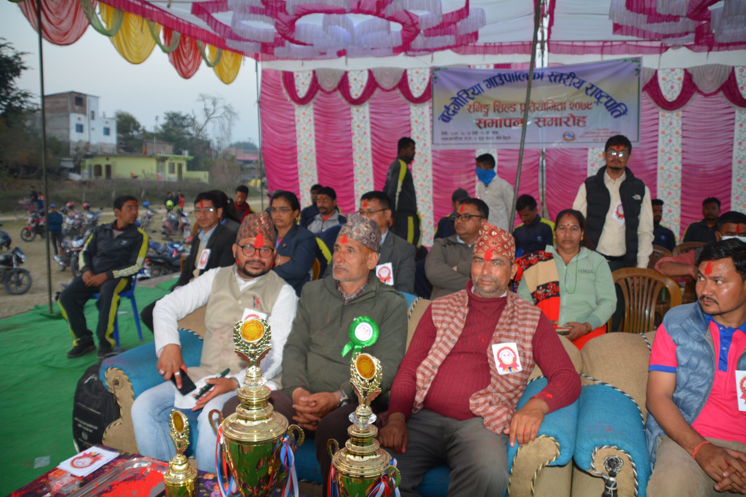 कैलाली । कैलालीको बर्दगोरिया गाउँपालिकामा गत मङ्गलवारबाट सुरु भएको पालिका स्तरीय राष्ट्रपति रनिङ्ग शिल्ड प्रतियोगिता सम्पन्न भएको छ । प्रतियोगितामा कक्षा ६ देखी १२ सम्मका १३ विद्यालयले भाग लिएका थिए । प्रतियोगिताका अधिकांश खेल विद्यालाई वसन्त मुरारी माध्यमिक विद्यालयले कब्जा गरेको छ । १० स्वर्ण, ७ रजत र २ कास्य सहित वसन्त मुरारी प्रथम हुँदा ५ स्वर्ण र ३ कास्य सहित नोबेल एकेडेमी दोस्रो बनेको छ । यस्तै ३ स्वर्ण, ८ रजत र २ कास्य सहित कालिका मा.वि. नौनिया तृतीय बनेको छ । प्रतियोगितामा मा.वि. कोटातुल्सीपुरले ३ स्वर्ण, ४ रजत र ७ कास्य हात पारेको छ । जगदम्बिके भगवती मा.वि. खैरेनीले ३ स्वर्ण, ४ रजत र ४ कास्य, महुन्याल मा.वि. बासकोटीले ३ स्वर्ण, २ रजत र ४ कास्य, बालकन्या मा.वि. कट्टीपुरले २ स्वर्ण, २ रजत र ७ कास्य र न्यु वालवाटीका मा.वि. बौनियाँले १ स्वर्ण, २ रजत र ३ कास्य हात पारेको छ । यस्तै द सनराईज मा.वि.बौनियाँले २ रजत र १ कास्य, आदर्श सामुदायिक मा.वि.ले १ कास्य, र माइकी मिडियमले १ कास्य प्राप्त गरेका छन् । प्रतियोगितामा १ सय, २ सय, ४ सय, ८ सय, १ हजार ५ सय र ३ हजार मिटर दौड, कबड्डी, १ सय मिटर र ४ सय मिटर रिले, भलिबल, हाई जम्प, लङ्ग जम्प, सट फुट, त्रिपल जम्प र ज्याइबलिन थ्रो गरी १५ विद्यामा खेल खेलाइएको थियो । जिल्ला स्तरमा हुने राष्ट्रपति रनिङ्ग शिल्डलाई मध्यनजर गरी सञ्चालन गरिएको यस प्रतियोगिताबाट खेलाडी तथा टिम समेट छनौट भएका छन् । हरेक खेल विद्याका प्रथम र द्धितिय हुने टिम तथा खेलाडी जिल्ला स्तरको प्रतियोगितामा सहभागी हुने छन् । यस अघि २०७६ मा जिल्ला स्तरमा भएको प्रतियोगितामा वसन्त मुरारी मा.वि.ले कबड्डी विद्यामा उपाधि हात पारेको थियो ।