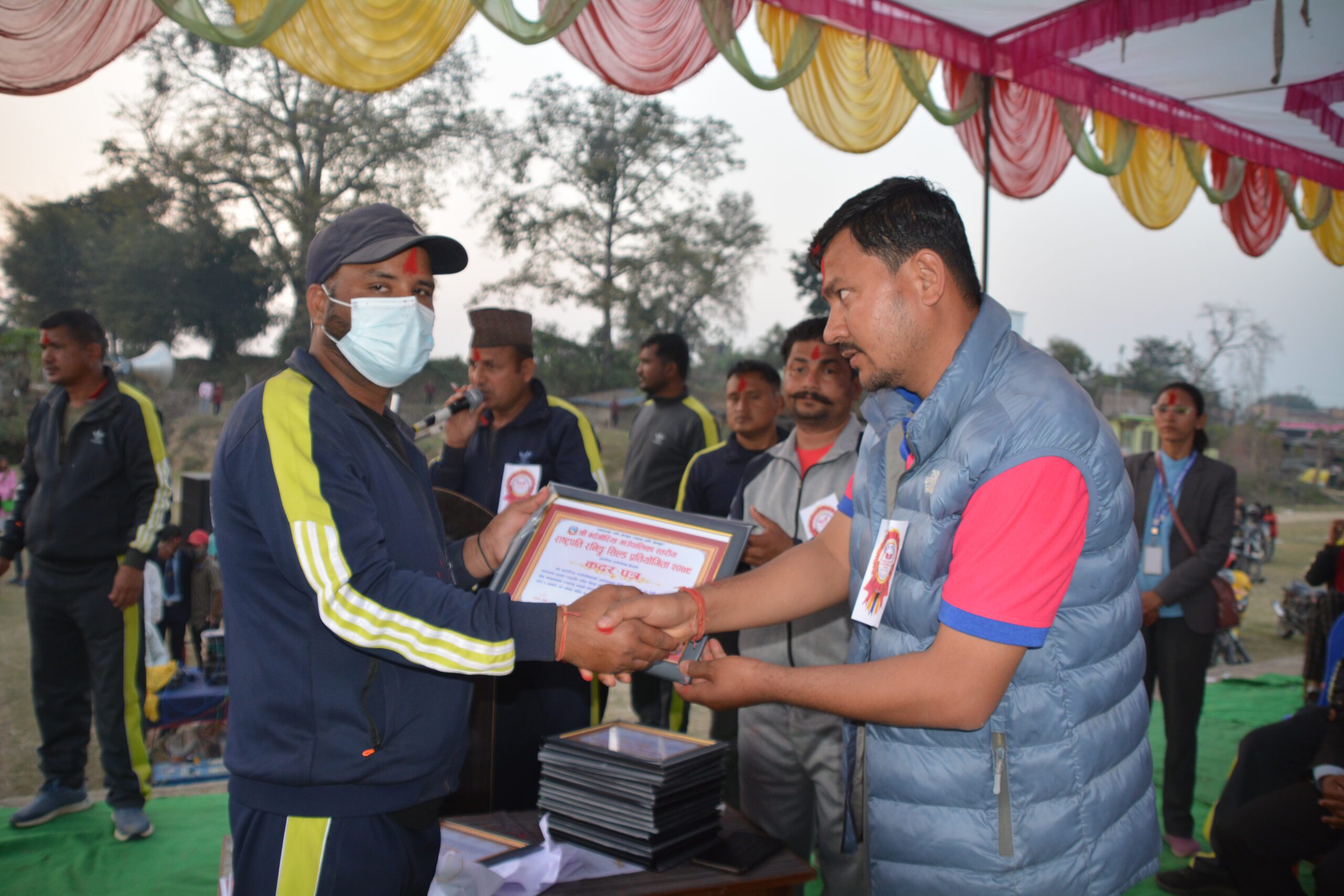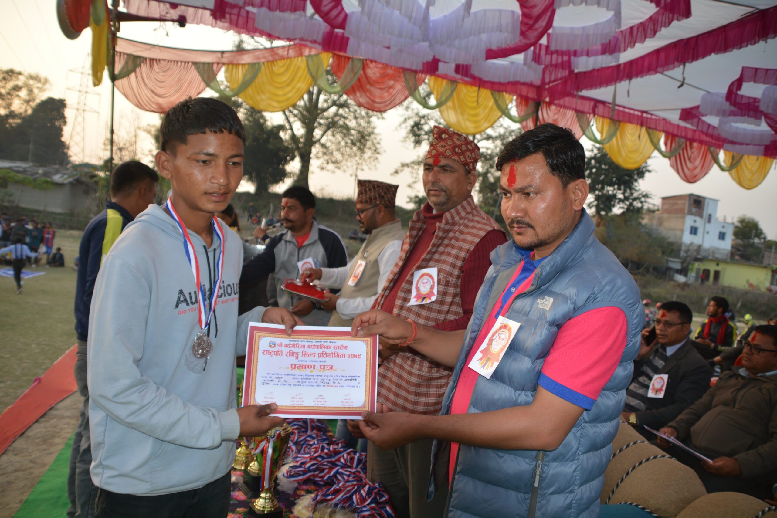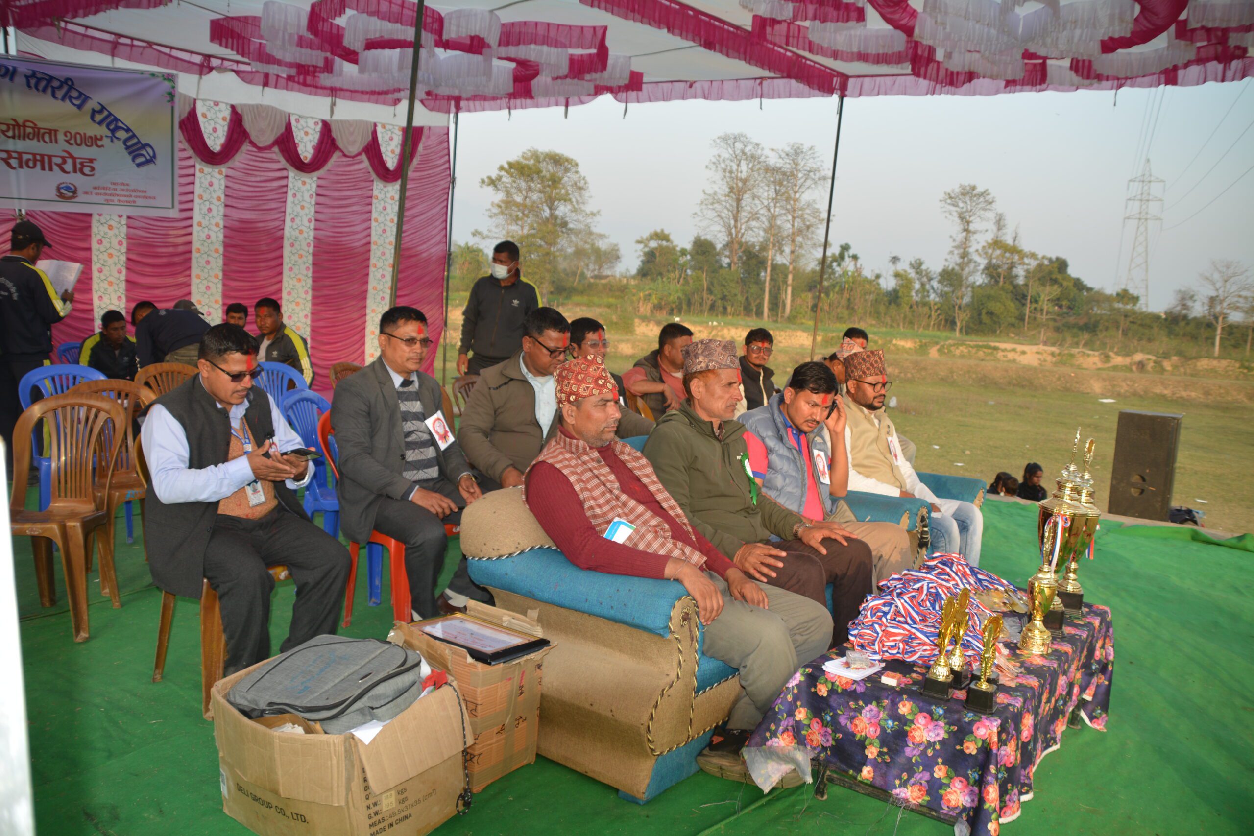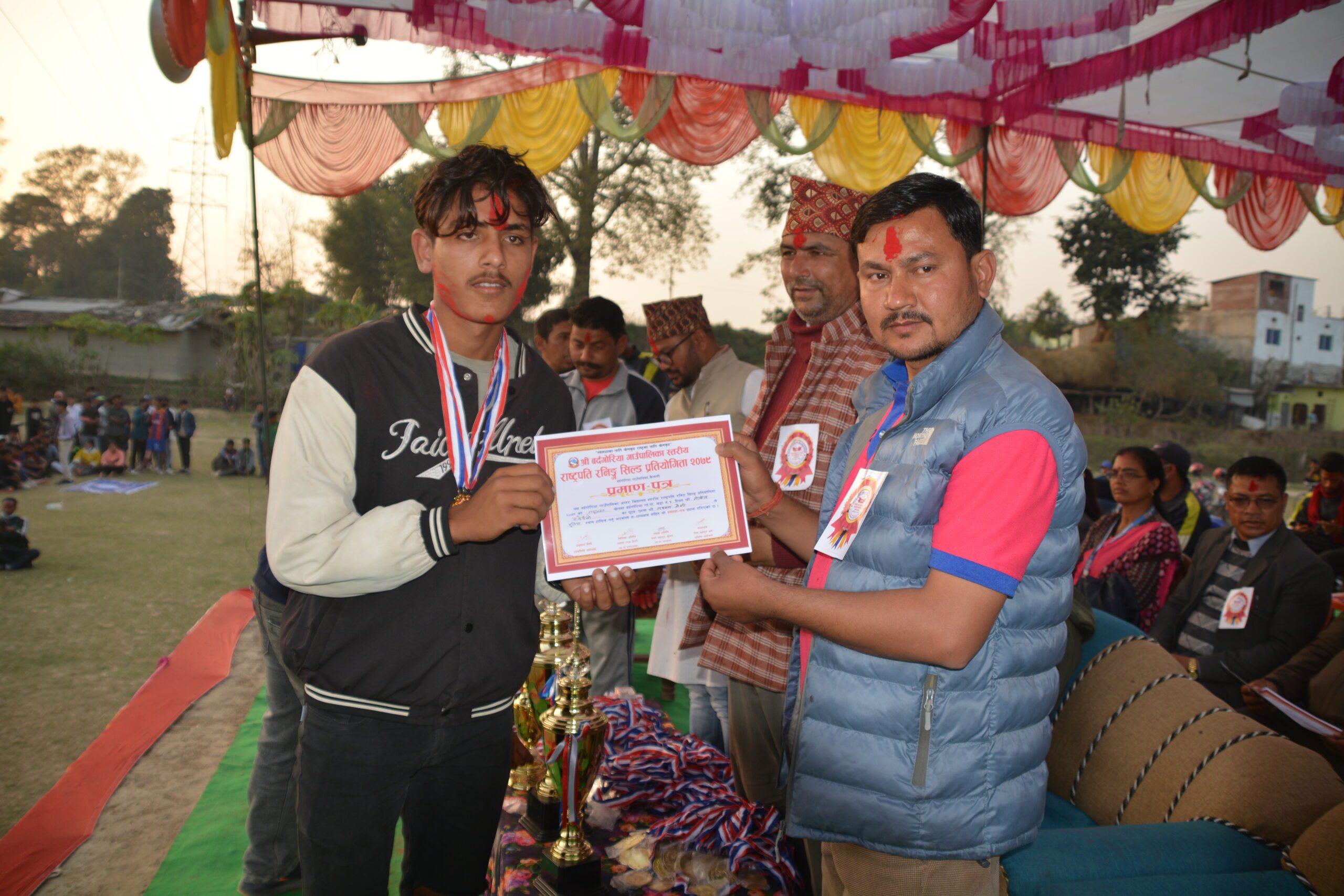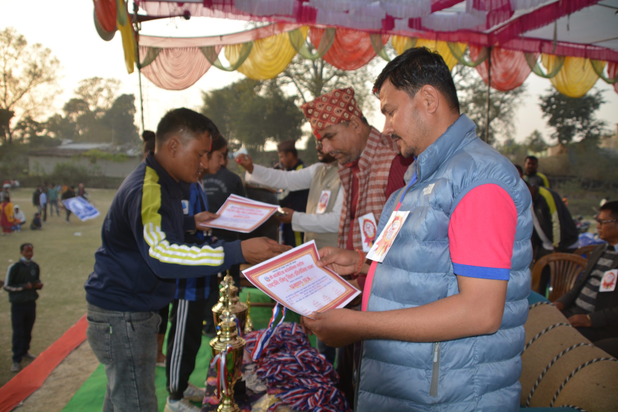 कैलाली । कैलालीको बर्दगोरिया गाउँपालिकामा गत मङ्गलवारबाट सुरु भएको पालिका स्तरीय राष्ट्रपति रनिङ्ग शिल्ड प्रतियोगिता सम्पन्न भएको छ । प्रतियोगितामा कक्षा ६ देखी १२ सम्मका १३ विद्यालयले भाग लिएका थिए । प्रतियोगिताका अधिकांश खेल विद्यालाई वसन्त मुरारी माध्यमिक विद्यालयले कब्जा गरेको छ । १० स्वर्ण, ७ रजत र २ कास्य सहित वसन्त मुरारी प्रथम हुँदा ५ स्वर्ण र ३ कास्य सहित नोबेल एकेडेमी दोस्रो बनेको छ । यस्तै ३ स्वर्ण, ८ रजत र २ कास्य सहित कालिका मा.वि. नौनिया तृतीय बनेको छ । प्रतियोगितामा मा.वि. कोटातुल्सीपुरले ३ स्वर्ण, ४ रजत र ७ कास्य हात पारेको छ । जगदम्बिके भगवती मा.वि. खैरेनीले ३ स्वर्ण, ४ रजत र ४ कास्य, महुन्याल मा.वि. बासकोटीले ३ स्वर्ण, २ रजत र ४ कास्य, बालकन्या मा.वि. कट्टीपुरले २ स्वर्ण, २ रजत र ७ कास्य र न्यु वालवाटीका मा.वि. बौनियाँले १ स्वर्ण, २ रजत र ३ कास्य हात पारेको छ । यस्तै द सनराईज मा.वि.बौनियाँले २ रजत र १ कास्य, आदर्श सामुदायिक मा.वि.ले १ कास्य, र माइकी मिडियमले १ कास्य प्राप्त गरेका छन् । प्रतियोगितामा १ सय, २ सय, ४ सय, ८ सय, १ हजार ५ सय र ३ हजार मिटर दौड, कबड्डी, १ सय मिटर र ४ सय मिटर रिले, भलिबल, हाई जम्प, लङ्ग जम्प, सट फुट, त्रिपल जम्प र ज्याइबलिन थ्रो गरी १५ विद्यामा खेल खेलाइएको थियो । जिल्ला स्तरमा हुने राष्ट्रपति रनिङ्ग शिल्डलाई मध्यनजर गरी सञ्चालन गरिएको यस प्रतियोगिताबाट खेलाडी तथा टिम समेट छनौट भएका छन् । हरेक खेल विद्याका प्रथम र द्धितिय हुने टिम तथा खेलाडी जिल्ला स्तरको प्रतियोगितामा सहभागी हुने छन् । यस अघि २०७६ मा जिल्ला स्तरमा भएको प्रतियोगितामा वसन्त मुरारी मा.वि.ले कबड्डी विद्यामा उपाधि हात पारेको थियो ।