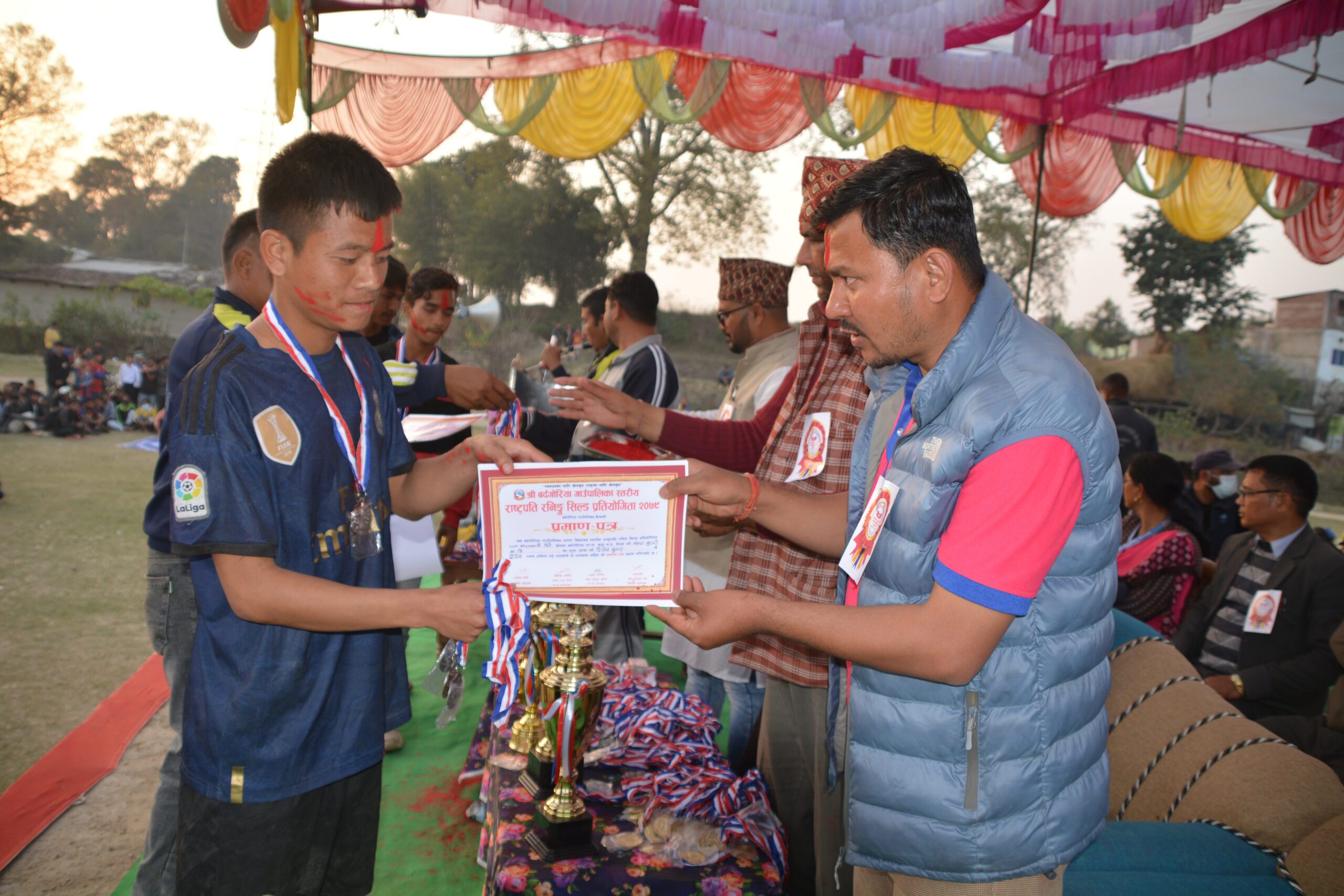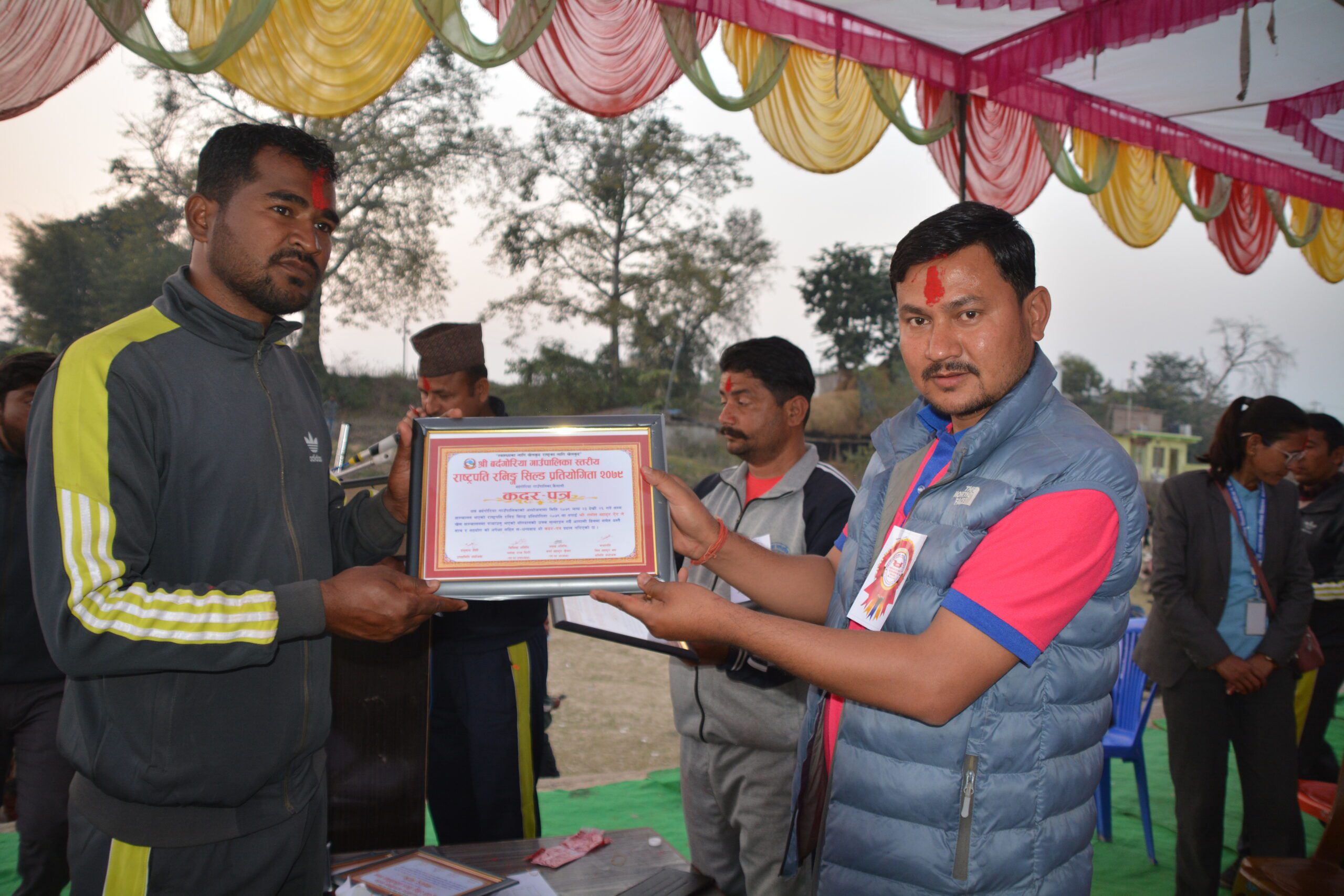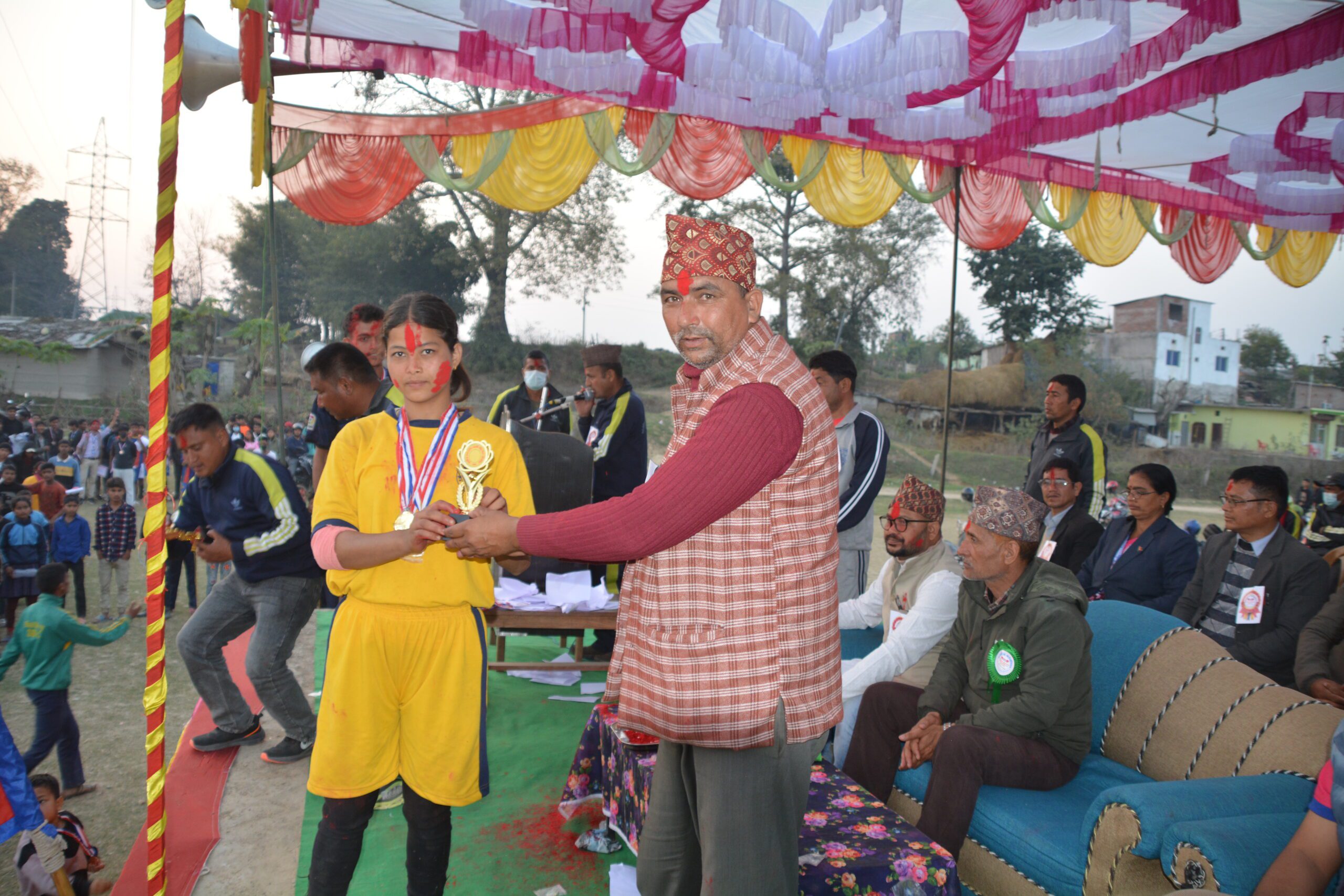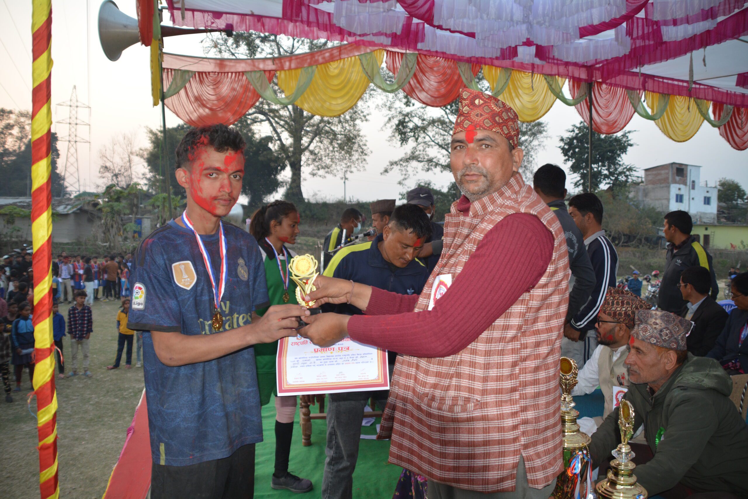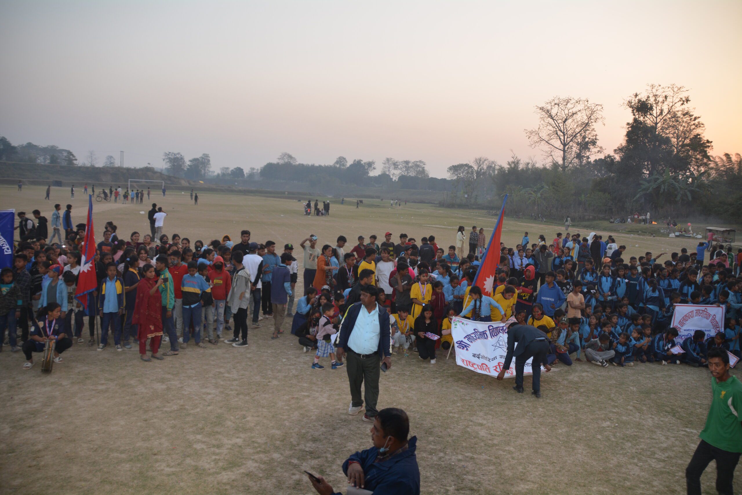 कैलाली । कैलालीको बर्दगोरिया गाउँपालिकामा गत मङ्गलवारबाट सुरु भएको पालिका स्तरीय राष्ट्रपति रनिङ्ग शिल्ड प्रतियोगिता सम्पन्न भएको छ । प्रतियोगितामा कक्षा ६ देखी १२ सम्मका १३ विद्यालयले भाग लिएका थिए । प्रतियोगिताका अधिकांश खेल विद्यालाई वसन्त मुरारी माध्यमिक विद्यालयले कब्जा गरेको छ । १० स्वर्ण, ७ रजत र २ कास्य सहित वसन्त मुरारी प्रथम हुँदा ५ स्वर्ण र ३ कास्य सहित नोबेल एकेडेमी दोस्रो बनेको छ । यस्तै ३ स्वर्ण, ८ रजत र २ कास्य सहित कालिका मा.वि. नौनिया तृतीय बनेको छ । प्रतियोगितामा मा.वि. कोटातुल्सीपुरले ३ स्वर्ण, ४ रजत र ७ कास्य हात पारेको छ । जगदम्बिके भगवती मा.वि. खैरेनीले ३ स्वर्ण, ४ रजत र ४ कास्य, महुन्याल मा.वि. बासकोटीले ३ स्वर्ण, २ रजत र ४ कास्य, बालकन्या मा.वि. कट्टीपुरले २ स्वर्ण, २ रजत र ७ कास्य र न्यु वालवाटीका मा.वि. बौनियाँले १ स्वर्ण, २ रजत र ३ कास्य हात पारेको छ । यस्तै द सनराईज मा.वि.बौनियाँले २ रजत र १ कास्य, आदर्श सामुदायिक मा.वि.ले १ कास्य, र माइकी मिडियमले १ कास्य प्राप्त गरेका छन् । प्रतियोगितामा १ सय, २ सय, ४ सय, ८ सय, १ हजार ५ सय र ३ हजार मिटर दौड, कबड्डी, १ सय मिटर र ४ सय मिटर रिले, भलिबल, हाई जम्प, लङ्ग जम्प, सट फुट, त्रिपल जम्प र ज्याइबलिन थ्रो गरी १५ विद्यामा खेल खेलाइएको थियो । जिल्ला स्तरमा हुने राष्ट्रपति रनिङ्ग शिल्डलाई मध्यनजर गरी सञ्चालन गरिएको यस प्रतियोगिताबाट खेलाडी तथा टिम समेट छनौट भएका छन् । हरेक खेल विद्याका प्रथम र द्धितिय हुने टिम तथा खेलाडी जिल्ला स्तरको प्रतियोगितामा सहभागी हुने छन् । यस अघि २०७६ मा जिल्ला स्तरमा भएको प्रतियोगितामा वसन्त मुरारी मा.वि.ले कबड्डी विद्यामा उपाधि हात पारेको थियो ।