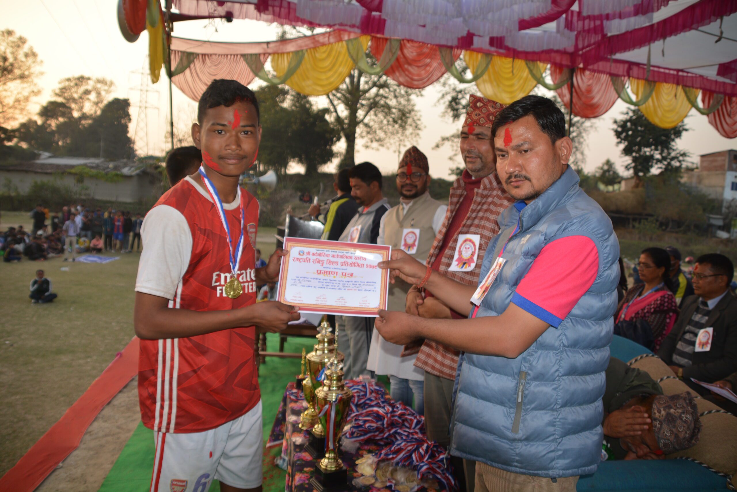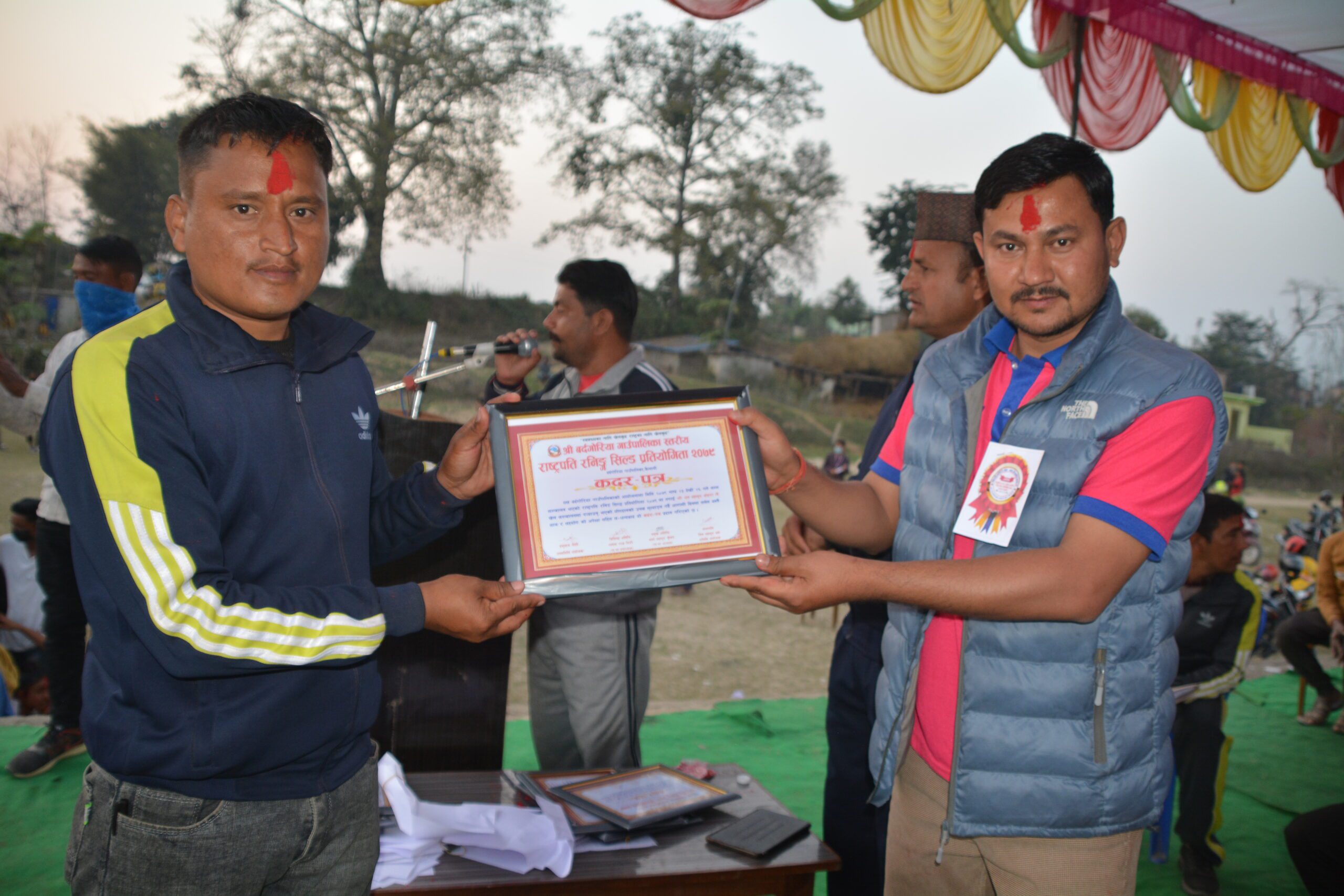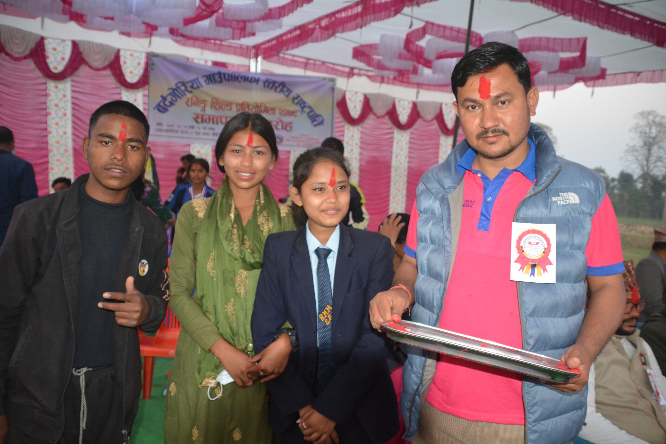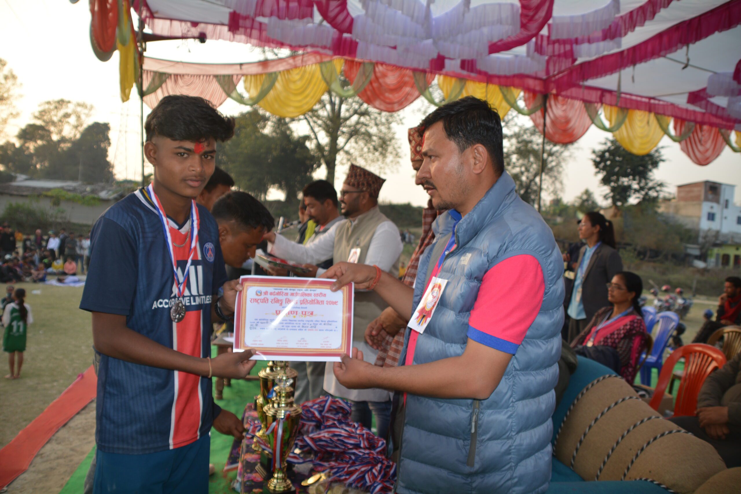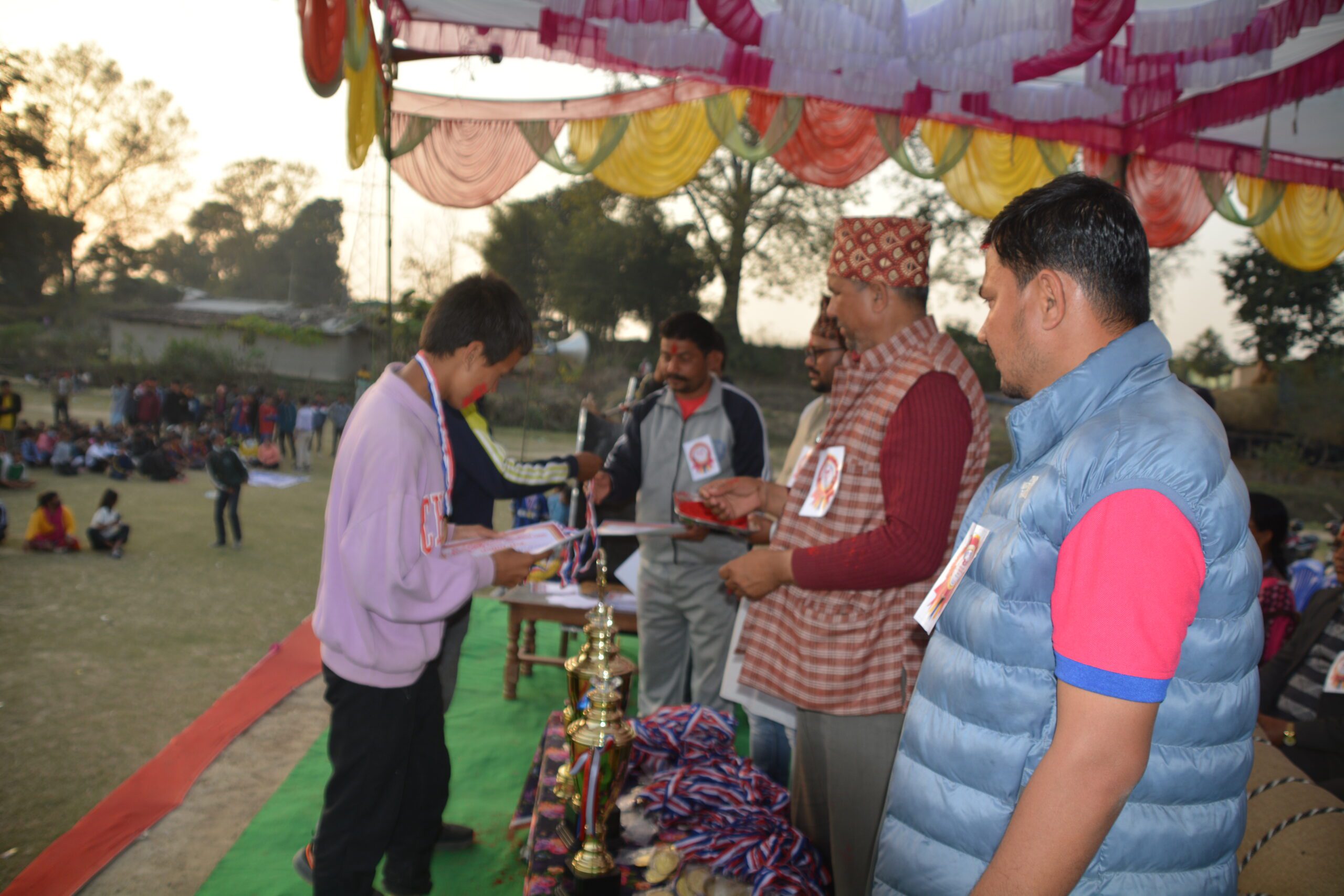 कैलाली । कैलालीको बर्दगोरिया गाउँपालिकामा गत मङ्गलवारबाट सुरु भएको पालिका स्तरीय राष्ट्रपति रनिङ्ग शिल्ड प्रतियोगिता सम्पन्न भएको छ । प्रतियोगितामा कक्षा ६ देखी १२ सम्मका १३ विद्यालयले भाग लिएका थिए । प्रतियोगिताका अधिकांश खेल विद्यालाई वसन्त मुरारी माध्यमिक विद्यालयले कब्जा गरेको छ । १० स्वर्ण, ७ रजत र २ कास्य सहित वसन्त मुरारी प्रथम हुँदा ५ स्वर्ण र ३ कास्य सहित नोबेल एकेडेमी दोस्रो बनेको छ । यस्तै ३ स्वर्ण, ८ रजत र २ कास्य सहित कालिका मा.वि. नौनिया तृतीय बनेको छ । प्रतियोगितामा मा.वि. कोटातुल्सीपुरले ३ स्वर्ण, ४ रजत र ७ कास्य हात पारेको छ । जगदम्बिके भगवती मा.वि. खैरेनीले ३ स्वर्ण, ४ रजत र ४ कास्य, महुन्याल मा.वि. बासकोटीले ३ स्वर्ण, २ रजत र ४ कास्य, बालकन्या मा.वि. कट्टीपुरले २ स्वर्ण, २ रजत र ७ कास्य र न्यु वालवाटीका मा.वि. बौनियाँले १ स्वर्ण, २ रजत र ३ कास्य हात पारेको छ । यस्तै द सनराईज मा.वि.बौनियाँले २ रजत र १ कास्य, आदर्श सामुदायिक मा.वि.ले १ कास्य, र माइकी मिडियमले १ कास्य प्राप्त गरेका छन् । प्रतियोगितामा १ सय, २ सय, ४ सय, ८ सय, १ हजार ५ सय र ३ हजार मिटर दौड, कबड्डी, १ सय मिटर र ४ सय मिटर रिले, भलिबल, हाई जम्प, लङ्ग जम्प, सट फुट, त्रिपल जम्प र ज्याइबलिन थ्रो गरी १५ विद्यामा खेल खेलाइएको थियो । जिल्ला स्तरमा हुने राष्ट्रपति रनिङ्ग शिल्डलाई मध्यनजर गरी सञ्चालन गरिएको यस प्रतियोगिताबाट खेलाडी तथा टिम समेट छनौट भएका छन् । हरेक खेल विद्याका प्रथम र द्धितिय हुने टिम तथा खेलाडी जिल्ला स्तरको प्रतियोगितामा सहभागी हुने छन् । यस अघि २०७६ मा जिल्ला स्तरमा भएको प्रतियोगितामा वसन्त मुरारी मा.वि.ले कबड्डी विद्यामा उपाधि हात पारेको थियो ।