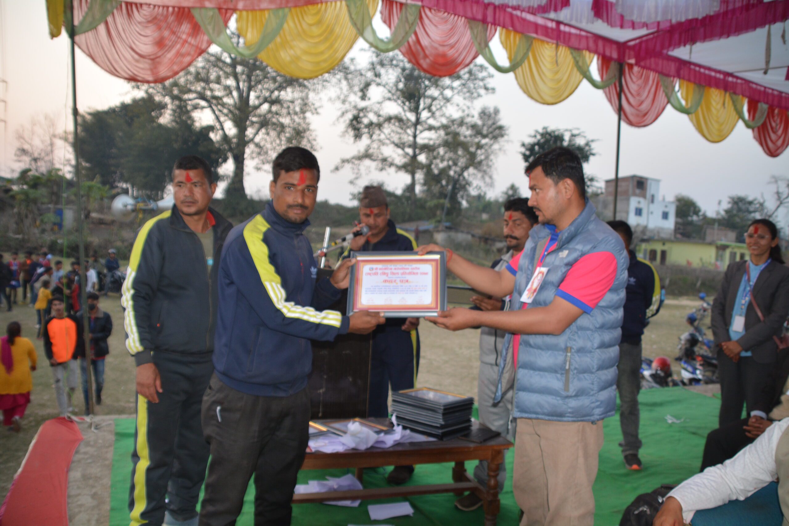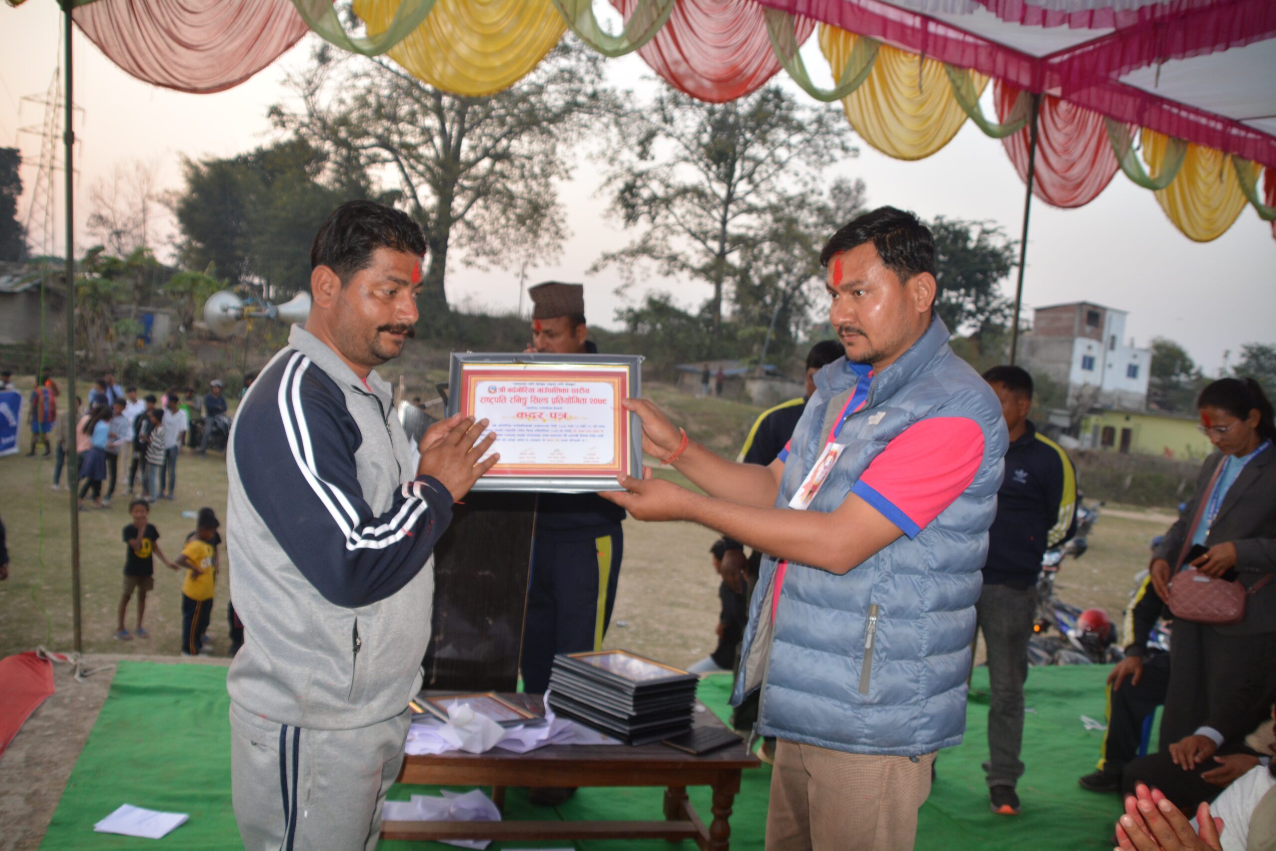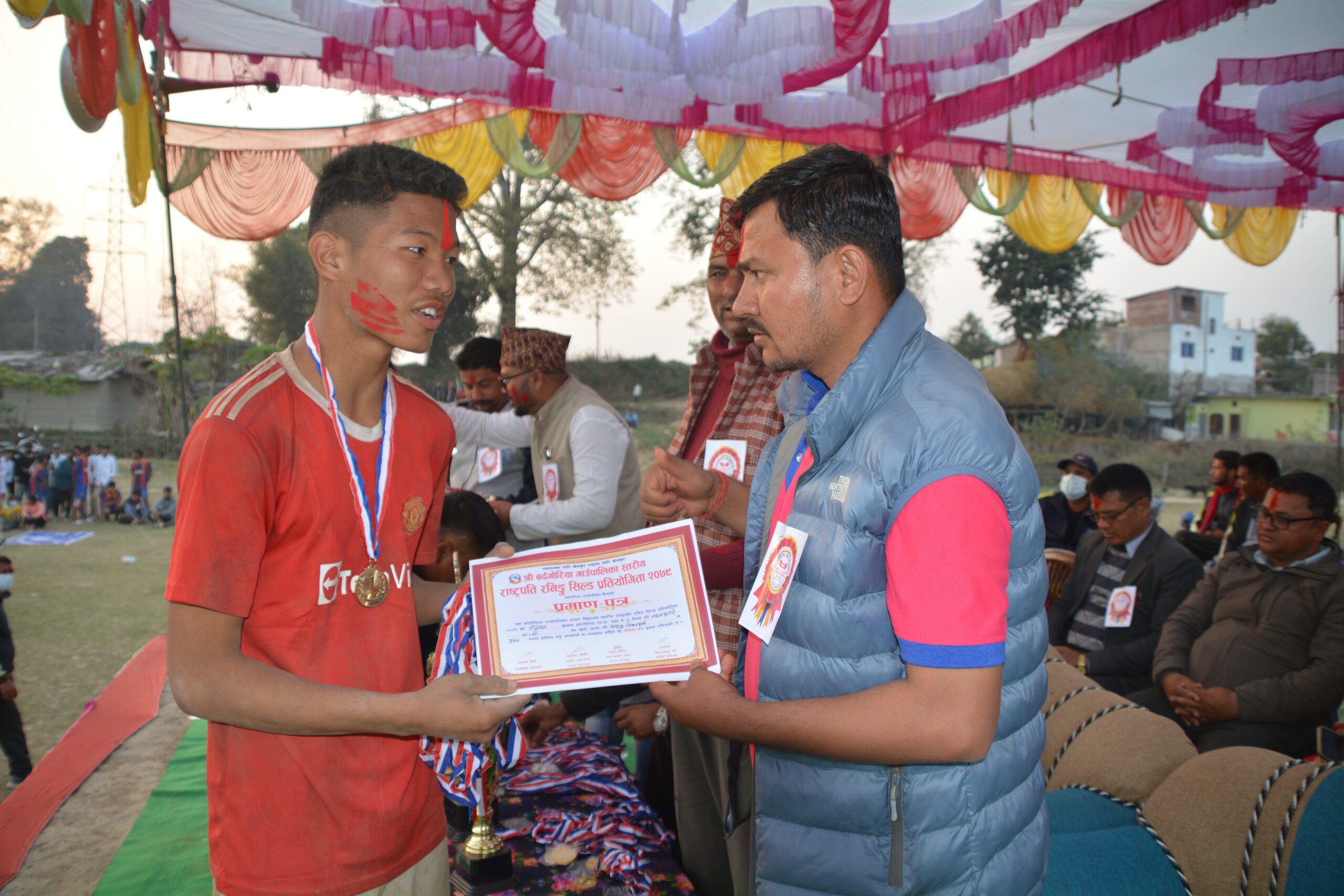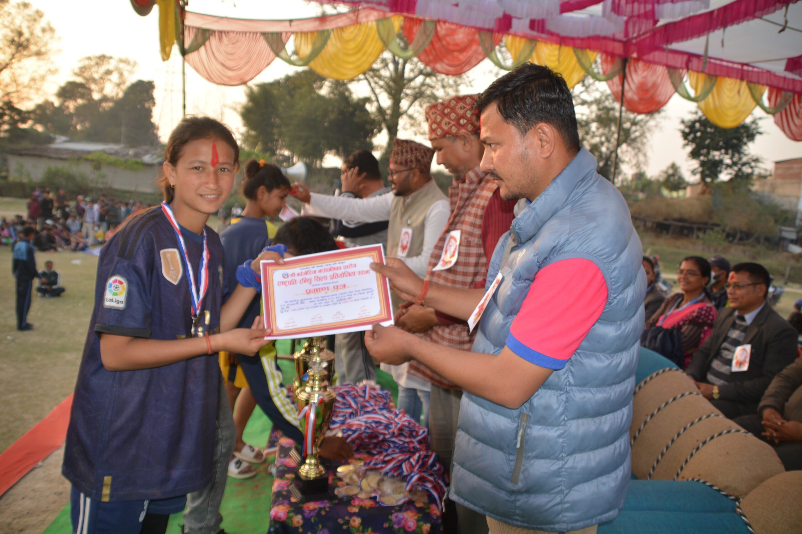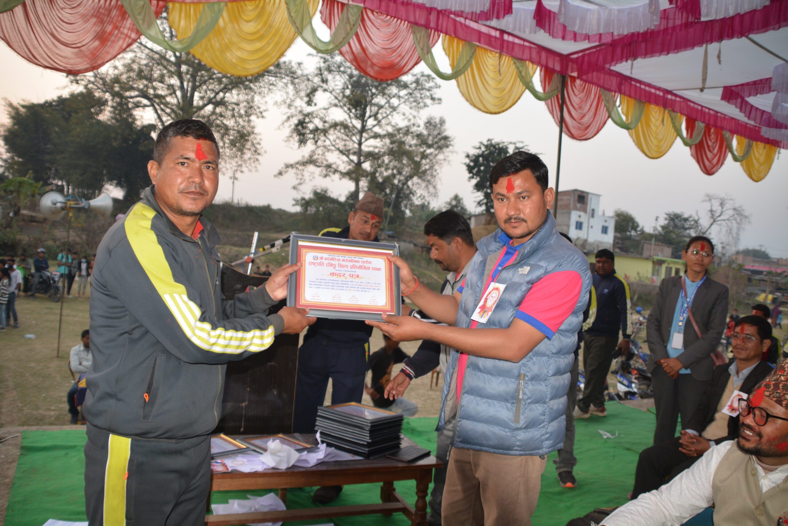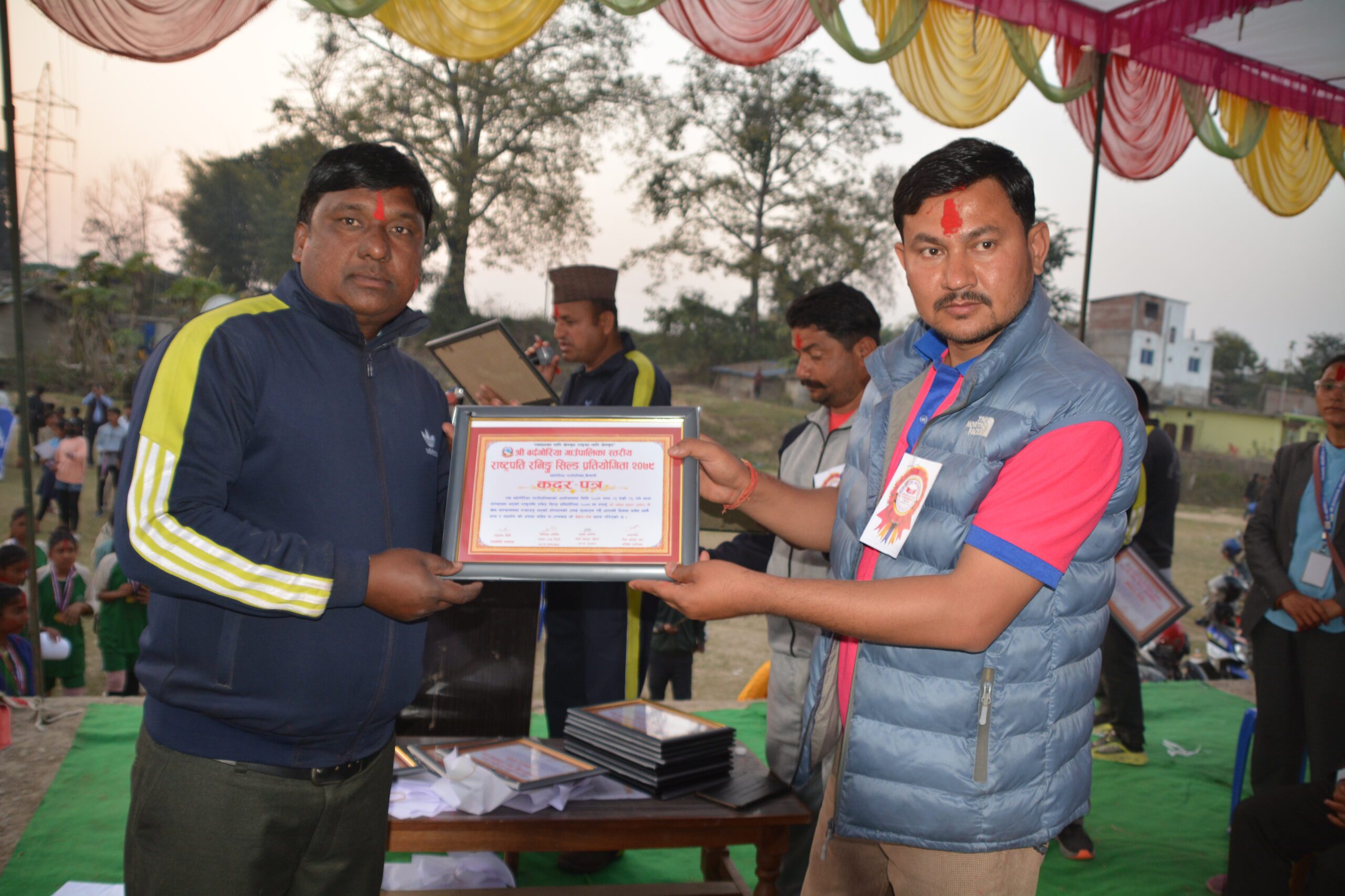 कैलाली । कैलालीको बर्दगोरिया गाउँपालिकामा गत मङ्गलवारबाट सुरु भएको पालिका स्तरीय राष्ट्रपति रनिङ्ग शिल्ड प्रतियोगिता सम्पन्न भएको छ । प्रतियोगितामा कक्षा ६ देखी १२ सम्मका १३ विद्यालयले भाग लिएका थिए । प्रतियोगिताका अधिकांश खेल विद्यालाई वसन्त मुरारी माध्यमिक विद्यालयले कब्जा गरेको छ । १० स्वर्ण, ७ रजत र २ कास्य सहित वसन्त मुरारी प्रथम हुँदा ५ स्वर्ण र ३ कास्य सहित नोबेल एकेडेमी दोस्रो बनेको छ । यस्तै ३ स्वर्ण, ८ रजत र २ कास्य सहित कालिका मा.वि. नौनिया तृतीय बनेको छ । प्रतियोगितामा मा.वि. कोटातुल्सीपुरले ३ स्वर्ण, ४ रजत र ७ कास्य हात पारेको छ । जगदम्बिके भगवती मा.वि. खैरेनीले ३ स्वर्ण, ४ रजत र ४ कास्य, महुन्याल मा.वि. बासकोटीले ३ स्वर्ण, २ रजत र ४ कास्य, बालकन्या मा.वि. कट्टीपुरले २ स्वर्ण, २ रजत र ७ कास्य र न्यु वालवाटीका मा.वि. बौनियाँले १ स्वर्ण, २ रजत र ३ कास्य हात पारेको छ । यस्तै द सनराईज मा.वि.बौनियाँले २ रजत र १ कास्य, आदर्श सामुदायिक मा.वि.ले १ कास्य, र माइकी मिडियमले १ कास्य प्राप्त गरेका छन् । प्रतियोगितामा १ सय, २ सय, ४ सय, ८ सय, १ हजार ५ सय र ३ हजार मिटर दौड, कबड्डी, १ सय मिटर र ४ सय मिटर रिले, भलिबल, हाई जम्प, लङ्ग जम्प, सट फुट, त्रिपल जम्प र ज्याइबलिन थ्रो गरी १५ विद्यामा खेल खेलाइएको थियो । जिल्ला स्तरमा हुने राष्ट्रपति रनिङ्ग शिल्डलाई मध्यनजर गरी सञ्चालन गरिएको यस प्रतियोगिताबाट खेलाडी तथा टिम समेट छनौट भएका छन् । हरेक खेल विद्याका प्रथम र द्धितिय हुने टिम तथा खेलाडी जिल्ला स्तरको प्रतियोगितामा सहभागी हुने छन् । यस अघि २०७६ मा जिल्ला स्तरमा भएको प्रतियोगितामा वसन्त मुरारी मा.वि.ले कबड्डी विद्यामा उपाधि हात पारेको थियो ।