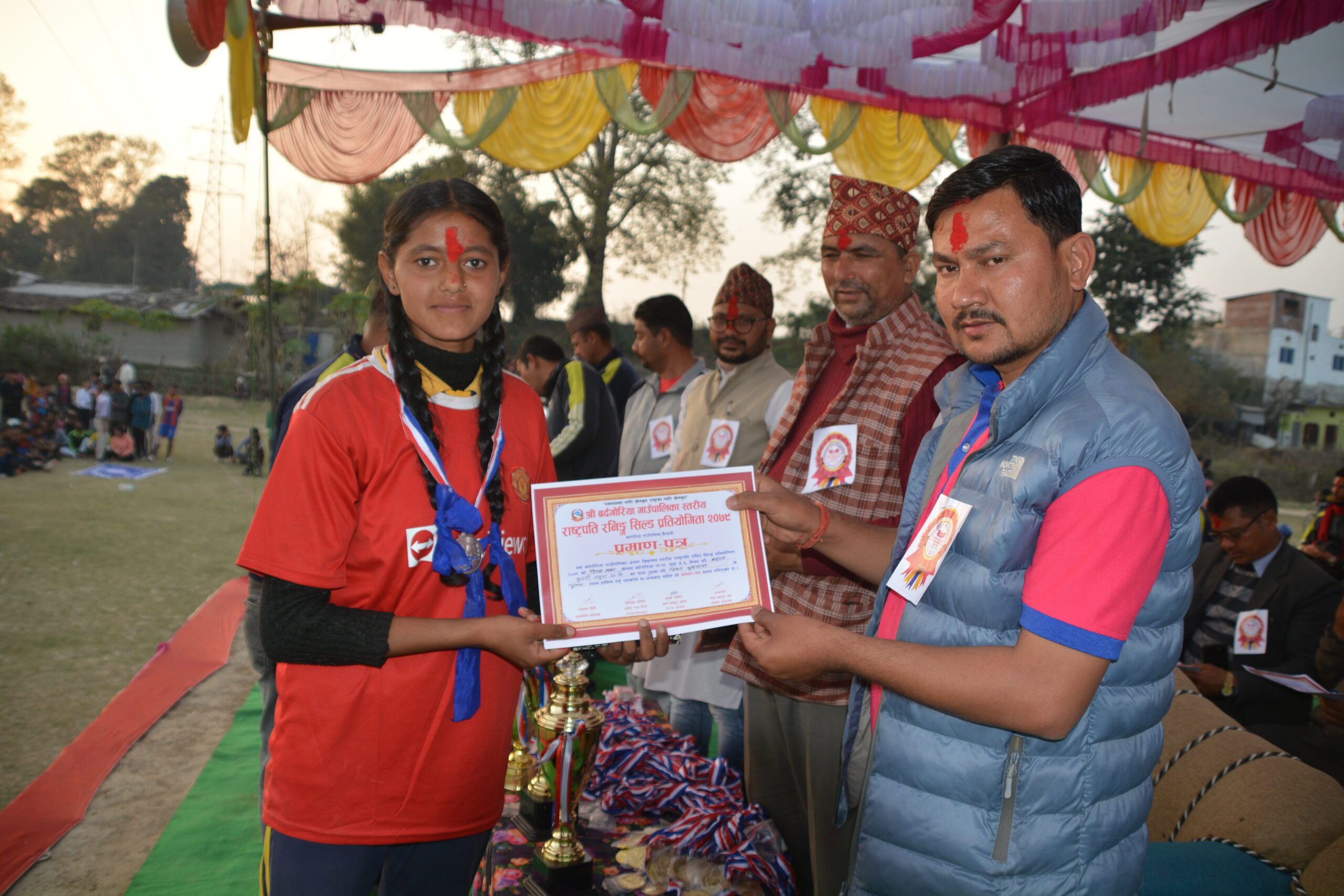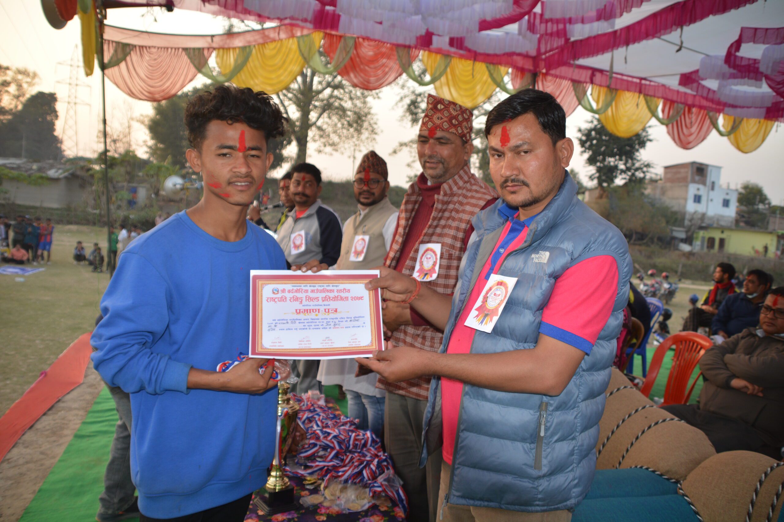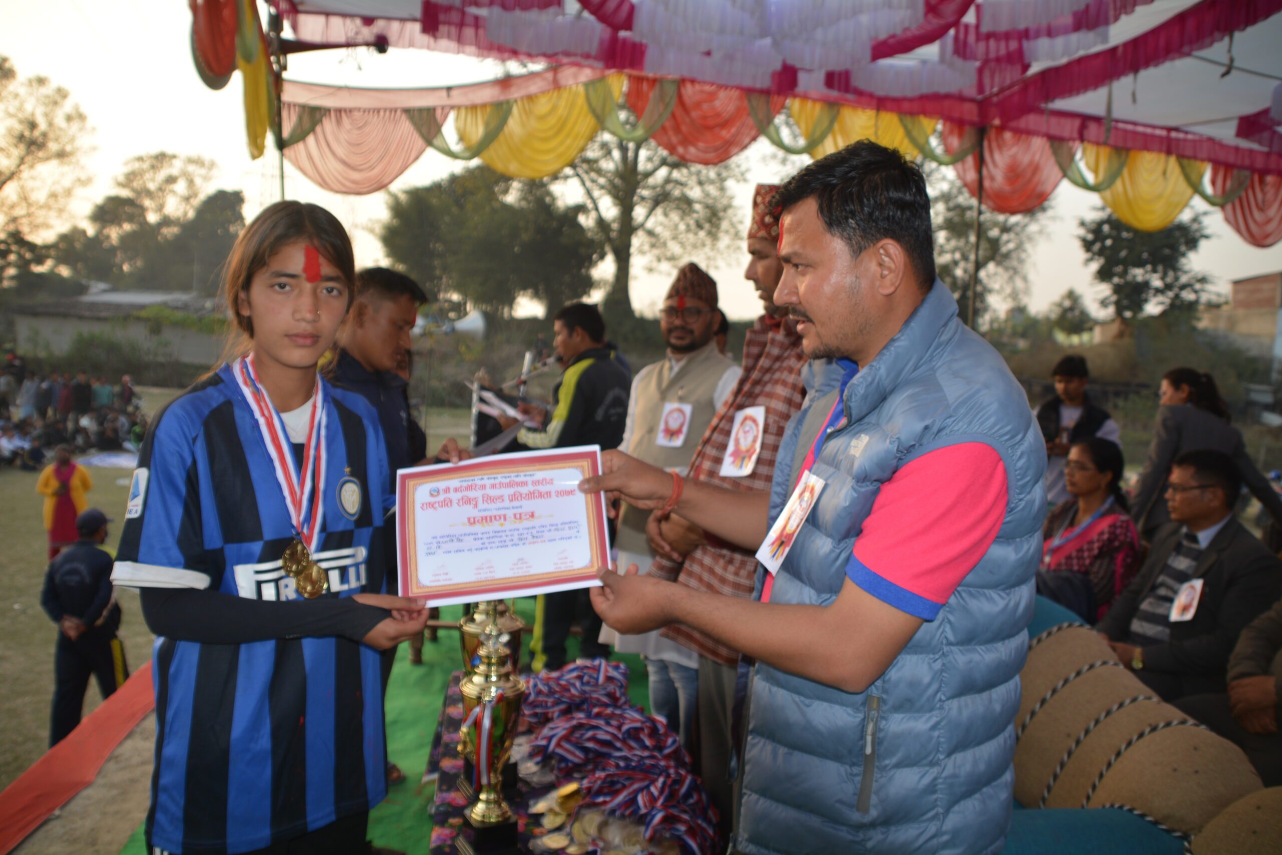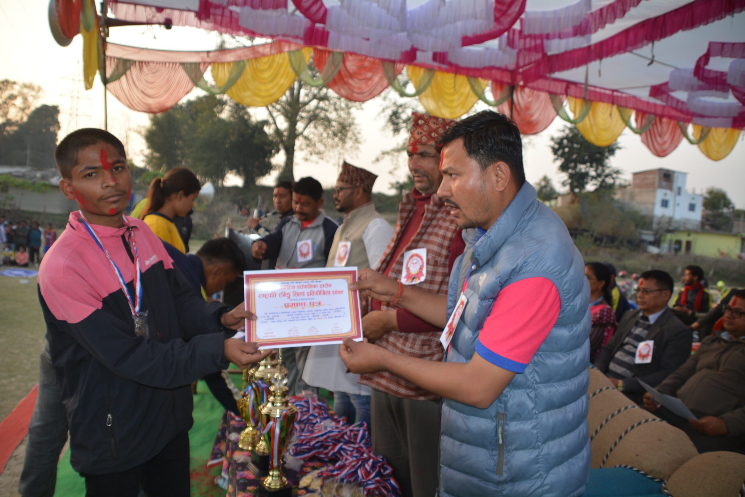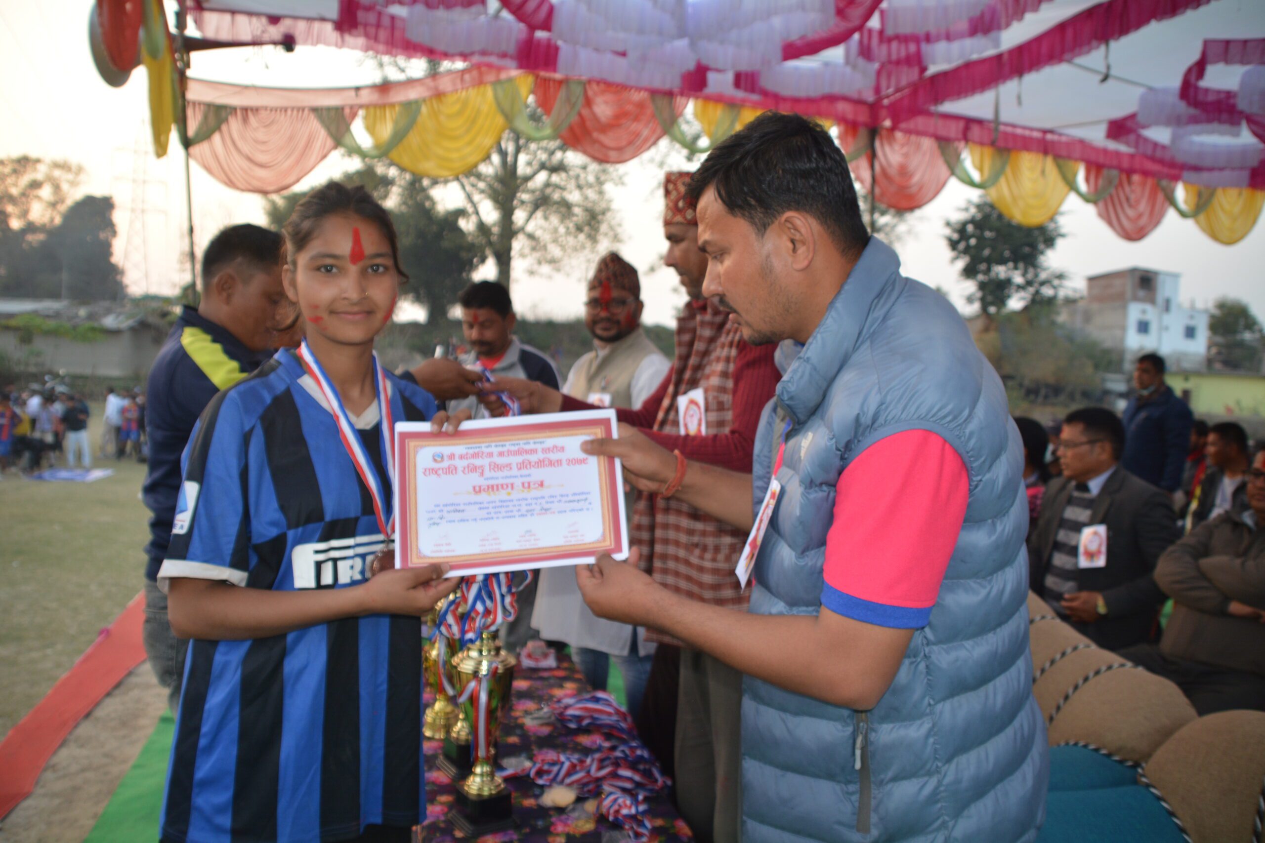 कैलाली । कैलालीको बर्दगोरिया गाउँपालिकामा गत मङ्गलवारबाट सुरु भएको पालिका स्तरीय राष्ट्रपति रनिङ्ग शिल्ड प्रतियोगिता सम्पन्न भएको छ । प्रतियोगितामा कक्षा ६ देखी १२ सम्मका १३ विद्यालयले भाग लिएका थिए । प्रतियोगिताका अधिकांश खेल विद्यालाई वसन्त मुरारी माध्यमिक विद्यालयले कब्जा गरेको छ । १० स्वर्ण, ७ रजत र २ कास्य सहित वसन्त मुरारी प्रथम हुँदा ५ स्वर्ण र ३ कास्य सहित नोबेल एकेडेमी दोस्रो बनेको छ । यस्तै ३ स्वर्ण, ८ रजत र २ कास्य सहित कालिका मा.वि. नौनिया तृतीय बनेको छ । प्रतियोगितामा मा.वि. कोटातुल्सीपुरले ३ स्वर्ण, ४ रजत र ७ कास्य हात पारेको छ । जगदम्बिके भगवती मा.वि. खैरेनीले ३ स्वर्ण, ४ रजत र ४ कास्य, महुन्याल मा.वि. बासकोटीले ३ स्वर्ण, २ रजत र ४ कास्य, बालकन्या मा.वि. कट्टीपुरले २ स्वर्ण, २ रजत र ७ कास्य र न्यु वालवाटीका मा.वि. बौनियाँले १ स्वर्ण, २ रजत र ३ कास्य हात पारेको छ । यस्तै द सनराईज मा.वि.बौनियाँले २ रजत र १ कास्य, आदर्श सामुदायिक मा.वि.ले १ कास्य, र माइकी मिडियमले १ कास्य प्राप्त गरेका छन् । प्रतियोगितामा १ सय, २ सय, ४ सय, ८ सय, १ हजार ५ सय र ३ हजार मिटर दौड, कबड्डी, १ सय मिटर र ४ सय मिटर रिले, भलिबल, हाई जम्प, लङ्ग जम्प, सट फुट, त्रिपल जम्प र ज्याइबलिन थ्रो गरी १५ विद्यामा खेल खेलाइएको थियो । जिल्ला स्तरमा हुने राष्ट्रपति रनिङ्ग शिल्डलाई मध्यनजर गरी सञ्चालन गरिएको यस प्रतियोगिताबाट खेलाडी तथा टिम समेट छनौट भएका छन् । हरेक खेल विद्याका प्रथम र द्धितिय हुने टिम तथा खेलाडी जिल्ला स्तरको प्रतियोगितामा सहभागी हुने छन् । यस अघि २०७६ मा जिल्ला स्तरमा भएको प्रतियोगितामा वसन्त मुरारी मा.वि.ले कबड्डी विद्यामा उपाधि हात पारेको थियो ।