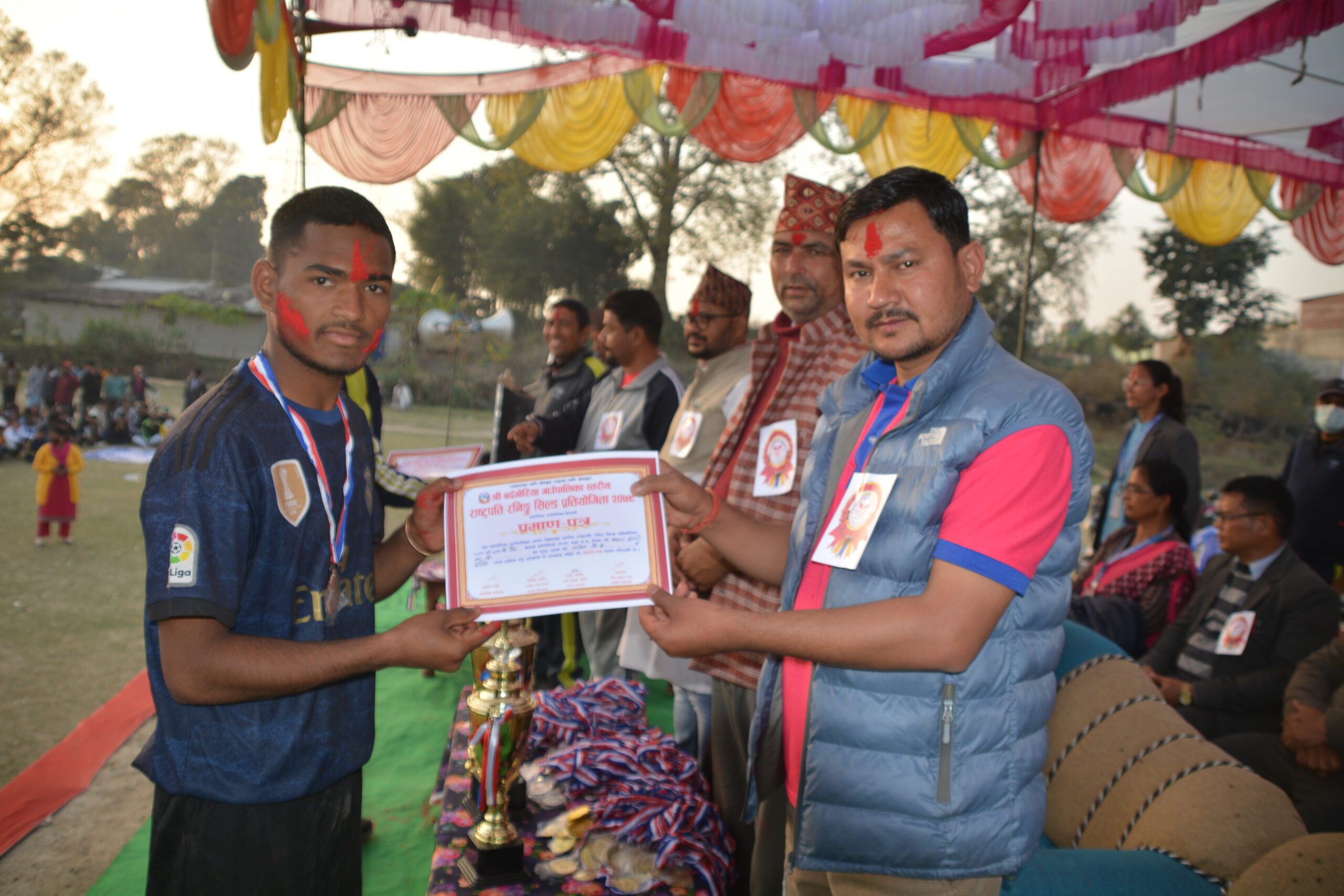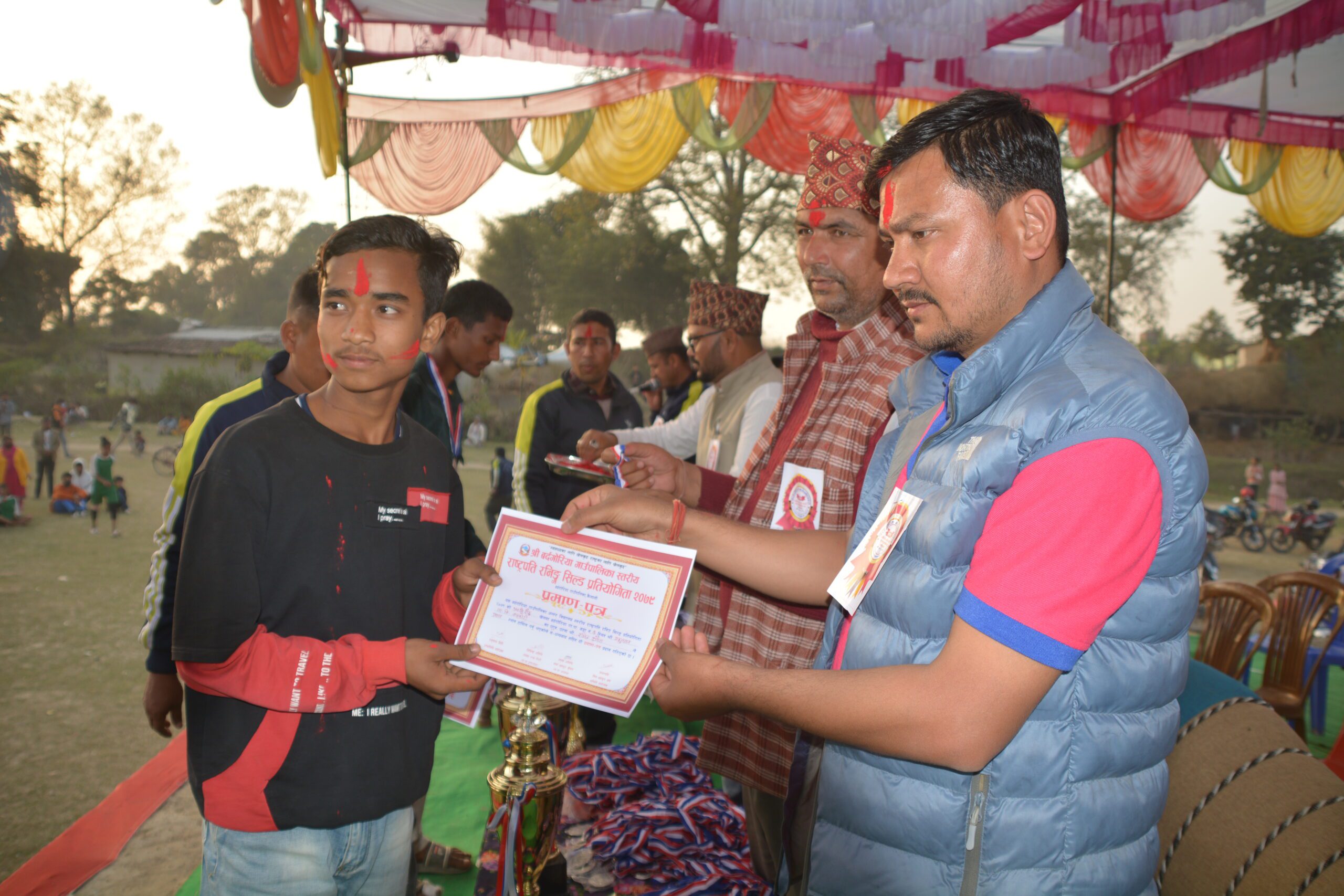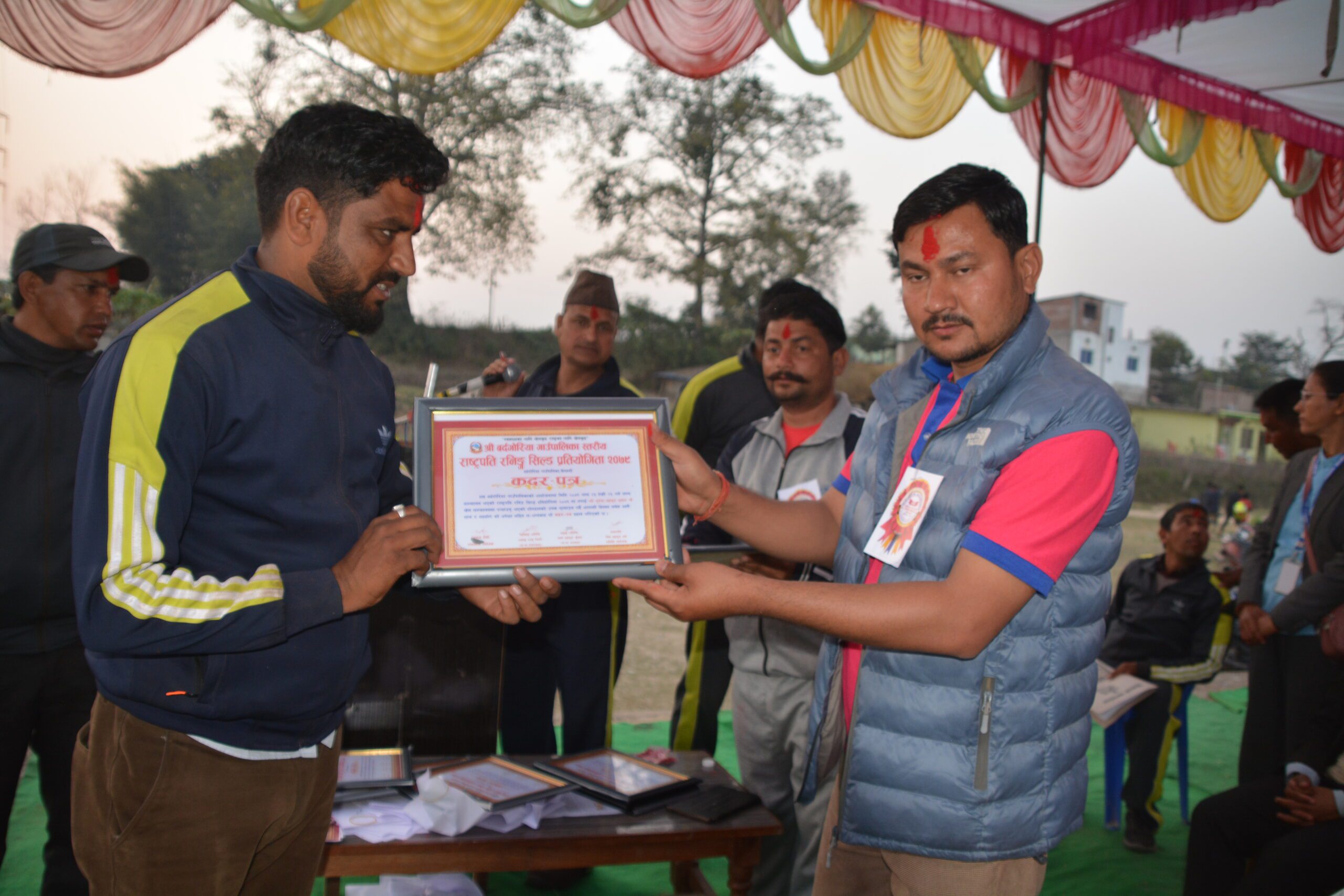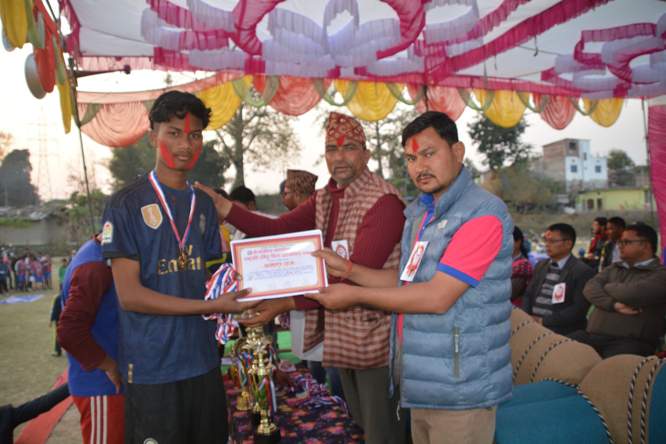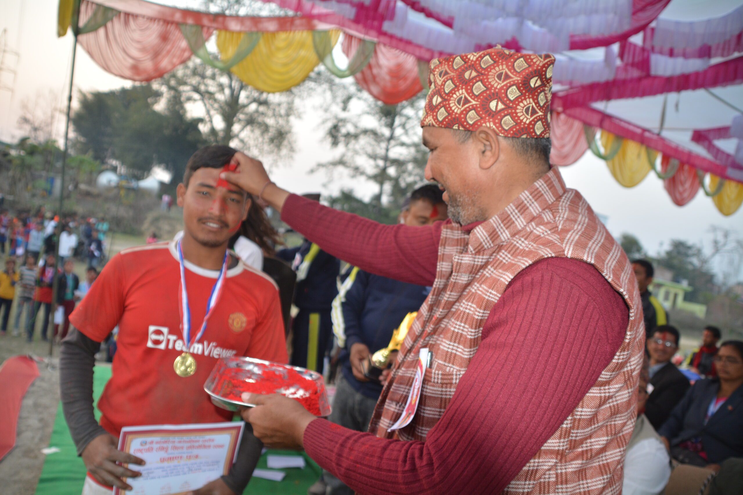 कैलाली । कैलालीको बर्दगोरिया गाउँपालिकामा गत मङ्गलवारबाट सुरु भएको पालिका स्तरीय राष्ट्रपति रनिङ्ग शिल्ड प्रतियोगिता सम्पन्न भएको छ । प्रतियोगितामा कक्षा ६ देखी १२ सम्मका १३ विद्यालयले भाग लिएका थिए । प्रतियोगिताका अधिकांश खेल विद्यालाई वसन्त मुरारी माध्यमिक विद्यालयले कब्जा गरेको छ । १० स्वर्ण, ७ रजत र २ कास्य सहित वसन्त मुरारी प्रथम हुँदा ५ स्वर्ण र ३ कास्य सहित नोबेल एकेडेमी दोस्रो बनेको छ । यस्तै ३ स्वर्ण, ८ रजत र २ कास्य सहित कालिका मा.वि. नौनिया तृतीय बनेको छ । प्रतियोगितामा मा.वि. कोटातुल्सीपुरले ३ स्वर्ण, ४ रजत र ७ कास्य हात पारेको छ । जगदम्बिके भगवती मा.वि. खैरेनीले ३ स्वर्ण, ४ रजत र ४ कास्य, महुन्याल मा.वि. बासकोटीले ३ स्वर्ण, २ रजत र ४ कास्य, बालकन्या मा.वि. कट्टीपुरले २ स्वर्ण, २ रजत र ७ कास्य र न्यु वालवाटीका मा.वि. बौनियाँले १ स्वर्ण, २ रजत र ३ कास्य हात पारेको छ । यस्तै द सनराईज मा.वि.बौनियाँले २ रजत र १ कास्य, आदर्श सामुदायिक मा.वि.ले १ कास्य, र माइकी मिडियमले १ कास्य प्राप्त गरेका छन् । प्रतियोगितामा १ सय, २ सय, ४ सय, ८ सय, १ हजार ५ सय र ३ हजार मिटर दौड, कबड्डी, १ सय मिटर र ४ सय मिटर रिले, भलिबल, हाई जम्प, लङ्ग जम्प, सट फुट, त्रिपल जम्प र ज्याइबलिन थ्रो गरी १५ विद्यामा खेल खेलाइएको थियो । जिल्ला स्तरमा हुने राष्ट्रपति रनिङ्ग शिल्डलाई मध्यनजर गरी सञ्चालन गरिएको यस प्रतियोगिताबाट खेलाडी तथा टिम समेट छनौट भएका छन् । हरेक खेल विद्याका प्रथम र द्धितिय हुने टिम तथा खेलाडी जिल्ला स्तरको प्रतियोगितामा सहभागी हुने छन् । यस अघि २०७६ मा जिल्ला स्तरमा भएको प्रतियोगितामा वसन्त मुरारी मा.वि.ले कबड्डी विद्यामा उपाधि हात पारेको थियो ।