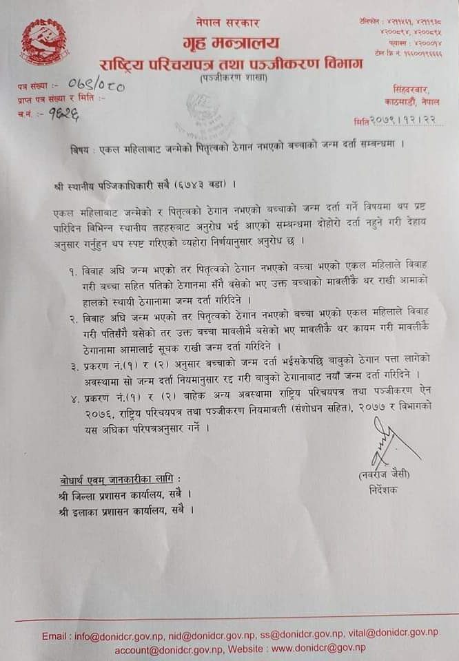 राष्ट्रिय परिचयपत्र तथा पञ्जीकरण विभागले स्थानीय तहका सबै ६ हजार ७४३ वटै वडा कार्यालयलाई परिपत्र गर्दै एकल महिलाबाट जन्मेका तथा पितृत्वको ठेगान नभएका बच्चाको मावलीकै थर राखेर जन्म दर्ता गर्न निर्देशन दिएको हो ।
