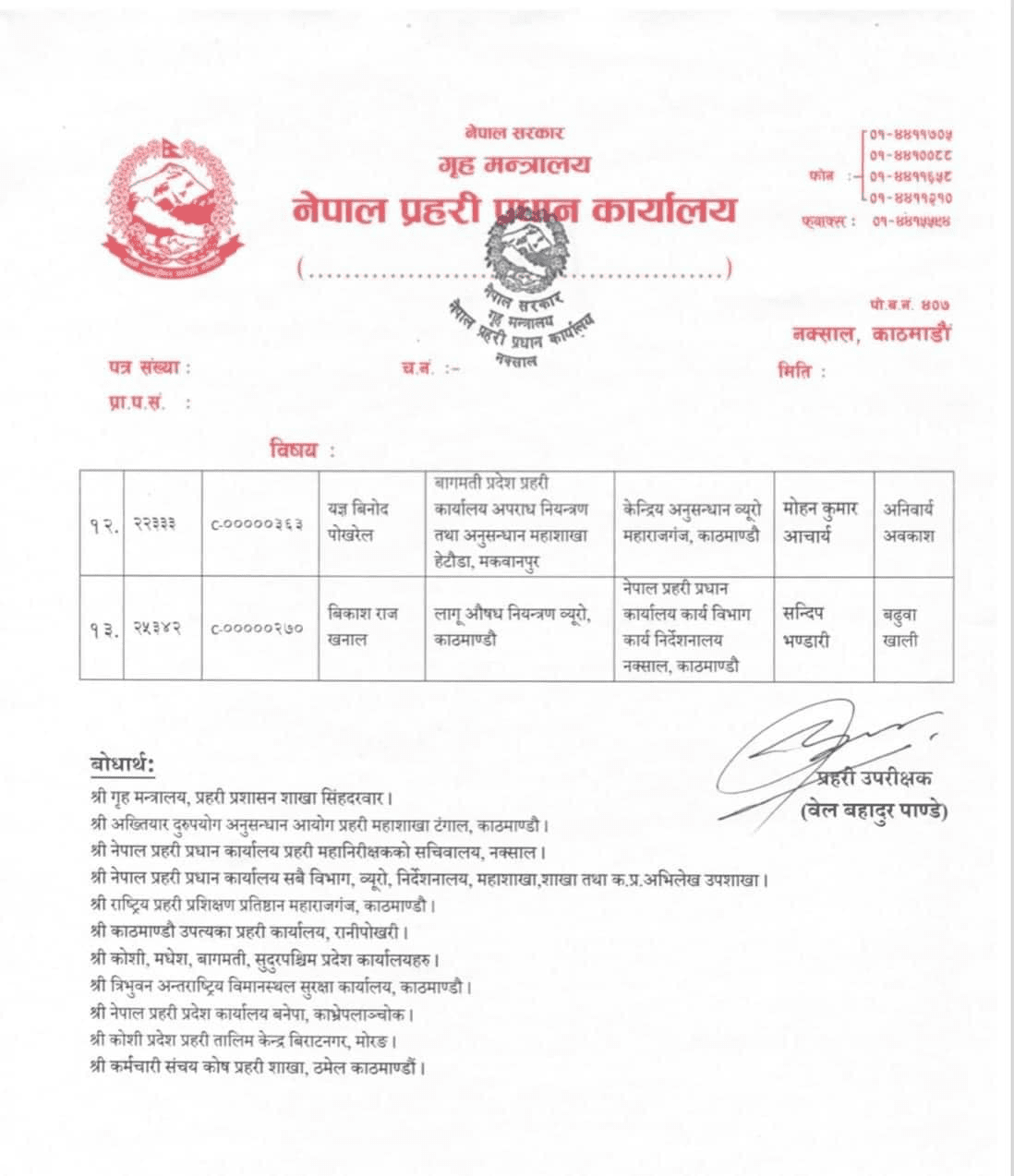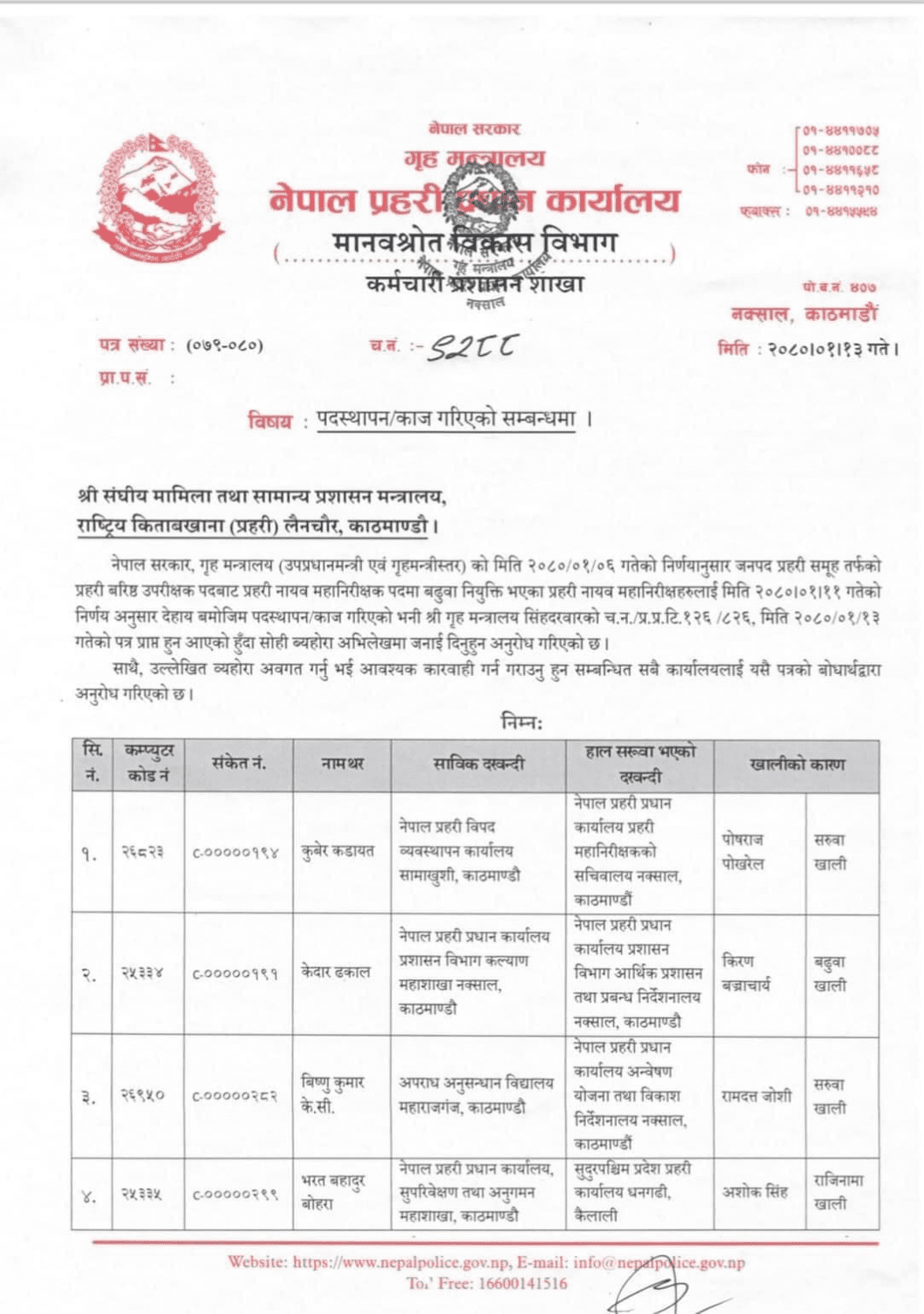 काठमाडौं, १३ वैशाख नेपाल प्रहरीका १३ डीआईजीको पदस्थापन गरिएको छ । वैशाख ६ गते बढुवा भएका डीआईजीलाई गृह मन्त्रालयले बुधबार पदस्थापन गरेको हो । तीन जना डीआईजीले प्रदेश प्रमुखको जिम्मा पाएका छन् । डीआईजी राजेशनाथ बास्तोला कोशी प्रदेश, जनक भट्टराई मधेश प्रदेश र भरतबहादुर बोहरा सूदुरपश्चिम प्रदेशमा पदस्थापन भएका हुन् । यस्तै सीआईबीमा यज्ञविनोद पोख्रेल, विमानस्थलमा अर्जुन चन्द ठकुरी र महानिरीक्षकको सचिवालयमा कुवेर कडायतले जिम्मेवारी पाएका छन् ।