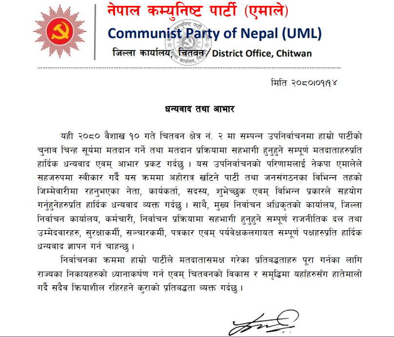 चितवन, १४ वैशाख चितवन-२ को उपनिर्वाचनबाट पराजित एमाले उम्मेद्वार राम न्यौपानेले मतदातालाई धन्यवाद दिएका छन् । एमाले जिल्ला अध्यक्षसमेत रहेका न्यौपानेले जिल्ला कमिटीमार्फत धन्यवाद सन्देश प्रेषित गरेका हुन् । न्यौपानेले सन्देशमा चितवन–२ को उपनिर्वाचनमा आफ्नो पार्टी एमालेको सूर्य चिन्हमा मतदान गर्ने सम्पूर्ण मतदातालाई धन्यवाद दिएका छन् । उपनिर्वाचनको परिणामलाई सहर्स स्वीकार गर्दै अहोरात्र खटिने पार्टी र जनसंगठनका विभिन्न तहका जिम्मेवारीमा रहेका नेता, कार्यकर्ता, सदस्य, सदस्य, शुभेच्छुक एवम् विभिन्न प्रकारले सहयोग गर्नेप्रति धन्यवाद व्यक्त गरेका हुन् । मुख्य निर्वाचन अधिकृतको कार्यालय, जिल्ला निर्वाचन कार्यालय, कर्मचारी, निर्वाचन प्रक्रियामा सहभागी हुने सबै राजनीतिक दल तथा उम्मेदवार, सुरक्षाकर्मी, सञ्चारकर्मी, पत्रकार एवम् पर्यवेक्षकलगायत सम्पूर्णप्रति उनले आभार व्यक्त गरेका छन् । न्यौपानेले निर्वाचनका क्रममा आफ्नो पार्टीले मतदाता समक्ष गरेका विभिन्न प्रतिवद्धता पूरा गर्नका लागि राज्यका निकायहरुको ध्यानाकर्षण गरेर चितवनको विकास र समृद्धिको लागि सबैसँग हातेमालो गर्दे सदैव क्रियाशिल रहने प्रतिवद्धता पनि व्यक्त गरेका छन् ।