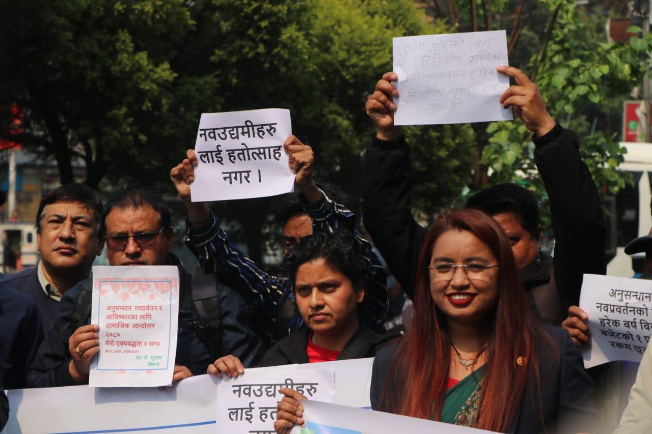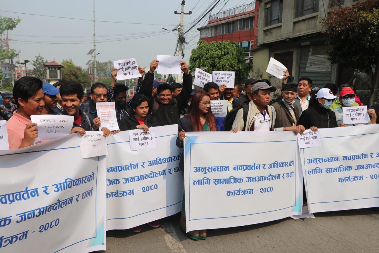 काठमाडौं, १५ वैशाख । राष्ट्रिय आविष्कार केन्द्रका संस्थापक महावीर पुनले विभिन्न माग राखेर आन्दोलन सुरु गरेका छन् । कुल बजेटको २ प्रतिशत अनुसन्धानमा खर्च गर्नुपर्ने, नवउद्यमीहरुलाई हतोत्साह गर्न नहुने,जस्ता माग राखेर पुनले शुक्रबार माइतीघर मण्डलामा प्रदर्शन गरेका हुन् । उनलाई युवाहरुले साथ दिएका छन् । बिहीबार नै सामाजिक सञ्जालमा आन्दोलनका नारा सार्वजनिक गरेका पुनले शुक्रबार आफ्ना समर्थकसहित प्लेकार्ड बोकेर प्रदर्शन गरेका हुन् ।  अनुसन्धान, नवप्रवर्तन र आविष्कारका निमित्त सरकार गम्भीर नभएको पुनको आरोप छ । नवप्रवर्तन अनुसन्धान र आविष्कार कोष खडा गर्नुपर्ने माग गरेका पुनले यसअघि प्रधानमन्त्रीसहितको ध्यानाकर्षण गराएका थिए ।
