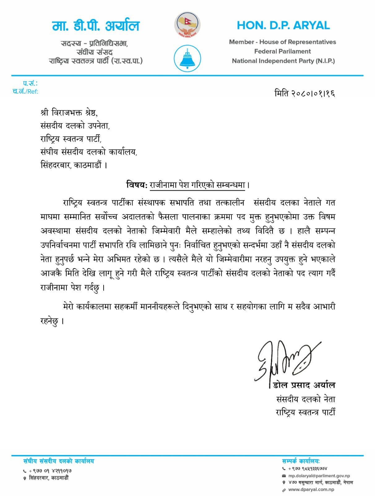काठमाडौं, १७ वैशाख राष्ट्रिय स्वतन्त्र पार्टीका संसदीय दलका नेताबाट उपसभापति डोलप्रसाद अर्यालले राजीनामा दिएका छन् । शनिबार बसेको संसदीय दलको बैठकमा उनले संसदीय दलका उपनेता विराजभक्त श्रेष्ठसमक्ष राजीनामा बुझाएका हुन् । राजीनामा बुझाएसँगै स्वीकृत गर्ने प्रक्रियामा छ । अहिले उपनेता श्रेष्ठले उक्त जिम्मेवारी सम्हालेका छन् । यस्तै, पार्टी सभापति रवि लामिछाने संसदीय दलको नेता बन्दैछन् । संसदीय दलको बैठक सोमबार बस्ने तयारी छ । बैठकले लामिछानेलाई दलको नेता चयन गर्नेछ ।