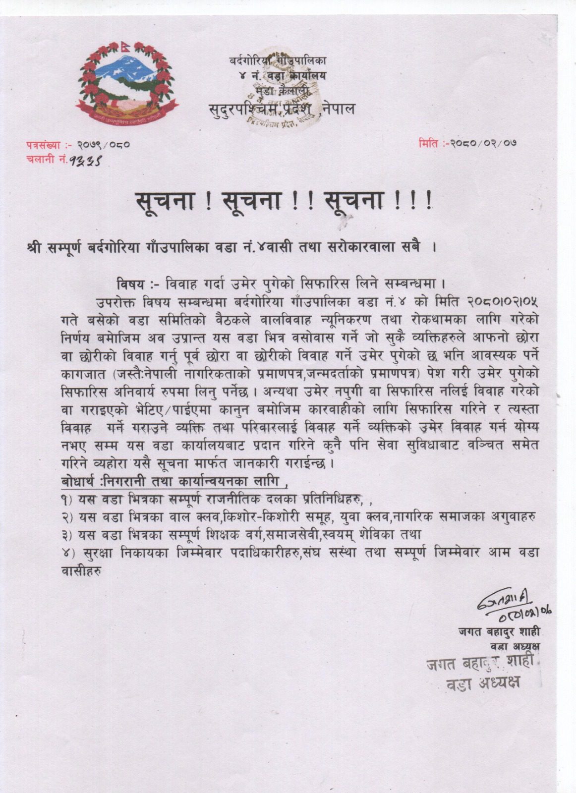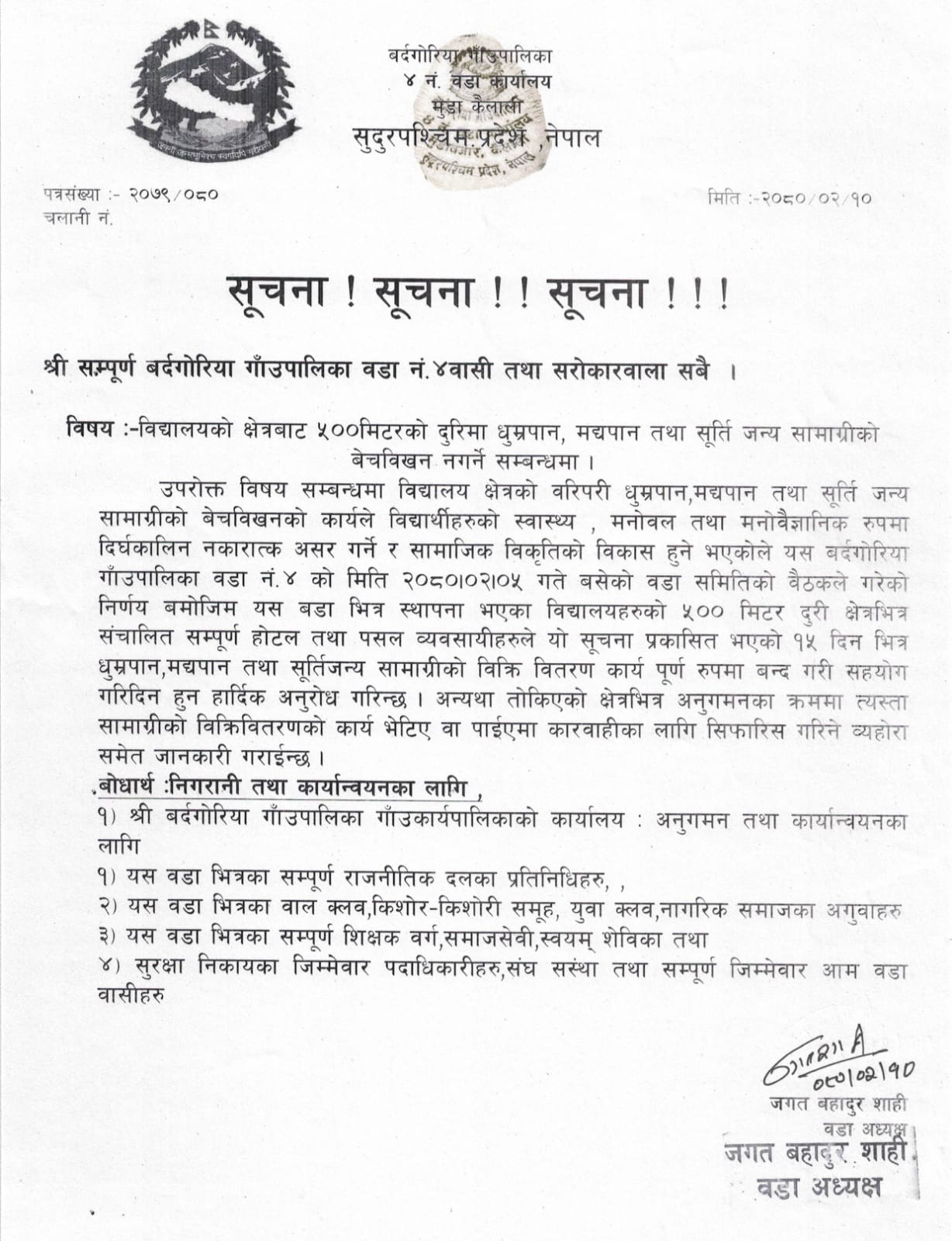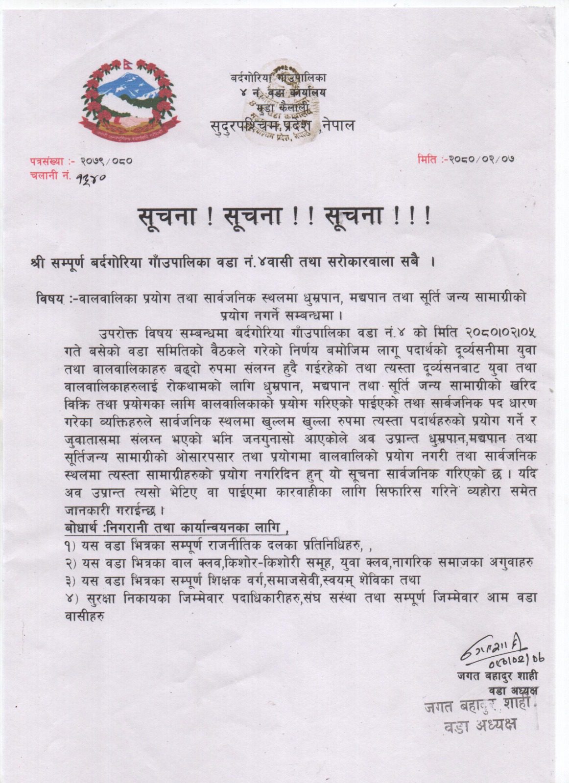 केही दिन अघि बालविवाह र सार्बजनिक स्थलमा धुम्रपान सुर्तीजन्य र मादक पदार्थ समन्धित सूचना वडा कार्यालयले निकालेको थियो । वडा अध्यक्ष र वडा सदस्य गाउँ टोलमा जनतालाई सम्झाउन जाँदा विद्यालय र विभिन्न संघ संस्थाका नजिक सुर्तीजन्य र मादक पदार्थका पसलको विषयमा चर्को आवाज उठे पछि यो सूचना निकालेको वडा अध्यक्ष शाहीले बताउनुभयो ।