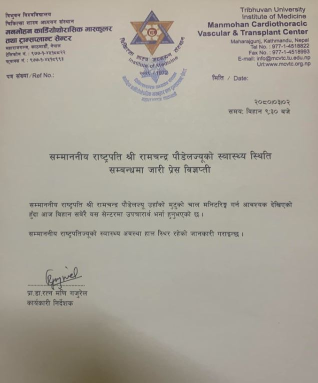 मनमोहन कार्डियोथेरासिक भास्कुलर तथा ट्रान्सप्लान्ट सेन्टर कार्यकारी निर्देशक प्रा.डा.रत्नमणी अधिकारीका अनुसार उनको मुटुको चालको मनिटरिङ गरिएको छ । ‘सम्मानीय राष्ट्रपति श्री रामचन्द्र पौडेलज्युको मुटुको चाल मनिटरिङ गर्न आवाश्यक देखिएको हुदाँ आज बिहान सबैरै यस सेन्टरमा उपचरार्थ भर्ना हुनु भएको छ,’ अस्पतालद्धारा जारी बिज्ञप्तिमा भनिएको छ ‘सम्मानीय राष्ट्रपतिज्यूको स्वास्थ्य अवस्था हाल स्थिर रहेको जानकारी गराईन्छ ।’