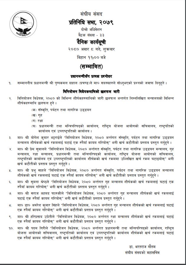 सो बैठकमा बिनियोजन बिद्येयक २०८० को बिभिन्न शिर्षकहरु माथीको छलफल अन्तर्गत चारवटा मन्त्रालयससहितको बजेट शिर्षक माथी छलफल हुनेछ । जसअनुसार संस्कृति, पर्यटन, तथा नागरिक उडडयन मन्त्रालय, गृह मन्त्रालय, रक्षा मन्त्रालयसहित प्रधानमन्त्री तथा मन्त्री परिषदको कार्यालय, राष्ट्रिय योजना आयोगको सचिवालयले, राष्ट्रपति कार्यालय एवं उपराष्ट्रपतिको कार्यालयका बजेट शिर्षक माथी छलफल हुन लागेकाे हाे । यसैगरी, सो बैठकमा ७ जना सांसदले खर्च कटौतीको प्रस्ताव गर्नेछन् ।