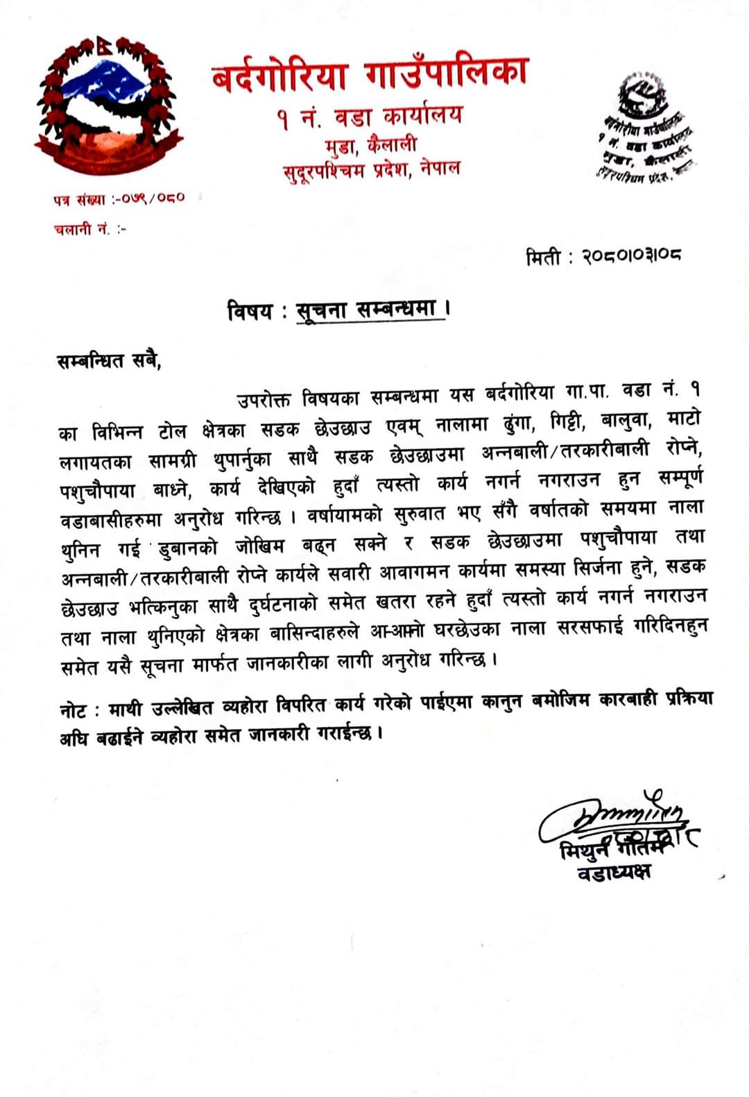 कैलाली । कैलालीको बर्दगोरिया गाउपालिका वडा नम्बर १ ले रोडको छेउछाउमा गाई गोरु तथा जथा भावी सामान न राख्न निर्देशन गरेको छ ।