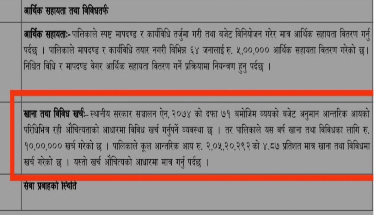 कैलाली । कैलालीको बर्दगोरिया गाउँपालिकाले गत आर्थिक वर्ष २०७८/०७९ मा खाना तथा विविध तर्फ दश लाख खर्च गरेको छ । पालिकाको कुल आन्तरिक आय २ करोड ५ लाख २० हजार २ सय ९२ को ४.८७ प्रतिशत रकम खाना तथा विविधमा खर्च गरेको महालेखा परीक्षकको प्रतिवेदनमा उल्लेख गरिएको छ ।