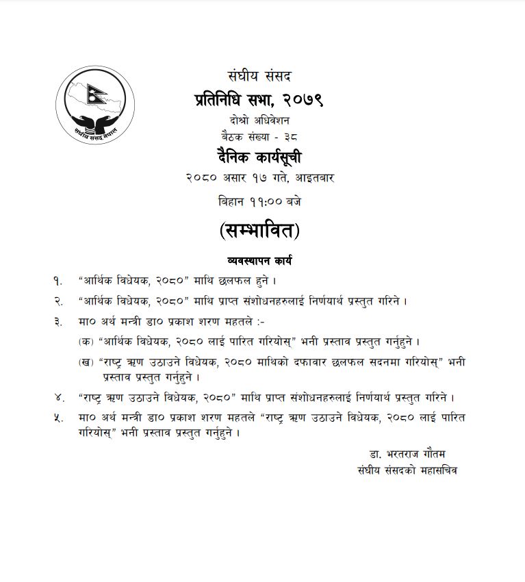 काठमाडौं, १७ असार । प्रतिनिधिसभा बैठक बस्दैँछ । संघीय संसद भवन, नयाँ वानेश्वरमा उक्त बैठक बस्न लागेको हो । बैठक ११ बजे बिहान बोलाईएको छ । आजको बैठकमा आर्थिक बिद्येयक २०८० माथी छलफल हुनेछ भने सो बिद्येयक माथी प्राप्त संसोधनहरुलाई निर्णयार्थ प्रस्तुत गरिनेछ ।संघीय संसद सचिवालयले सार्वजनिक गरेको सम्भावित कार्यसुची अनुसार अर्थमन्त्री प्रकाशशरण महतले आर्थिक बिद्येयक २०८० पारित गरियोस भन्ने प्रस्ताव प्रस्तुत गर्दै राष्ट्र ऋण उठाउने बिद्येयक २०८० माथीको दफावार छलफल सदनमा गरियोस भन्ने प्रस्ताव प्रस्तुत गर्नेछन् । सो राष्ट ऋण उठाउने बिद्येयक २०८० माथी प्राप्त संसोधनहरुलाई निणयार्थ प्रस्तुत गरिनेछ भने सो बिद्येयक पारित गरियोस भन्ने प्रस्ताव पेश हुने संघीय संसद सचिवालयका महासचिव भरतराज गौतमले सार्वजनिक गरेको सम्भावित कार्यसुचीमा उल्लेख छ ।