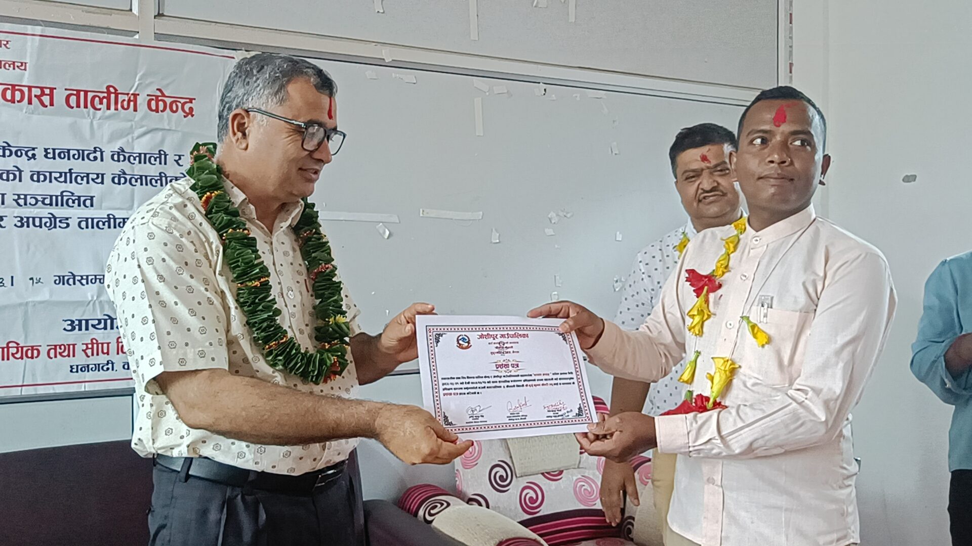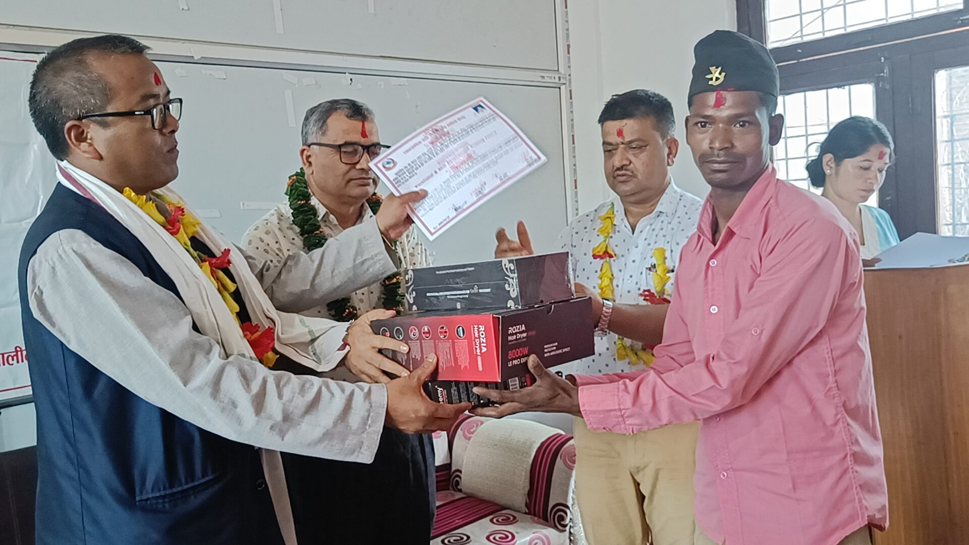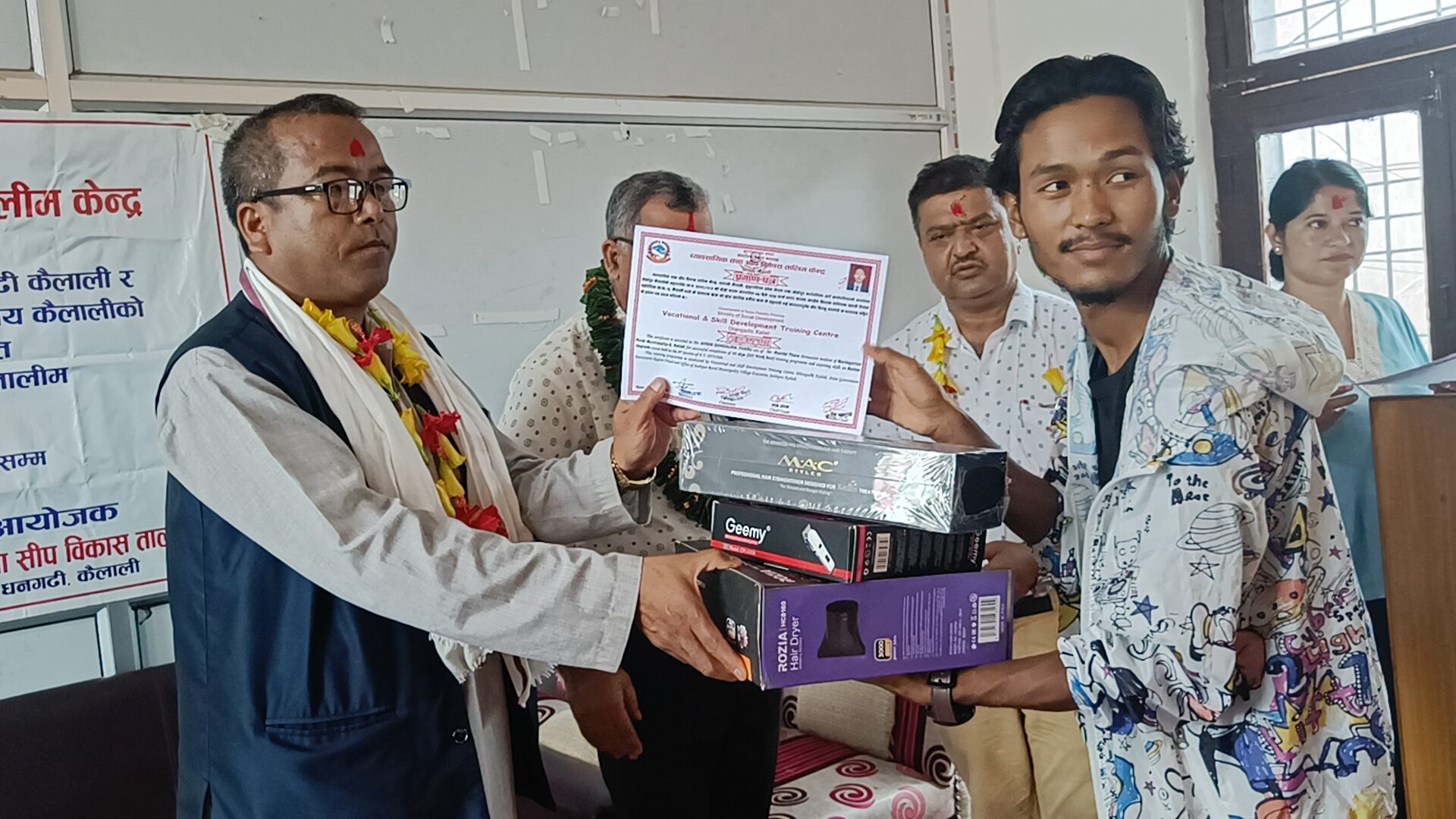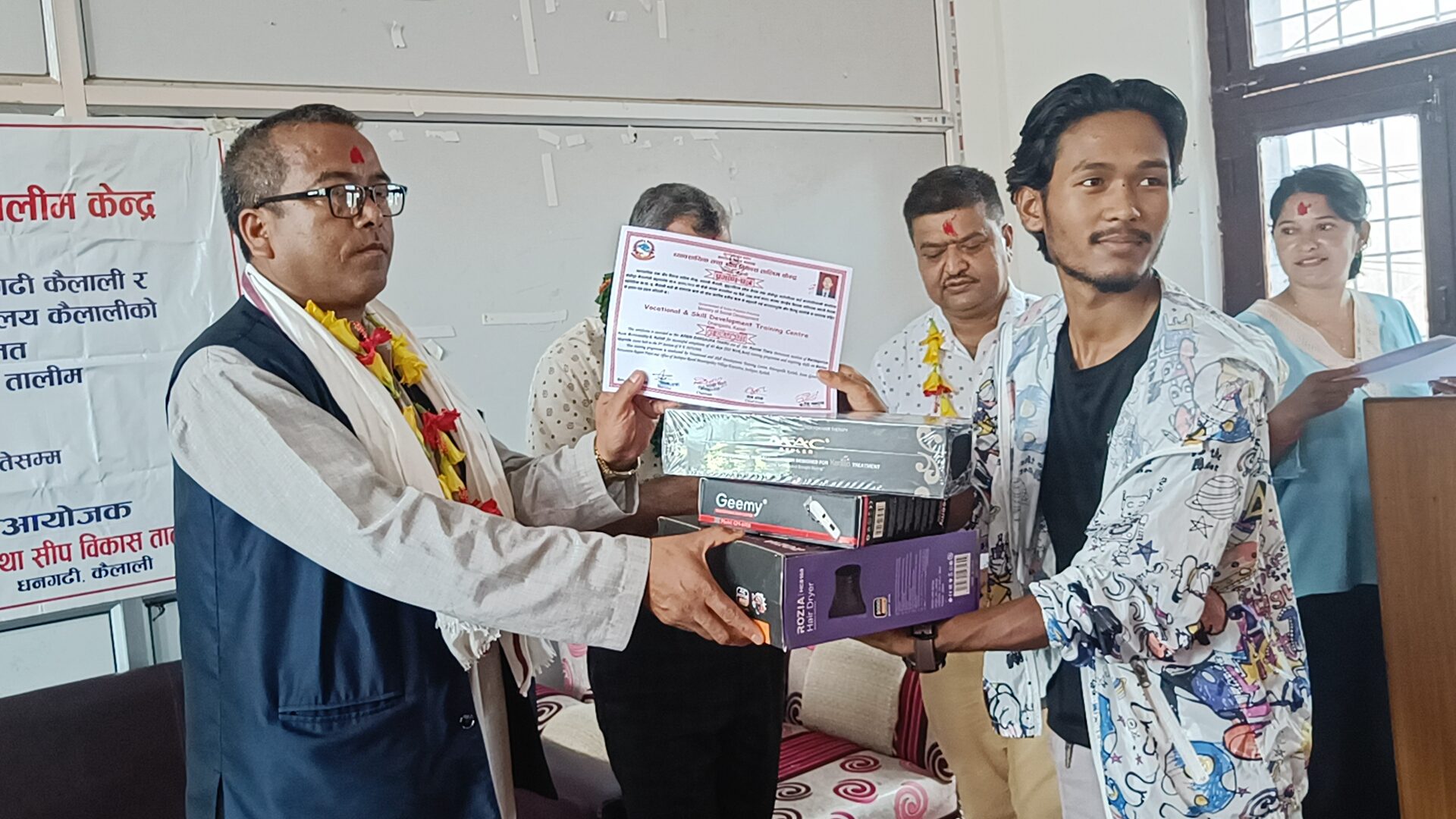 कैलाली । कैलालीको जोशीपुर गाउँपालिकामा संचालित ४५ दिने कपाल काट्ने तालिम सम्पन्न भएको छ । बेरोजगार युवाहरुलाई स्वरोजगार बनाउन सकिन्छ भन्ने उद्देश्यले जोशीपुर गाउँपालिका र व्यवसायीक सीप विकास केन्द्र धनगढी, कैलालीको साझेदारीमा संचालित तालिमको बुधबार समापन गरिएको छ ।