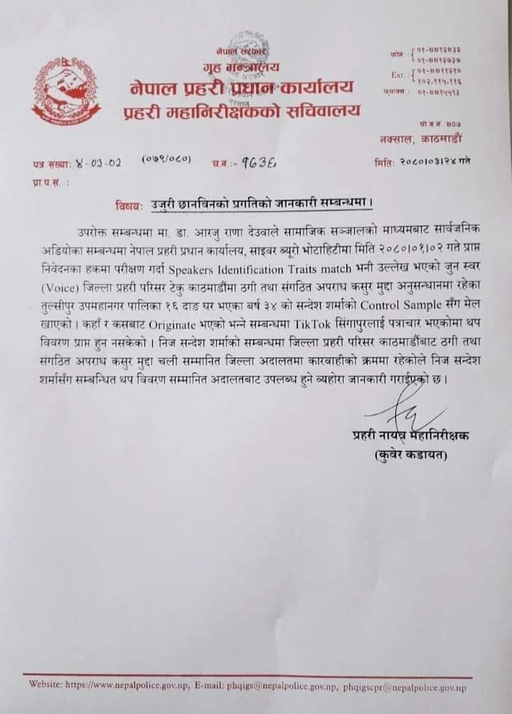 वैशाख २ गते आफ्नो नाम जोडिएपछि आरजु राणाले साइबर ब्युरोमा दिएको उजुरीको आधारमा गरिएको परीक्षणमा सन्देश शर्माको आवाज भएको दाबी गरेको प्रहरीले उक्त अडियो अडियो कहाँबाट र कसरी तयार भयो भन्ने सन्दर्भमा टिकटक सिंगापुरलाई पत्राचार गरेको भए पनि थप विवरण नआएको जनाएको छ । उक्त अडियोमा आरजुलाई पनि पैसा दिइएको सन्देशले बोलेका छन् । तर, यसलाई आरजुले खण्डन गर्दै आफूले यसबारे जानकारी नै नभएको बताउँदै आएकी छन् । नक्कली भुटानी शरणार्थी प्रकरणमा सन्देश पुर्पक्षका लागि थुनामा छन् । उनीविरुद्ध गठी तथा संगठित अपराध असुरमा मुद्दा चलाइएको छ ।