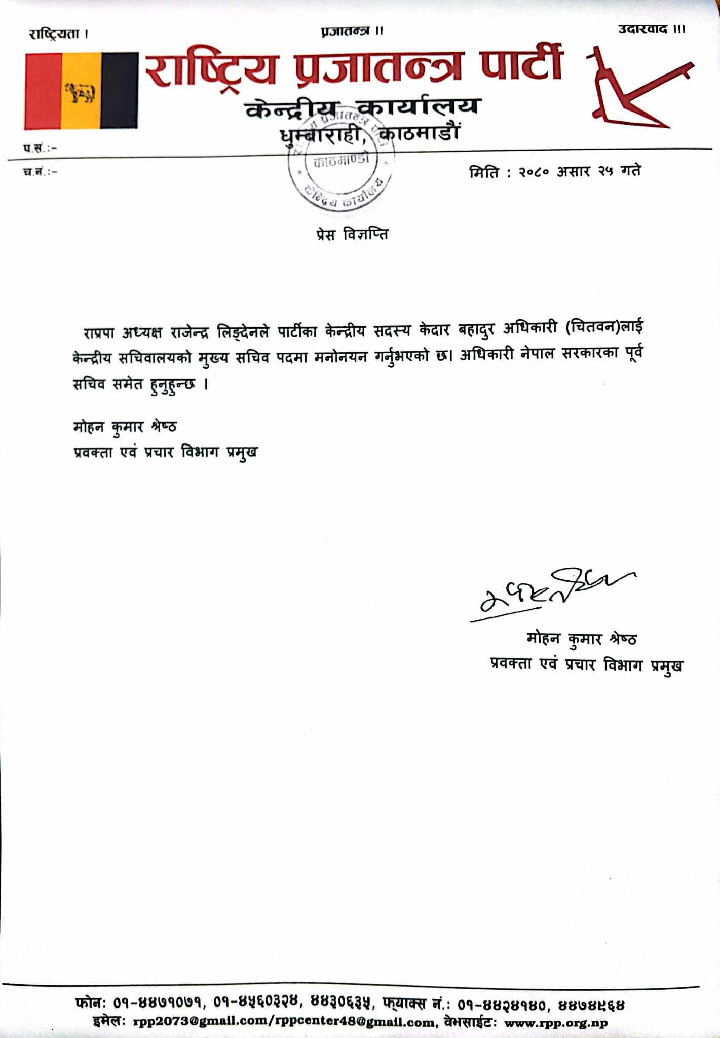 काठमाडौं, २५ असार । राप्रपाको केन्द्रीय सचिवालयका मुख्यसचिवमा केन्द्रीय सदस्य केदारबहादुर अधिकारीलाई मनोनीत गरिएको छ । अध्यक्ष राजेन्द्र लिङ्देनले सदस्य अधिकारीलाई केन्द्रीय सचिवालयको मुख्यसचिव पदमा मनोनीत गरेको राप्रपा प्रवक्ता तथा प्रचार विभाग प्रमुख मोहन श्रेष्ठले जानकारी दिए । अधिकारी नेपाल सरकारका पूर्वसचिव समेत हुन् ।