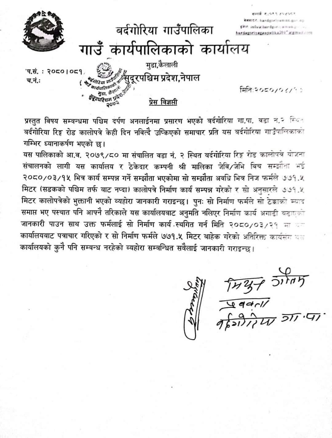 कैलाली। कैलालीको बर्दगोरिया गाउँपालिकामा गरिएको कालोपत्रे उप्के पछि गाउँ सरकार एक्सनमा उत्रिएको छ । आफू खुसी कमसल काम गरेर गाउँ सरकारको बदनाम गराएको भन्दै गाउँपालिकाले कारबाही प्रक्रियामा जाने बताएको छ ।