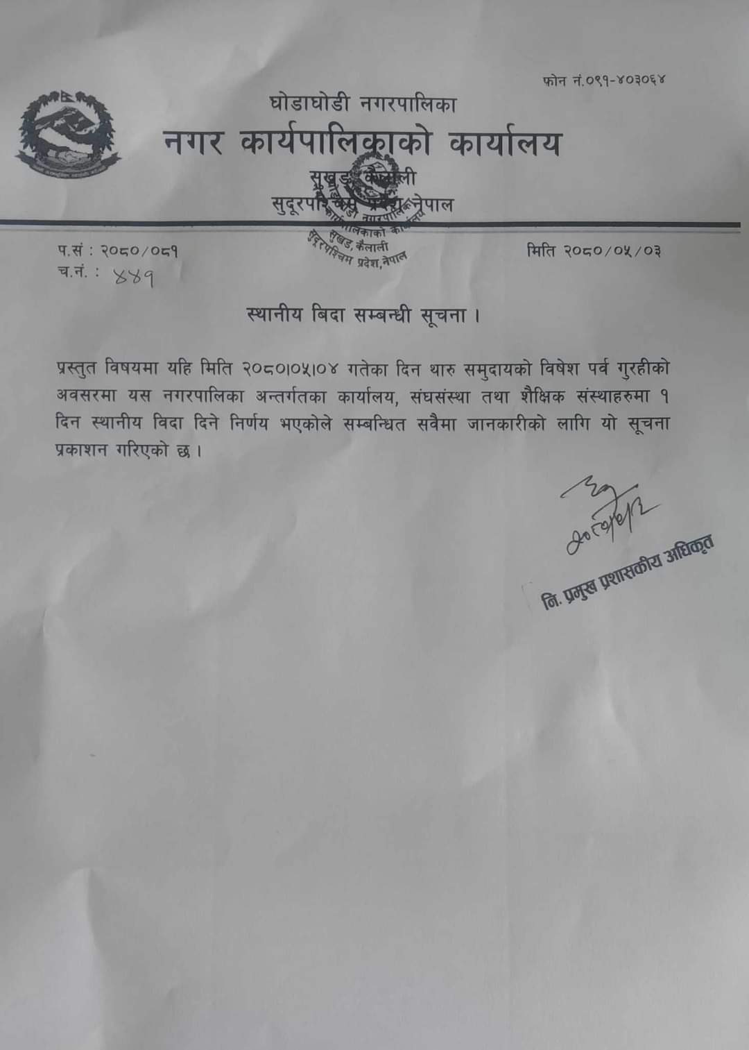 कैलाली। कैलाली जिल्लाको घोडाघोडी नगरपालिकाले गुरही पवको अवसरमा भदौ ४ गते सार्वजनिक विदा दिने निर्णय गरेको छ ।