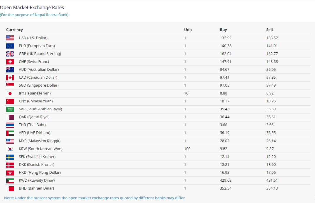 बेलायती पाउण्ड एकको खरिद दर १६१ रुपैयाँ ४ पैसा र बिक्री दर १६२ रुपैयाँ ७७ पैसाले भाउँ पाउँदा क्यानेडियन डलर १ को खरिददर ९७ रूपैयाँ ९२ पैसा तथा बिक्रीदर ९७ रूपैयाँ ९६ पैसा तथा अष्ट्रेलियन डलर १ को खरिद दर ८४ रूपैयाँ ५२ पैसा तथा बिक्री दर ८४ रूपैयाँ ९१ पैसा कायम गरिएको छ । कतारी रियालको मूल्य एकको खरिद दर ३६ रुपैयाँ ४४ पैसा र बिक्री दर ३६ रुपैयाँ ६१ पैसा रहेको जनाएको राष्ट्र बैंकले साउदी रियाल १ को ३५ रूपैयाँ ४४ पैसा तथा बिक्री दर ३५ रूपैयाँ ६० पैसा कायम गरिएको छ ।