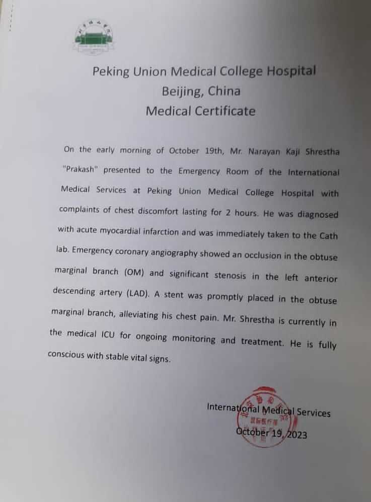 काठमाडौं, २ कात्तिक। उपप्रधानमन्त्री एवम् गृहमन्त्री नारायणकाजी श्रेष्ठको स्वास्थ्य अवस्थाबारे ‘पेकिंग युनियन मेडिकल कलेज अस्पताल, बेइजिङ’ले बिहीबार दिउँसो ‘मेडिकल सर्टिफिकेट’ जारी गरेको छ।श्रेष्ठलाई ‘एक्युट मायोकार्डियल इन्फेक्शन’ भएको र आकस्मिक कोरोनरी एन्जियोग्राफी गर्दा ‘ओब्टस मार्जिनल शाखामा अवरोध देखिएको अस्पतालले जनाएको छ। उनकाे मुटुको बायाँ धमनीमा महत्त्वपूर्ण ‘स्टेनोसिस’ देखिएको र त्यसलाई कम गर्न तुरुन्तै ‘स्टेन्ट’ राखिएको समेत अस्पतालले जनाएको छ।