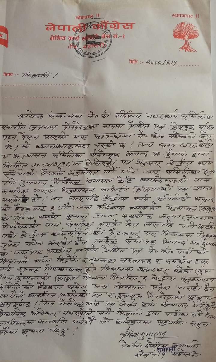 कारवाही फुकुवा पछी पुर्बबत पदको जिम्मेवारी समाल्ने खुसीमा आसन्न चाडपर्वको शुभकामना कार्यक्रम ३ असोजमा राखेतापनी क्षेत्र न.१ काङ्ग्रेसले उक्त कार्यक्रममा सहभागी नहुन निर्देशन दिएकाे थियाे । पुर्व नगर सभापति रहेका युवराज पोखरेलले पाटीको नाममा काटेको पत्र पुर्णरुपमा अबैधानिक रहेको बताउदै क्षेत्रीय सभापति महेश झाले भ्रमपुर्ण पत्रको पछाडी नलाग्न आफ्ना कार्यकर्ताहरुलाई निर्देशन गरेका हुन् ।