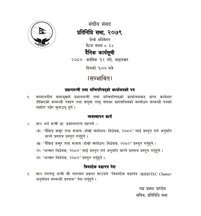 काठमाडौं । प्रतिनिधिसभाको बैठक बस्दै छ । सङ्घीय संसद् भवन नयाँ बानेश्वरमा उक्त बैठक बस्ने छ । बैठक दिउँसो १ बजेका लागि बोलाईएको छ । संघीय संसद सचिवालयले सार्बजनिक गरेको सम्भावित कार्यसुची अनुसार सभामुख देवराज घिमिरेले प्रधानमन्त्री तथा मन्त्रिपरिषद्को कार्यालयबाट प्राप्त कार्यभार तोकिएको सम्बन्धी पत्रहरू तथा संयुक्त राष्ट्रसङ्घका महासचिवको सम्बोधन सम्बन्धी पत्रको ब्यहोरा पढेर सुनाउने छन्  । सचिवालयका अनुसार आइतवारको बैठकमा अर्थमन्त्री  प्रकाशशरण महतले बैङ्किङ कसुर तथा सजाय (दोस्रो संशोधन) विधेयक, २०८० र भन्सार विधेयक, २०८० प्रस्तुत गर्नेछन् भने परराष्ट्र मन्त्री नारायण प्रकाश साउदले विमस्टेक वडापत्र अनुमोदनसम्बन्धी प्रस्ताव पेस गर्नेछन् ।