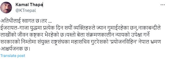 ‘अतिथीलाई स्वागत छ तर…’ भन्दै महासचिव गुटरेसले हमास–इजरायल युद्धमा ध्यान नदिएको उनको आरोप रहेको छ । ‘ईजरायल–गाजा युद्धमा प्रत्येक दिन सयौं व्यक्तिहरुले ज्यान गुमाईरहेका छन्, नाकाबन्दीले लाखौंको जीवन कष्टकर भैरहेको छ,’ थापाले भनेका छन्, ‘यस्तो बेला संक्रमणकालीन न्यायको उपेक्षा गर्ने सरकारको निम्तोमा संयुक्त राष्ट्रसंघका महासचिव गुटरेसको ‘प्रयोजन विहिन’ नेपाल भ्रमण आश्चर्यजनक छ।’ महासचिव गुटेरेसले आज देखी नै राष्ट्रपति रामचन्द्र पौडेल, प्रधानमन्त्री पुष्पकमल दाहाल प्रचण्ड, नेकपा एमालेका अध्यक्ष केपी शर्मा ओली, नेपाली कांग्रेसका सभापति शेरबहादुर देउवालगायतसँग भेटबार्ता गर्दैछन्  । चार दिने नेपाल भ्रमणको क्रममा दुई दिन नाम्चे, पोखरा, अन्नपुर्ण बेस क्याम्प, लुम्बिनी पुग्ने महासचिव गुटेरेसले मंगलबार भने संघीय संसदको संयुक्त बैठकलाई सम्बोधन गर्ने कार्यक्रम रहेको छ ।