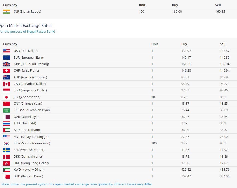 बेलायती पाउण्ड एकको खरिद दर १६१ रुपैयाँ ३१ पैसा र बिक्री दर १६२ रुपैयाँ ०४ पैसाले भाउ पाउँदा अष्ट्रेलियन डलर एकको खरिद दर ८४ रूपैयाँ ३१ पैसा तथा बिक्री दर ८४ रूपैयाँ ६९ पैसा तथा क्यानेडियन डलर ९५ रूपैयाँ ७९ पैसा तथा बिक्री दर ९६ रूपैयाँ २२ पैसामा कारोबार गर्न सकिनेछ ।