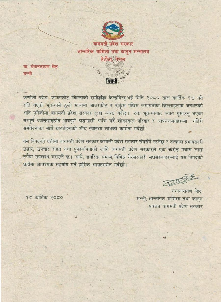 विपद्को यस घडीमा बागमती प्रदेश सरकार कर्णाली प्रदेश सरकार सँगसँगै रहने जनाउँदै बागमती प्रदेश सरकारले भूकम्पबाट ज्यान गुमाएकाप्रति भावपूर्ण श्रद्धाञ्जलीका साथै शोकाकुल परिवार र आफन्तजनहरुमा गहिरो समवेदना पनि प्रकट गरेको छ । घाइतेहरुको शीघ्र स्वास्थ्य लाभको कामना समेत सो प्रदेशले गरेको छ ।