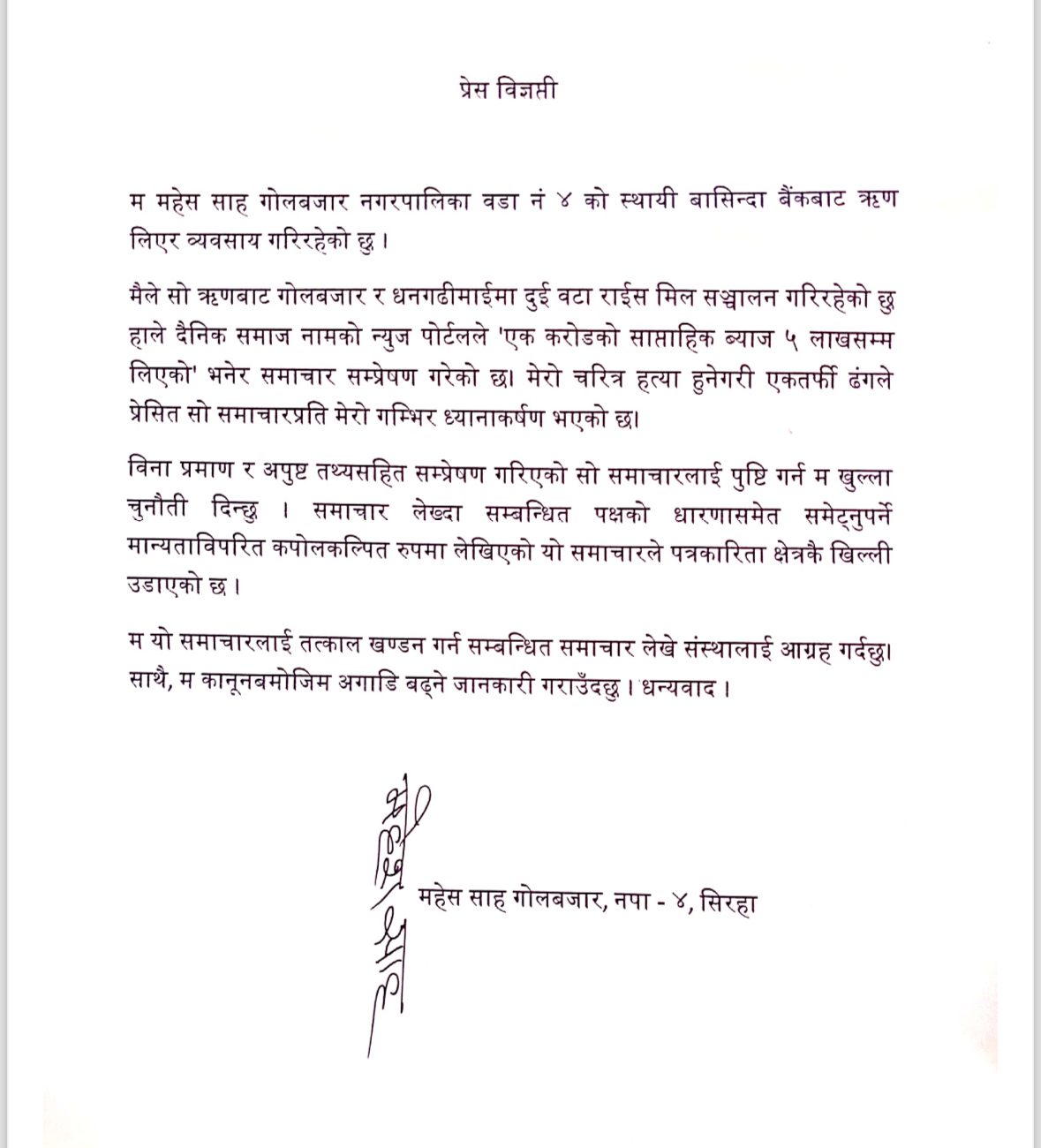 व्यसायी साहले जारी गरेको विज्ञप्तिमा लेखिएकाे छ, ‘मैले बैंकबाट लिएको ऋणबाट गोलजबार र धनगढीमाईमा दुईवटा राईस मिल सञ्चालन गरिरहेको छु, बैकबाट ऋण लिएर व्यसाय गरिरहेको अवस्थामा मेरो चरित्र हत्या हुनेगरी एकतर्फी ढंगले प्रेसित सो समाचारप्रति मेरो गम्भीर ध्यानाकषर्ण भएको छ । विना प्रमाण र अपुष्ट तथ्यहिन सम्प्रेशण गरिएको सो समाचारलाई पुष्टि गर्न म खुल्ला चुनौती दिन्छु। समाचार लेख्दा सम्बन्धित पक्षको धारणासमेत समेट्नुपर्ने मान्यताविपरित कपोकलल्पित रुपमा लेखिएको यो समाचारले पत्रकारिता क्षेत्रकै खिल्ली उडाएको छ।’