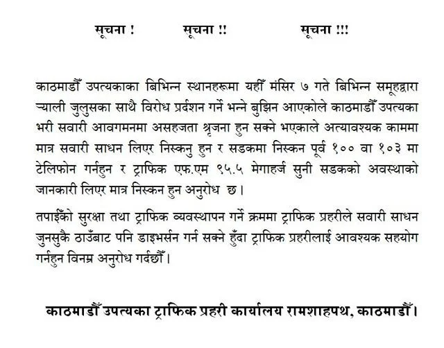 काठमाडौं । आज हुने प्रदर्शनका कारण काठमाडौंको ट्राफिक अस्तब्यस्त हुने भएको छ । जसका कारण काठमाडौँ उपत्यका ट्राफिक प्रहरी कार्यालयले आज अर्थात बिहीबार अत्यावश्यक काममा मात्र सवारी साधन लिएर निस्कन सर्वसाधारणलाई अनुरोध गरेको छ । मङ्सिर ७ गते काठमाडौँ उपत्यकाका विभिन्न स्थानहरूमा नेकपा एमाले निकट युवा संघ नेपाल र मेडिकल ब्यावसायी दुर्गा प्रसाईको समुहले र्‍याली र जुलुसका साथै विरोध प्रदर्शन गर्ने भएकाले काठमाडौँ उपत्यका भरी सवारी आवागमनमा असहजता सिर्जना हुन सक्ने ट्राफिक कार्यालयले जनाएको छ । ट्राफिक प्रहरीले सडकमा निस्कन पूर्व १०० वा १०३ मा टेलिफोन गर्न  र ट्राफिक एफ.एम ९५.५ मेगाहर्ज सुनी सडकको अवस्थाको जानकारी लिएर मात्र निस्कन अनुरोध गरेको छ ।  ट्राफिक व्यवस्थापन गर्ने क्रममा ट्राफिक प्रहरीले सवारी साधन जुनसुकै ठाउँबाट पनि डाइभर्सन गर्न सक्ने हुँदा ट्राफिक प्रहरीलाई आवश्यक सहयोग गर्न पनि अनुरोध गरिएको छ ।